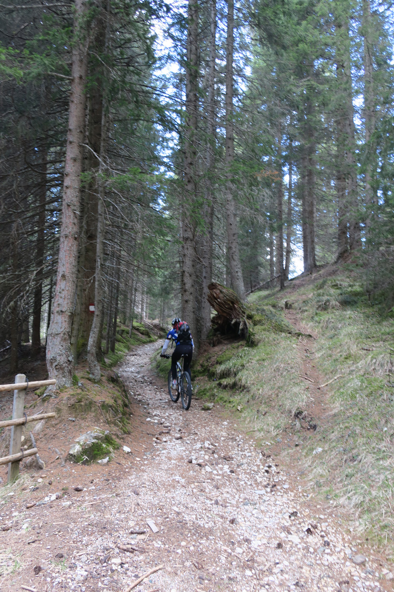 Heute Morgen gab es für uns um 7Uhr ein sehr gutes Frühstück. Danach ging es Los. Nach dem Aufstieg durch das Dorf Truden folgte schon eine knackige Abfahrt hinunter nach Kaltenbrunn, wo wir noch ein Stück auf dem Bahntrasse der ehemaligen Fleinstalbahn fahren konnten. Aber bald begann dann der Aufstieg über Radein zun Jochgrimm auf 1989m. Etwa um 10Uhr war dann dieser auf 1989m liegende Pass geschafft. Der Weg war bereits komplett Schneefrei. Auf schönen Pisten ging es dann über Obereggen, den Karrersee und den Nigerpass nach St. Zyprian bei Tiers wo wir dann ein ausführliches Mittagsessen genossen. Nach dem Essen folgten wir weiter der Trans Tirol Bike Route zum Völsegger Bild. Etwa um 14.30Uhr merkte mein Kollege dass die Nabe seines Hinterrades total ausgeleiert war. Wir entschlossen uns die Route abzuändern und statt Richtung Brixen nach Bozen hinunter zu fahren. Gleich bei der Einfahrt nach Bozen hatten wir ein Volltreffer von einem guten Fahrradgeschäft. Es gab alles wünschenswerte zu Kaufen, sogar ein neues und passendes Hinterrad. Wir waren sehr dankbar und konnten nach 16Uhr unseren Trip wieder fortsetzten. Nach der schönen Altstadt ging es zuerst sanft und danach extrem steil durch die Rebberge nach Glanig. Ab hier ging es noch moderat Steil hinauf zur Saltener Hochebene. Auf 1527m beim Gasthaus Langfenn war dann um 18.45Uhr Feierabend. Hier oben, gleich neben der Wallfahrtskirche hat man einen wunderbaren Ausblick auf die umliegenden Berge und Täler.
