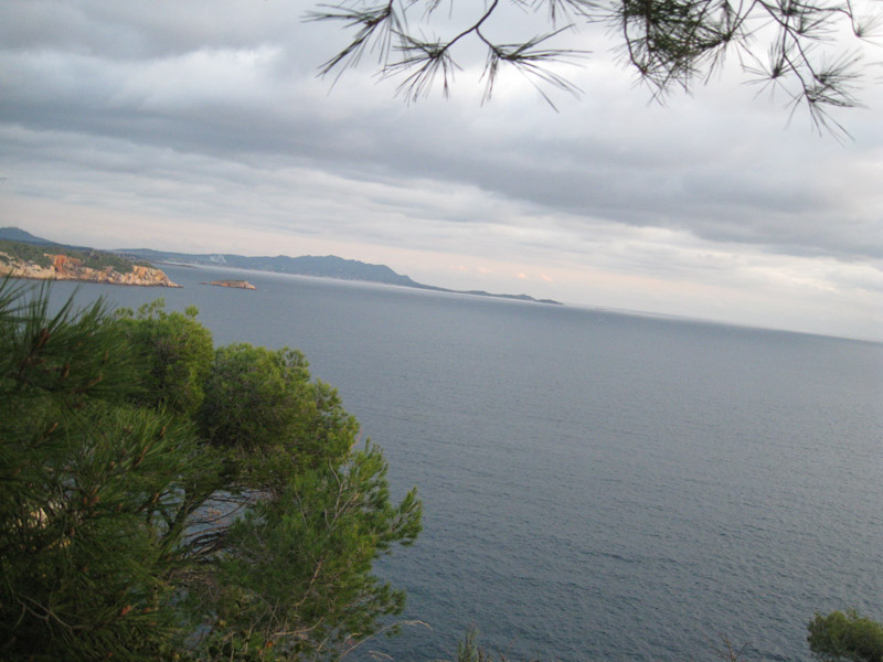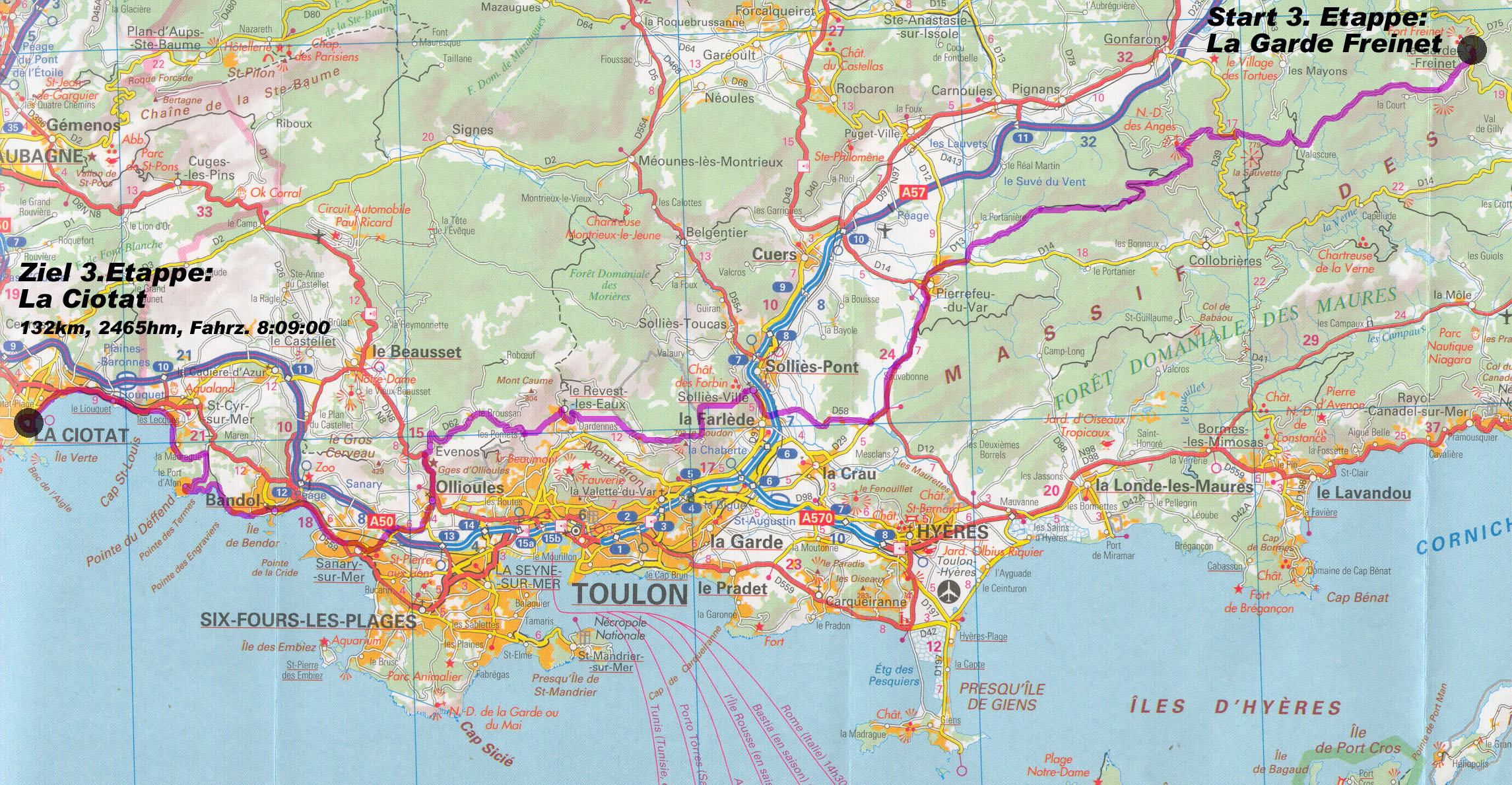 Um 6.30 Uhr war heute Tagwache. Anschließend bekamen wir in der Hausbar noch unser einbegriffenes Frühstück. Obwohl in Frankreich schon seit 2 Jahren absolutes Rauchverbot in Kneipen und Bars herrscht wurde da frisch fröhlich drauflos geschlotet. C' est trés Triste!!! Nun um 8 Uhr machten wir uns auf den Weg. Der Himmel war noch Wolkenverhangen. Über Forststrassen und Trails gelangten wir gegen Mittag nach Sollies. Dort gab's ein kleine Stärkung und dann machten wir uns auf Richtung Le Revest les Eaux. Leider lag eine Millitärzone dazwischen. Diese war eingezäunt und von scharfen Hunden bewacht. Ein durchkommen ohne riskieren des Lebens war also nicht möglich. Also versuchten wir unser Glück auf einem Trail am Rande der Millitärzone. Der größte Teil war sogar fahrbar bis auf das letzte Stück wo es dermaßen viel glitschige Gesteinsbrocken hatte das sogar das Wandern sehr mühsam war. Nun gegen 14Uhr haben wir dann Le Revest les Eaux erreicht. Da das Gelände relativ Felsig und nicht so super zum Biken aussah nahmen wir dann die Strasse über Evenos, Sanary sur Mer zum Nobelort Bandol. Von dort ging es wieder Bikemässig weiter auf dem Sentier du Littoral direkt an der Küste bis es eindunkelte. Anfänglich war der Küstentrail ganz Passabel, mit der Zeit wurde er dann immer weniger fahrbar so dass wir uns illegal durch eine Villensiedlung wieder auf die Strasse verschoben. Nach ca. 30min im Dunkeln hatten wir dann in La Ciotat ein mäßig gutes Hotel gefunden.