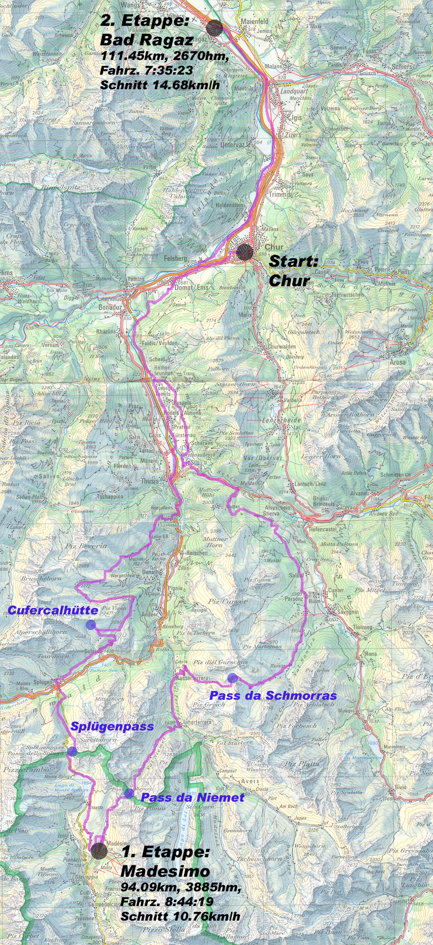 Cufercalhütte- Alp Anarosa- Summapunt- Viamala- Thusis- Bad Ragaz 111km, 2670hm