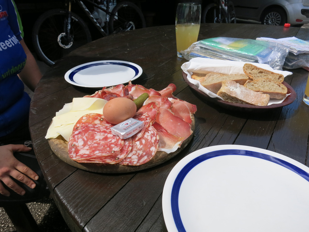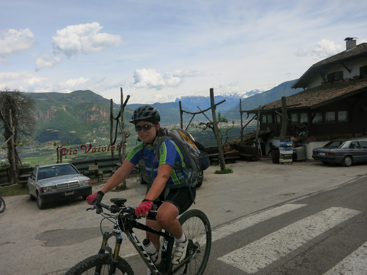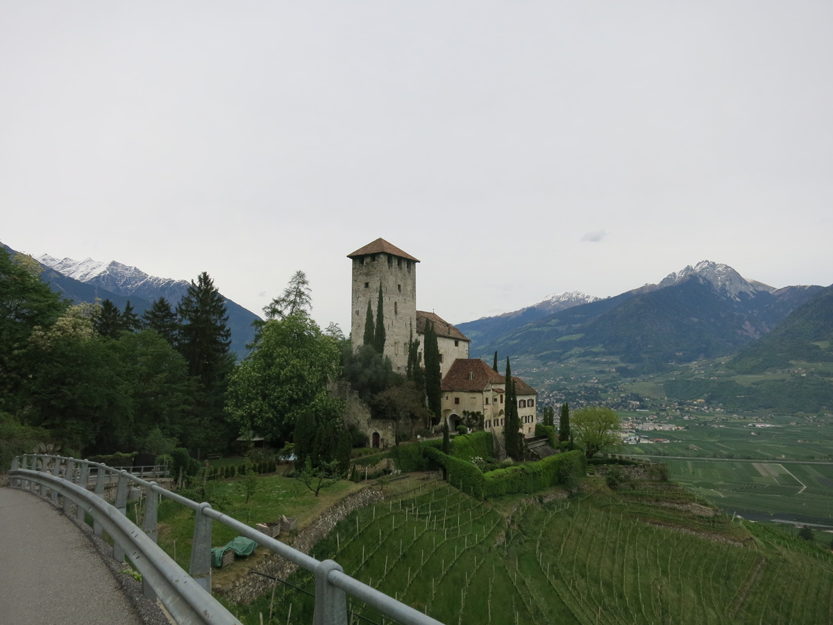 Heute Morgen ging es bei uns um 8.45Uhr los. Nach einem kurzen Flachstück bis Faver folgte eine relativ steile Strasse hinauf zum Prati di Monte. Dort oben folgten wir dann mehr oder weniger dem E5 Fernwanderweg nach Gfrill. Bei schönstem Wetter ging es hier über den Gfriller Sattel und dann hinunter über Gschon und Pinzon nach Auer. Es gab dabei ein paar tolle Trailpartien und noch ein Stück Bahntrasse. Bei Auer überquerten wir dann den Etsch und radelten dem Kalterer See entlang nach St. Michael Eppan. Dort ging es dann durch eine traumhafte Landschaft mit vielen Schlössern zum Kreideturm Hocheppan. Bei der Jausestation Ebner machten wir dann Mittagspause. Danach folgte ein schöner Trail hinunter nach Andrian. In Andrian ging es dann gleich wieder Aufwärts nach Obersirmian und zur Wallfahrtskirche St. Jakob oberhalb von Grissian. Über Tisens fuhren wir dann nach Lana hinunter. Hier suchten wir noch einen Laden auf und danach fuhr ich noch einen Zusatzaufstieg Richtung St. Martin von knapp 1000hm Aufstieg, während Marianne auf dem direktesten Weg nach Rabland fuhr. In Rabland nahmen wir dann das Beste 4****Hotel wo es ein großes Abendessen gab.