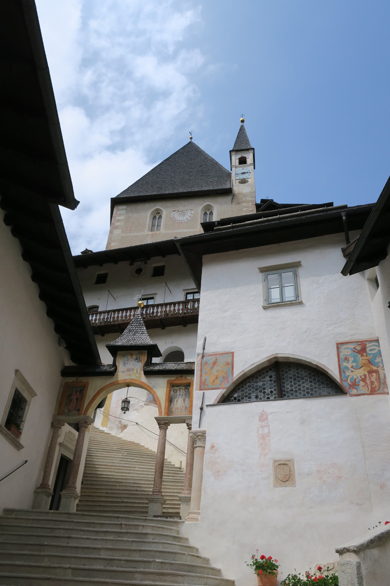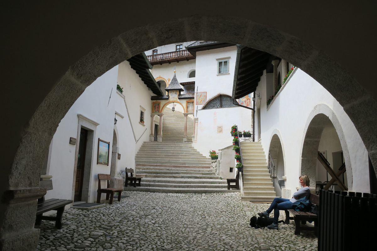 Heute gab es für uns in Refugio Ghedina um 7Uhr ein ganz einfaches Morgenessen. Danach radelten wir hinauf zum Passo del Gotro auf knapp 1900m. Vom Pass gab es einen tollen Trail hinunter zum Lago di Val d' Agola. Für den restlichen Aufstieg nach Madonna di Campiglio wählten wir die schöne Variante über den Cascata di Mezzo Wasserfall. Die Skistation Madonna di Campiglio selbst machte einen eher trostlosen Eindruck. Auf einem schönen Bikeweg ging es dann hinunter nach Malè. Dort kauften wir kurz Proviant und nahmen dann den Jakobsweg nach Cis. Von Cis bis Casez in Valle de Non, ging es in stetigem auf und ab fast eine Stunde lang mehrheitlich der Strasse entlang. Etwas außerhalb dieser Ortschaft begann dann der Felsenweg zum Santuario San Romedio. Er war sehr spektakulär und für uns ein grosses Highlight. Auch das Santuario selbst mit dem Bärengehege war ein Besuch wert. Zum Abschluss des Tages ging es auf einer steilen Strasse zur Malga Sfruz und dann noch auf den 2116m hohen Monte Roen. Die Aussicht war gigantisch. Die Abfahrt zum Mendelpass war dann ein Hochgenuss. Kurz vor 19.30Uhr nahmen wir dann oberhalb von Eppan in einem guten Hotel ein Zimmer mit guter Halbpension.