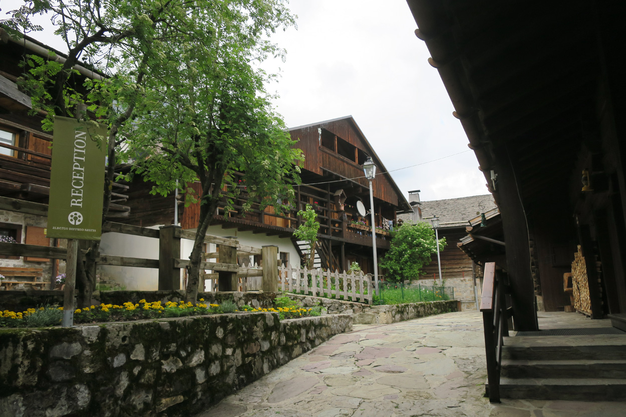 Reception mit Restaurant und Laden des Albergo Diffuso von Costalta