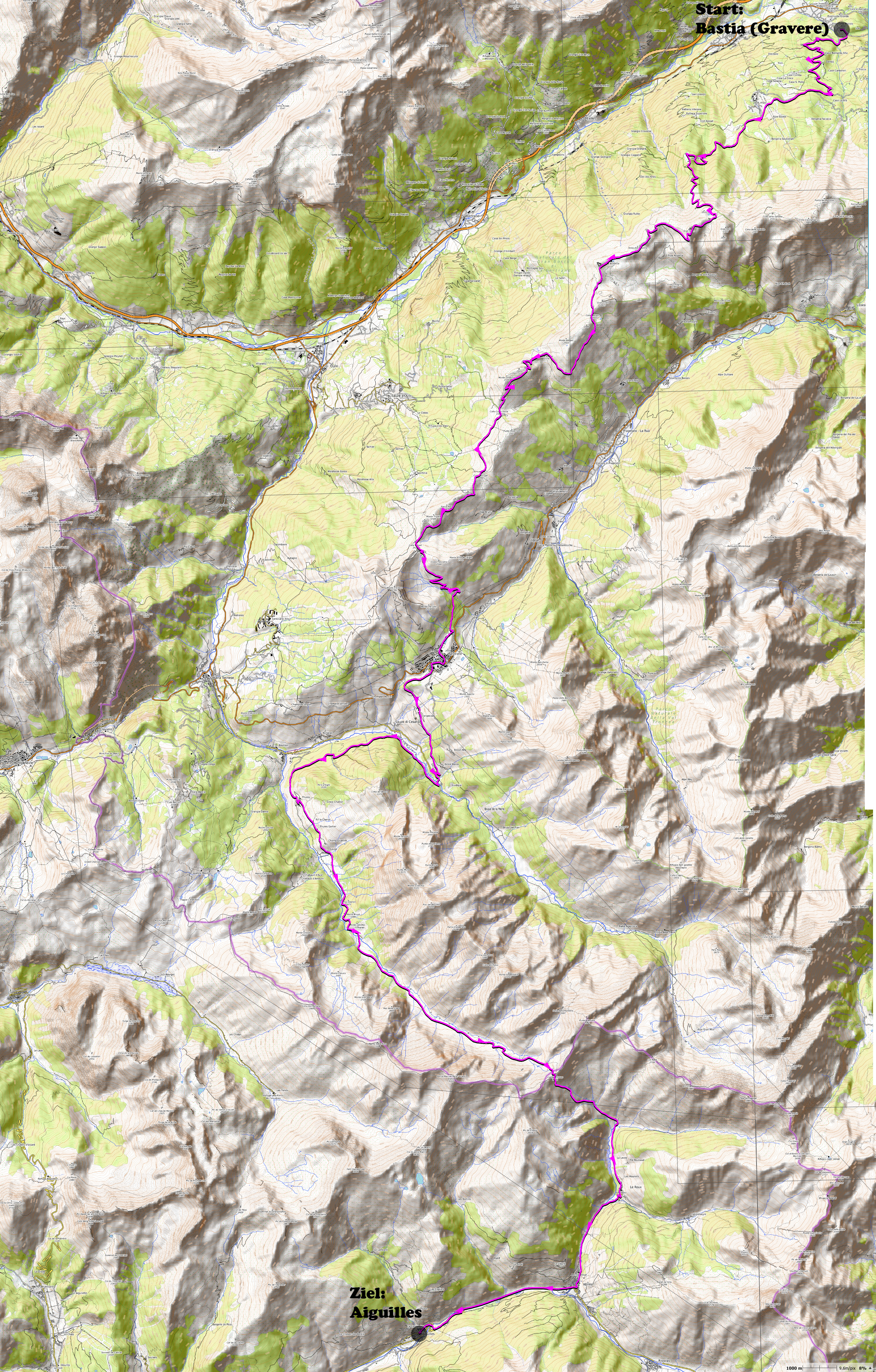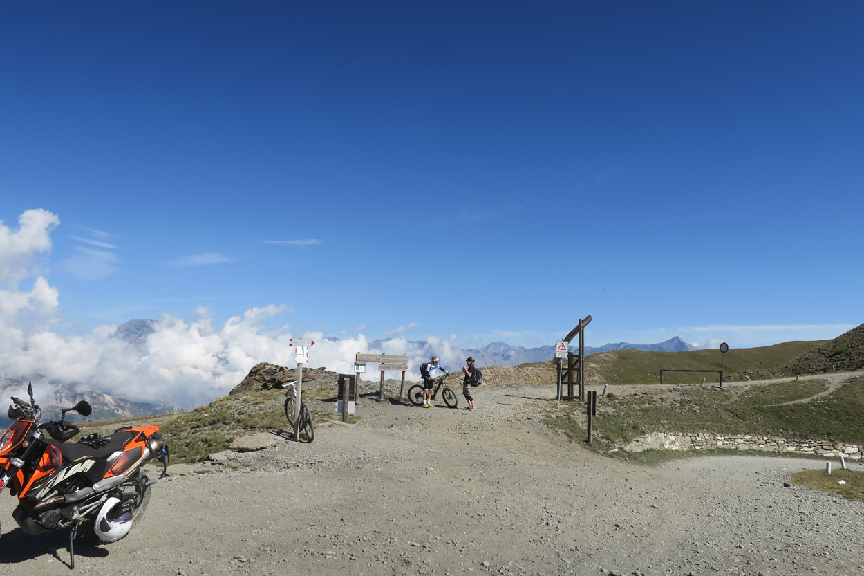 Heute Morgen gab es um 7.30Uhr das Morgenessen. Um 8.20Uhr ging es dann los mit dem Aufstieg zur Assiettastrasse. Um 11.15Uhr erreichte ich dann die Gran Serin Festung auf 2600m. Nun ging es die nächsten 2 Stunden auf dieser schönen Höhenstrasse nach Sestriere. Leider Tummelten sich hier auch etliche Töffahrer und Geländewagen auf dieser Schotter-Sandpiste. Um 13.15Uhr erreichte ich dann die Retortensiedlung Sestriere. Dort ging es dann ein Stück auf der Teerstraße hinunter in Richtung Sauze di Cesana. Hier gab es dann einen schönen Trail nach Thures. Im schönen Rifugio von Thures kehrte ich dann um 14Uhr ein. Danach nahm ich den Anstieg zum Col des Thures in Angriff. Bis auf knapp 2600m ü M konnte ich alles auf dieser Militärpiste Fahren. In den Restlichen 200hm zum 2795m hohen Pass musste ich dann das meiste Laufen (Ca. 20min). Um 17.30Uhr hatte ich dann auf der Passhöhe Frankreich erreicht. Hier gab es nun eine lange Trailabfahrt von knapp 1000Höhenmetern. Etwa 200Höhenmeter musste ich dabei Laufen (ca.10min). Um 18.30Uhr hatte ich dann die Ortschaft Abries erreicht. Da es hier im Hotel erst ab 8Uhr das Morgenessen gab, entschied ich mich in die nächste Ortschaft Aiguilles zu fahren. Dort fand ich dann auch ein passendes Hotel.