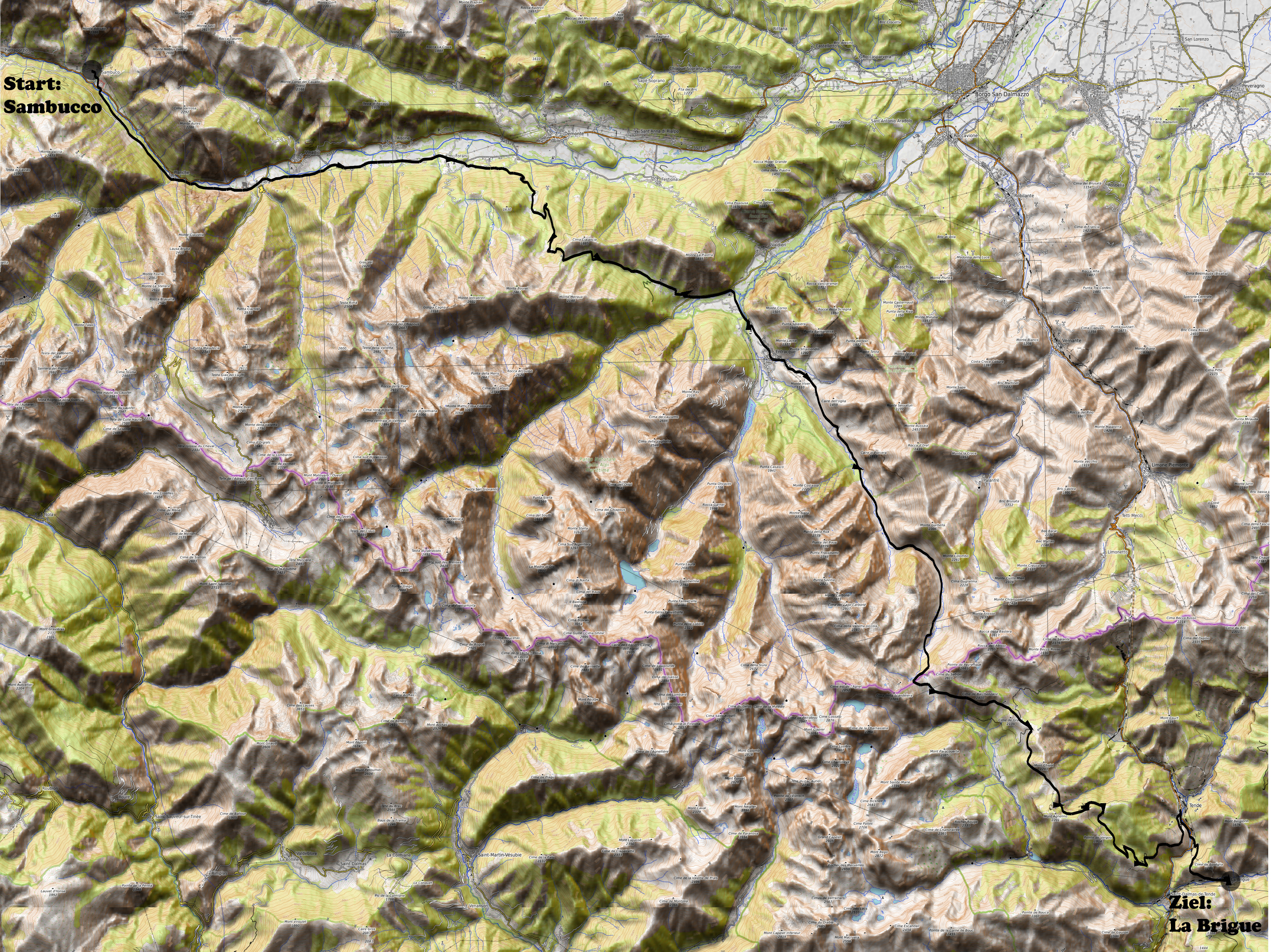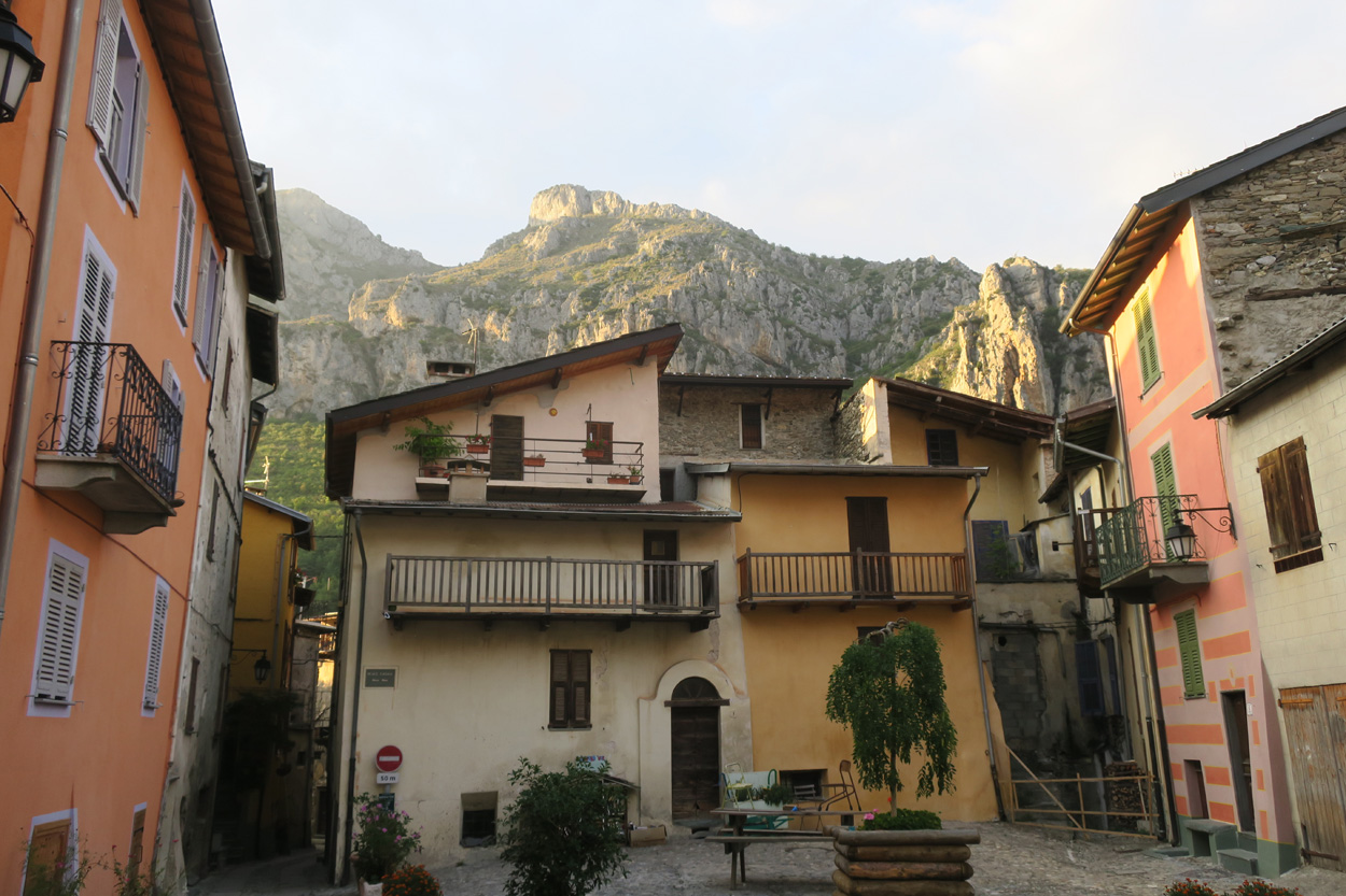 Heute Morgen schaffte ich es um 7.30Uhr ans wunderbare Frühstücksbüffet des Hotels La Pace. Ab 7.00Uhr wäre es möglich gewesen. Kurz nach halb neun Uhr war ich dann startbereit. Auf der Veloroute ging es dann Talabwärts bis Forani. Dort begann dann der Aufstieg zum Colle del Arpione. Die erste Hälfte war auf einem Asphaltsträsschen, dann folgte eine Naturstrasse und die letzten 100Höhenmeter waren dann auf einem schönen Wanderweg. In diesem letzten Teilstück vor dem 1735m hohen Pässli musste ich dann knapp 5min Laufen. Die ersten 300Höhenneter der Abfahrt fanden auf einem tollen Trail statt, dann folgte ein Fahrweg und später ab der Siedlung San Bernardo Desertetto eine Teerstrasse. Um 11.50Uhr erreichte ich dann das schöne Zentrum der Ortschaft Entracque. Hier kaufte ich noch Proviant für den bevorstehenden Aufstieg zum Col du Sabion ein. Bis zur Passhöhe auf 2330m war ich dann 3 1/2 Std unterwegs. Bis 1600m konnte ich auf einer teilweise groben Piste noch alles fahren. Bis 1900m waren dann noch etwa 2/3 des Weges fahrbar. Und im Letzten Teil war ich dann fast alles am Laufen. Insgesamt war ich in diesem Aufstieg gesamthaft etwa 70min am Laufen. Um 15.30Uhr hatte ich dann auf diesem Pass den französischen Mercantour Nationalpark erreicht. Ab hier gab es einen sehr gut fahrbaren Höhenweg zur Baisse de Peïrefique. Soviel ich weiss dürfte man hier nicht Radfahren, aber da ich eh überall alleine war liess ich mir den Fahrspass nicht nehmen. Von der Baisse de Peïrefique nahm ich dann die Piste über die Baisse d' Ourne nach Tende hinunter. Um etwa 17Uhr erreichte ich dann Tende und schaute diese Historische ligurische Ortschaft an, welche früher mal zu Italien gehörte. Danach folgte noch der Aufstieg zum Col de Loubaïra. Von diesem 997m hohen Pässli führte dann zum Abschluss des Tages ein rauer Trail nach La Brigue. Hier begann ich dann mit der Hotelsuche. Von den 3Unterkünften gab es nur noch ein einem ein letztes 3Bettzimmer zum Preis des Einzelzimmers. Der Nette Gastgeber waschte mir auch die Kleider und ich konnte bei ihm im Restaurant ein gutes Abendessen genießen.