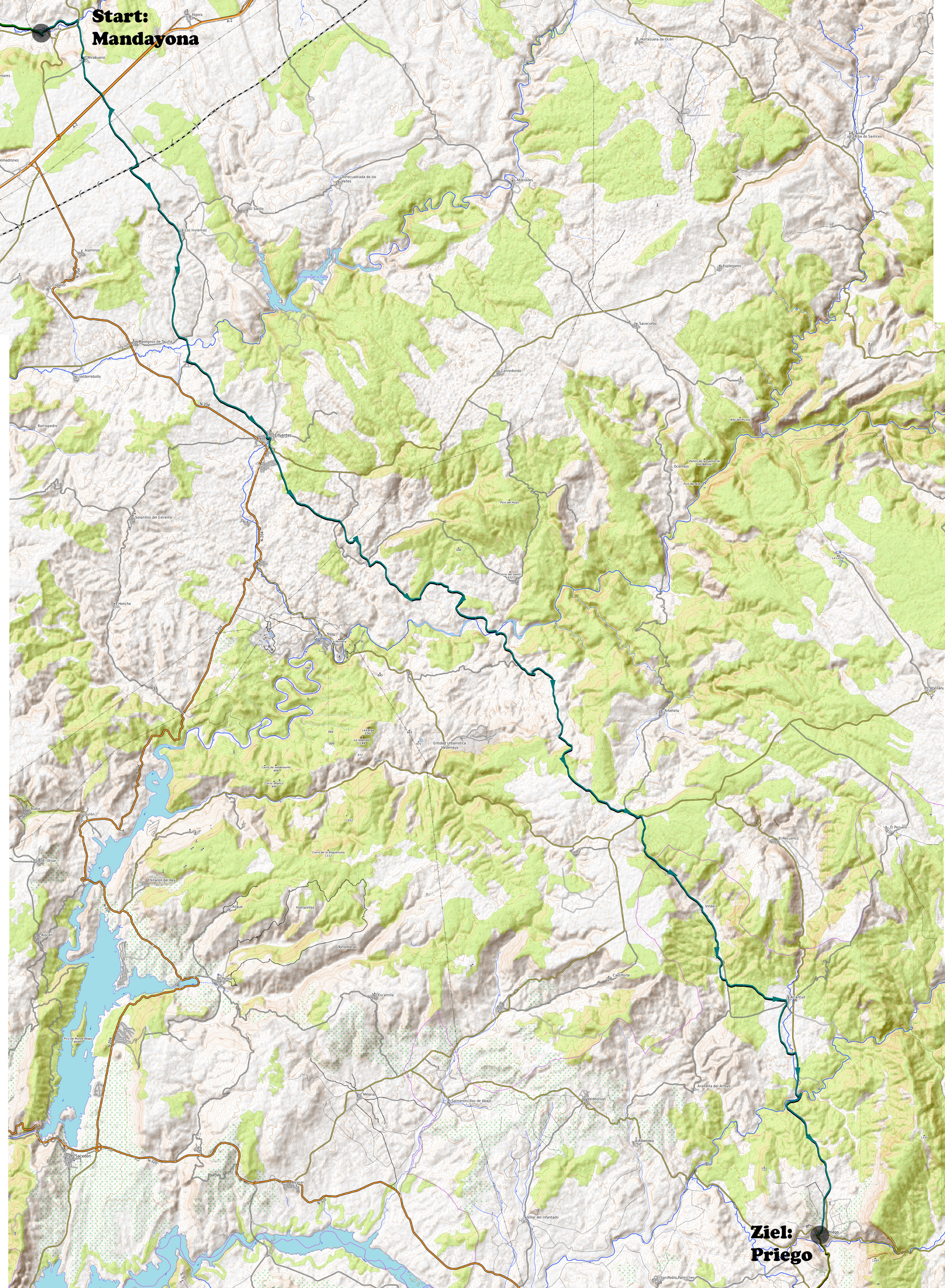 Heute Morgen gab es für uns um 8.00Uhr das Morgenessen. Etwa um 9Uhr starteten wir dann. Nach 3 flachen Kilometern auf dem GR10 gab es dann den etwa 200hm umfassenden Aufstieg nach Mirabueno. Hier ging es dann auf dem Pilgerweg weiter in die etwas grössere Ortschaft Cinfuentes. Danach folgten wir noch dem GR66 Fernwanderweg in Richtung Tajo Fluss. Unterhalb der Ortschaft Morillejo gab es dann eine der wenigen Brücken über diesen reissenden Fluss. Etwa zur Mittagszeit um 14.30Uhr erreichten wir dann Morillejo. Gerne hätten wir hier eine Bar oder ein Restaurant aufgesucht. Doch das gab es in dieser Ortschaft, wie in vielen anderen, nicht mehr. Also verzehrten wir noch das Notbrot und den Not-Fuet. Danach ging es auf einer Piste über ein kleines Pässli(1150m) weiter durch die Wildnis bis nach Vindel. Auch in diesem einsamen Dorf war nichts los. Erst als wir dann gegen 18Uhr Alcantud erreichten bot sich uns der Besuch einer Bar an. Nach einem Drink radelten wir dann mehrheitlich auf der Straße nach Priego. Hier bezogen wir dann das Hostal welches im Ortszentrum war.