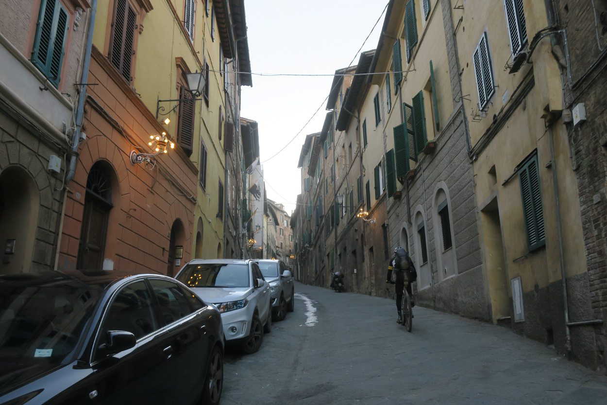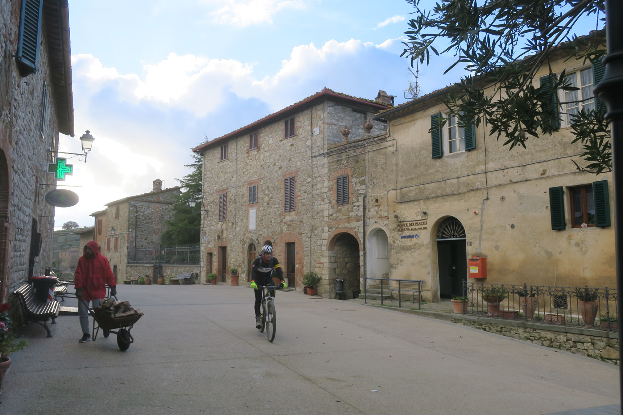 Heute morgen gab es in unserem Hotel um 7.30Uhr ein wunderbares Zmorgebüffet. Danach besichteten wir noch schnell den Garten der Hotelvilla. Un 8.30Uhr starteten wir dann. Zuerst ging es auf einem schmalen Strässchen nach La Presura. Dort ging es dann eine erste Partie auf Wiesen und Waldtrails nach Il Palgione. Leider waren diese Pfade völlig durchnässt. Auf einem Strässchen radelten wir dann zum Castello di Sezzate. Dort ging es dann auf einem Trail nach Cintoia. Von da radelten wir dann für 4km auf der Strasse nach La Panca. In la Panca nahmen wir dann einen eher mühsamen Trail in Richtung Passo del Sugane. Von da aus begann dann der Aufstieg in Richtung Monte San Michele. Etwa um 12Uhr erreichten wir dann den Monte San Michele auf 850m. Mehr oder weniger auf der Höhe ging es dann weiter zum Monte Querciabella. Leider waren hier oben die Pisten extrem nass und teilweise recht schlammig. Danach ging es dann auf einem besseren Karrenweg nach Volpaia hinunter. In diesem urtümlichen Dorf gab es dann ein hübsches Restaurant fürs Mittagessen. Danach ging es dann auf der Strasse nach Radda in Chianti Von dort aus ging es dann auf ungeteerten Provinzstrassen bis fast nach Siena. Auch die Sonne kam nun wieder zum Vorschein. Um ca. 16Uhr erreichten wir dann Siena unser Tagesziel. Nach der Besichtigung der Sehenswürdigkeiten suchten wir dann das Hotel Palazzo Ravizza auf. In diesem Palazzo kriegten wir dann ein historisches 2 Bett Superior Zimmer.