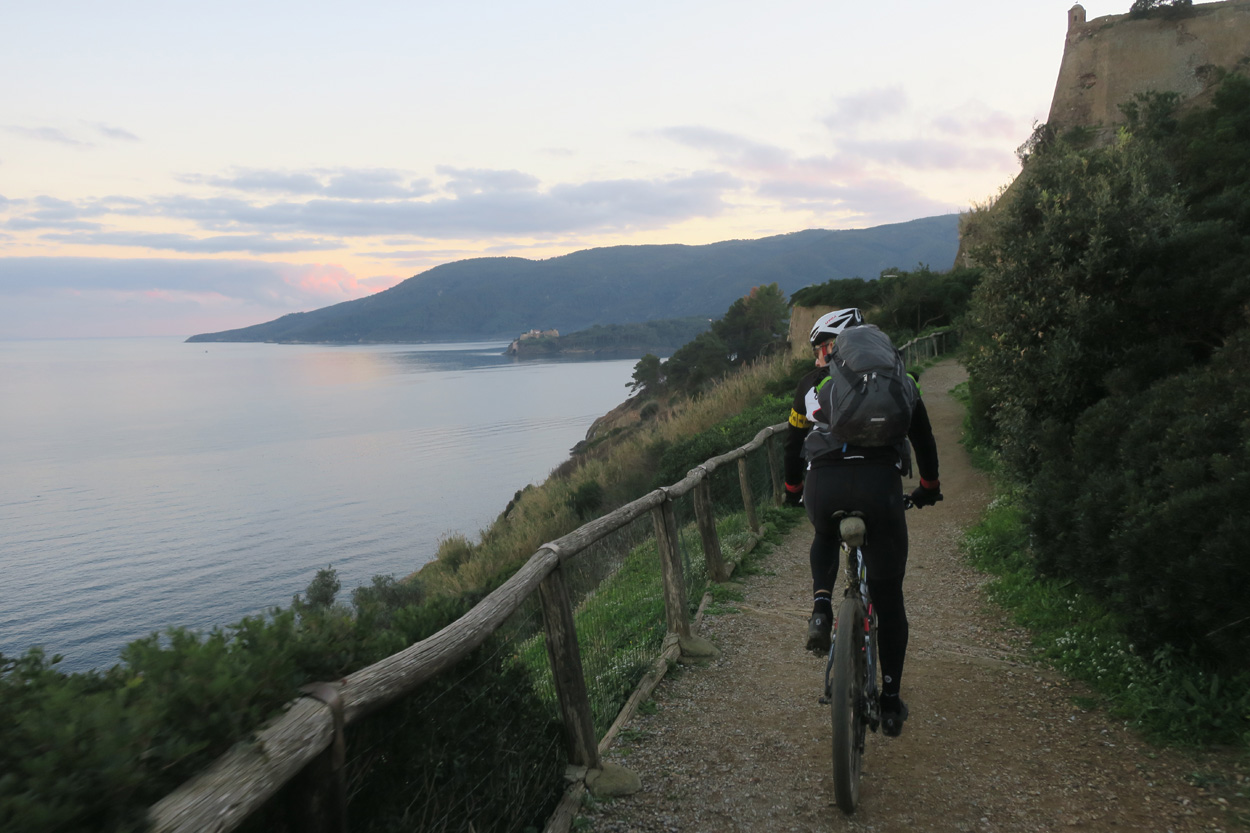 Heute morgen starteten wir praktisch ohne Morgenessen um 8Uhr. Von Massa Marittima ging es zuerst 200hm hinter nach Molinpreso. Durch leichte Hügel ging es dann zum Parco Naturale di Montioni. In diesem hügeligen Naturpark gab es unzählige schöne Trails. Um 10.00Uhr erreichten wir dann die Siedlug Vignale am Ende des Parks. Nun waren es noch 18km bis zum Fährhafen in Piombino wo um 10.45 Uhr die Fähre nach Elba fuhr. Das bedeutete das es nun fertig war mit gemütlichem Radeln. Wir gaben nun Vollgas und ignorierten dabei noch ein Hinweis auf eine gesperrte Überführung. Das wurde uns dann auch fast zum Verhängnis, den die Eisenbahnüberführung war mit Gittern abgesperrt. In der Eile überquerten wir dann die Geleise und mussten danach durchs Dornengestrüpp den Weg suchen. Immerhin waren wir dann 5min bevor die Fähre fuhr am Hafen. Wir besorgten schnell die Tickets für je 22€ und konnten 2min vor der Abfahrt noch in die Fähre fahren.
