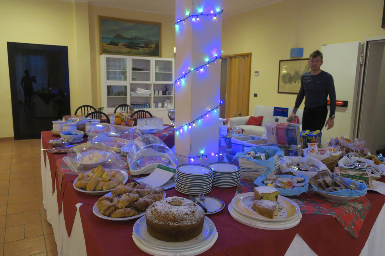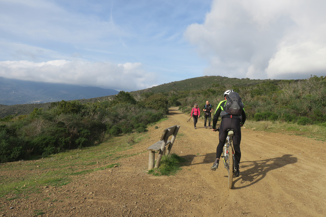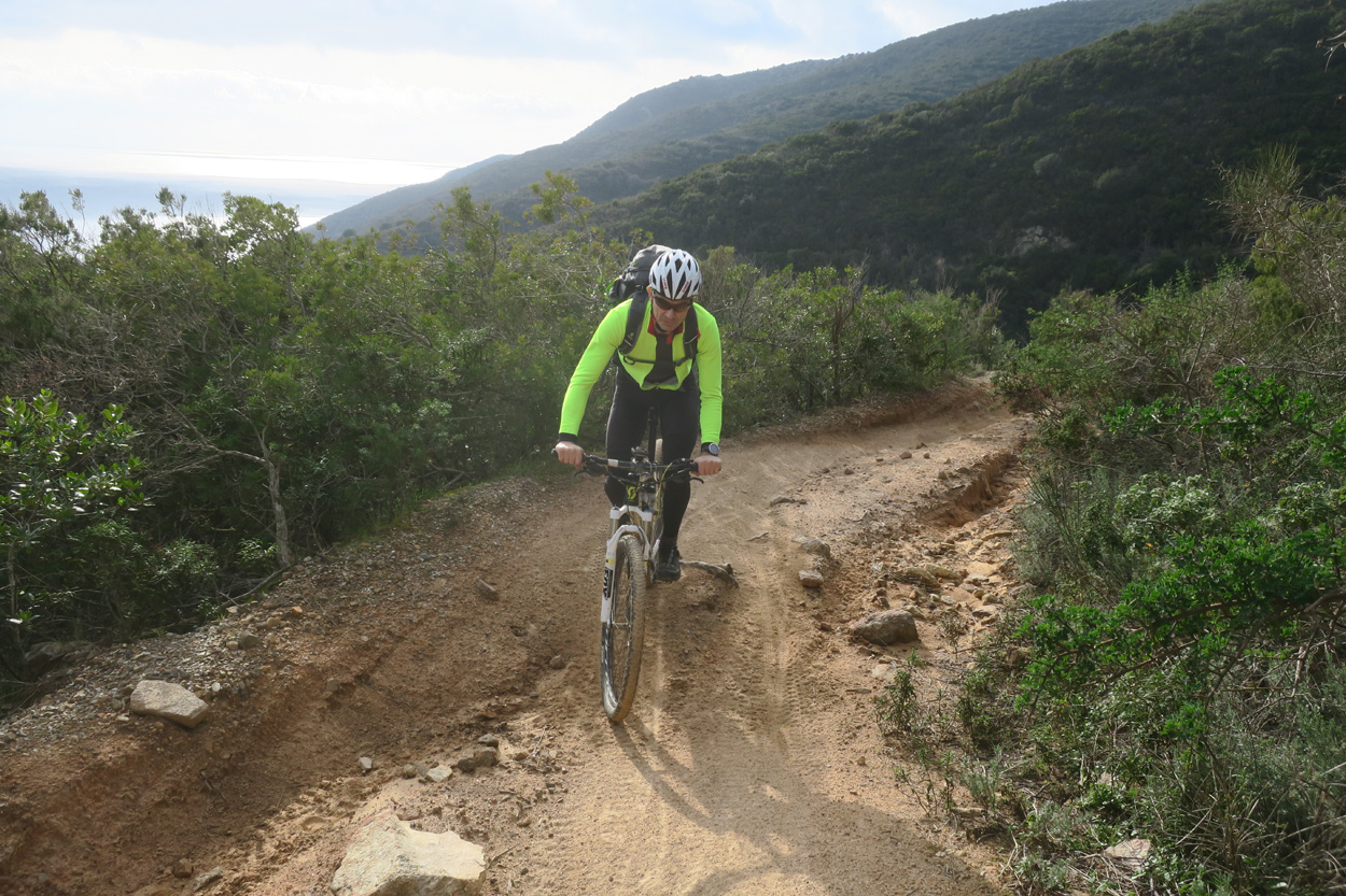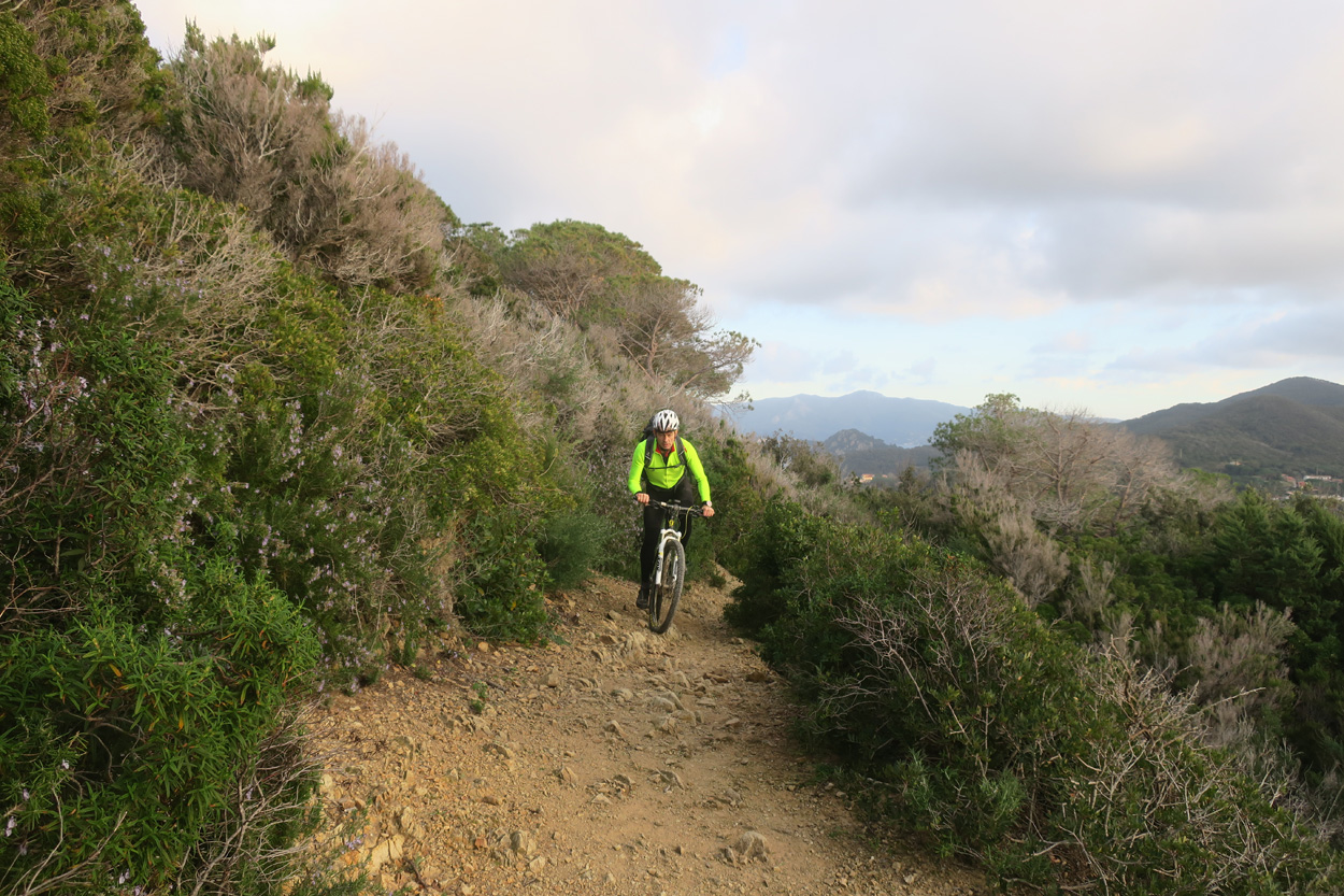 Heute Morgen konten wir die frisch gewaschenen Kleider in Empfang nehmen und setzten uns danach in den Speisesaal zum Morgenessen. Gegen 8.45 Uhr Starteten wir dann. Nach einem kurzen Stück Hauptstrasse ging es dann bei Mola über einen Kloackenbach. Danach folgte dann die schöne Piste dem Meer entlang um den Monte Calamita herum. Um 10.30 Uhr erreichten wir dann die schöne Ortschaft Capoliveri. Hier besichtigten wir noch kurz das Zentrum und nahmen danach die küstennaheste Linie nach Lacona. Hier begann dann der Aufstieg zum Monte Tambone. Zuerst gab es eine schöne Naturstrasse die dann jedoch ziemlich ausgewaschen war. Weiter oben war dann der Fahrweg wieder in gutem Zustand. Etwa um 12.20Uhr erreichten wir dann auf 377m den Gipfel des Monte Tambone. Nun ging es auf einem schönen Höhenweg in Richtung Monte San Martino. Dort nahmen wir dann den 44er Weg zum Colle di Procchio. Am Anfang sah dieser Trail toll aus, wurde dann aber immer anspruchsvoller und dann eher mühsam. Um 13.20 Uhr kehrten wir dann in Procchio für das Mittagessen ein. Danach radelten wir ein Stück auf der Hauptstrasse zum Colle Pecoano. Danach folgte eine schöne Piste mit anschliessendem Trail zur Punta die Sansone. Hier machten wir noch kurz ein Fotoshooting und fuhren dann noch zum Monte Enfola hinauf. Auf dem Monte Enfola, auf ca.120m ü M gab es dann noch einen militärischen Stollen den wir durchqueren konnten. Danach war dann die Rückfahrt nach Portoferraio angesagt. Gegen 16 Uhr erreichten wir dann Portoferraio. Hier hatten wir noch eine gute Stunde Zeit, bis uns die Toremar Fähre wieder zurück ans Festland brachte, welche wir für eine ausgiebige Stadtbesichtigung nutzten. Um ca. 18.15 Uhr erreichten wir dann in Piombino wieder das Italienische Festland. Nun radelten wir noch etwa 2Kilometer bis ins Stadtzentrum wo wir dann ein Zimmer im Hotel Italia bezogen. Danach ging es zum Abendessen in ein Restaurant.