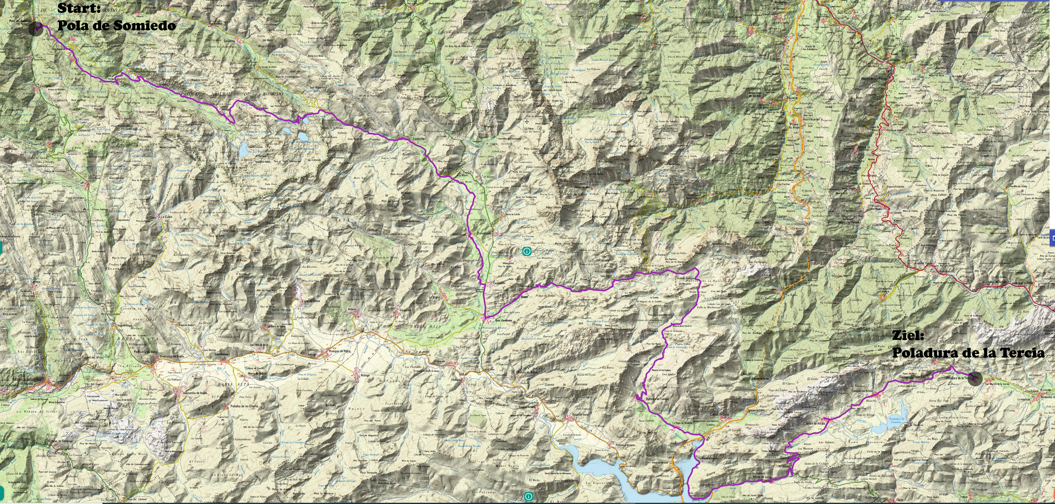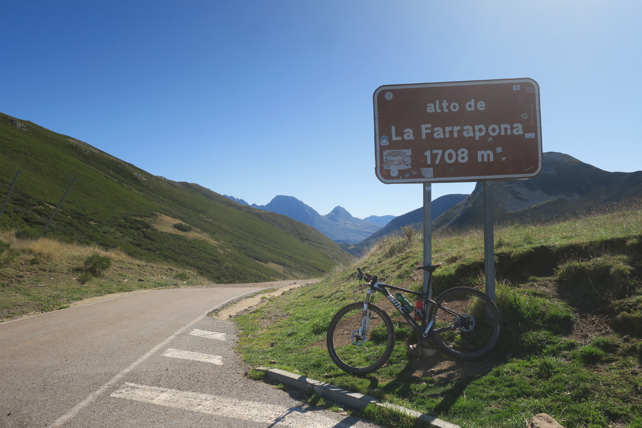 Heute Morgen gab es für den stolzen Preis des Zimmers von 60€ nur ein sehr einfaches Morgenessen. Kurz nach 9Uhr startete ich dann. Zuerst ging es hinauf ins Bergdorf Valle de Lago. In diesem Aufstieg konnte ich fast alles auf einer wunderschönen Variante fahren. Danach ging es dann noch fahrend im Tal weiter bis km 13. Dort folgte dann ein Kilometer eher Steiler Trailaufstieg. Hier war ich dann etwa 20min am Laufen. Gegen 12Uhr erreichte ich dann die grosse Hochebene bei Bruxas. Ab hier konnte ich dann meis auf einem feinen Wiesenpfad alles wieder fahren. Beim Lago Cerveiriz begann dann eine sehr spektakuläre Piste zum Lago de la Cueva hinunter und weiter zum Alto de la Farrapona Pässli auf 1707m. Ab hier gab es dann eine Relativ Fette Piste hinunter zur kleinen Ortschaft Torrestio. Ab hier folgte ich dann einer Bikeroute zur etwas grösseren Ortschaft San Emiliano Pinos. Hier hatte ich dann die Gelegenheit in einem Supermercado Saft zu Kaufen. Danach begann dann der nächste Aufstieg auf einer gut fahrbaren und feinen Piste zum Alto de Palo. Hier verspeiste ich Brot und Fuet aus dem Rucksack. Danach folgte noch ein Stück Piste ehe es dann über Wiesen und Trails in der Wildnis zum La Collada P.1612 ging. Um16Uhr erreichte ich dann auf der Bikeroute die kleine Ortschaft Pobledo de Caldes. Hier suchte ich eine Bar auf und legte meine weitere Route fest. Nach einer halben Stunde Pause radelte ich dann auf der Straße zum Embalse de los Barrios de Luna Stausee und weiter über Aralla de Luna zum Tunel de Alceo hinauf. Nach der Durchquerung des kurzen Scheitel Tunnels sah ich eine schöne weite Ebene mit 2kleinen Ortschaften. Hier telefonierte ich dann meiner vorgesehenen Unterkunft wegen einem Zimmer. Zimmer gab es, aber anscheinend kein Essen. Deshalb buchte ich nicht und suchte in den beiden Ortschaften nach anderen Unterkünften. Doch leider hatten diese heute Ruhetag oder waren verwaist. Um 19Uhr war ich dann bei der Unterkunft wo es kein Essen geben sollte. Ich nahm das Zimmer und fragte nach etwas zu Essen. Man sagte Abendessen gebe es nur nach Reservation am Vortag. Nach kurzem verhandeln wurde ich dann aber trotzdem sofort zu Tische gebeten un konnte dann um 19.15Uhr mit den anderen Gästen zusammen ein feines Abendessen genießen. Ich war sehr froh dass es doch noch geklappt hatte. Denn die nächsten Unterkünfte lagen sicherlich eine Stunde davon entfernt.