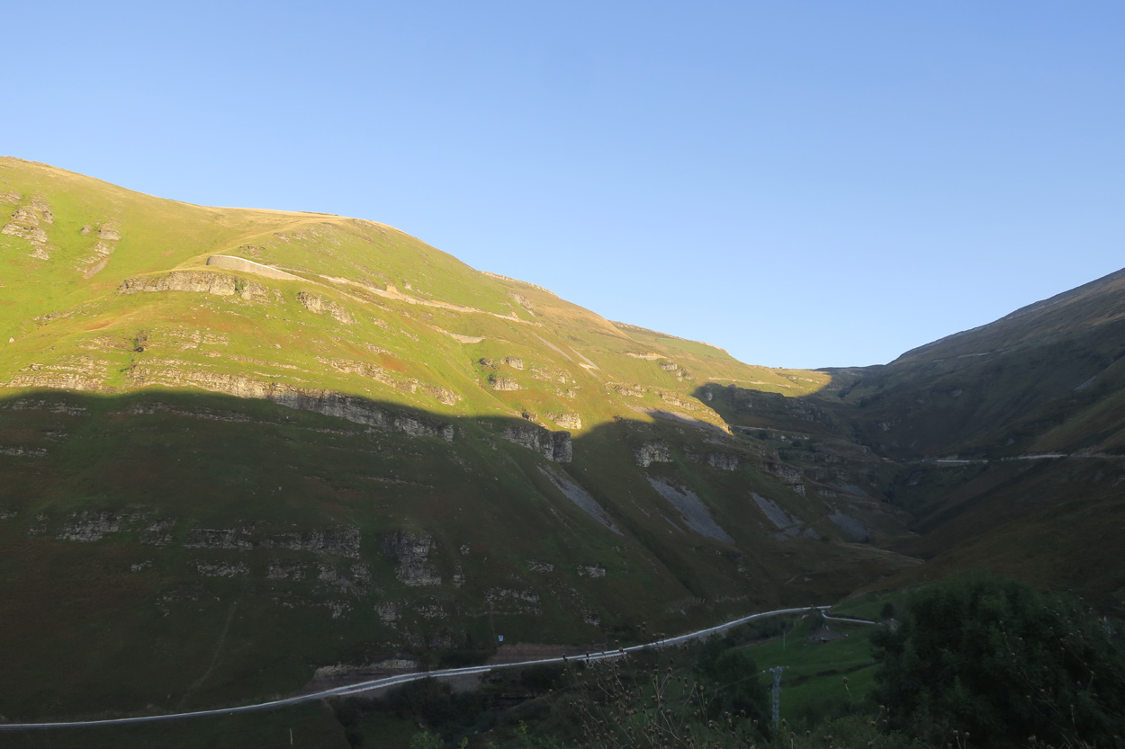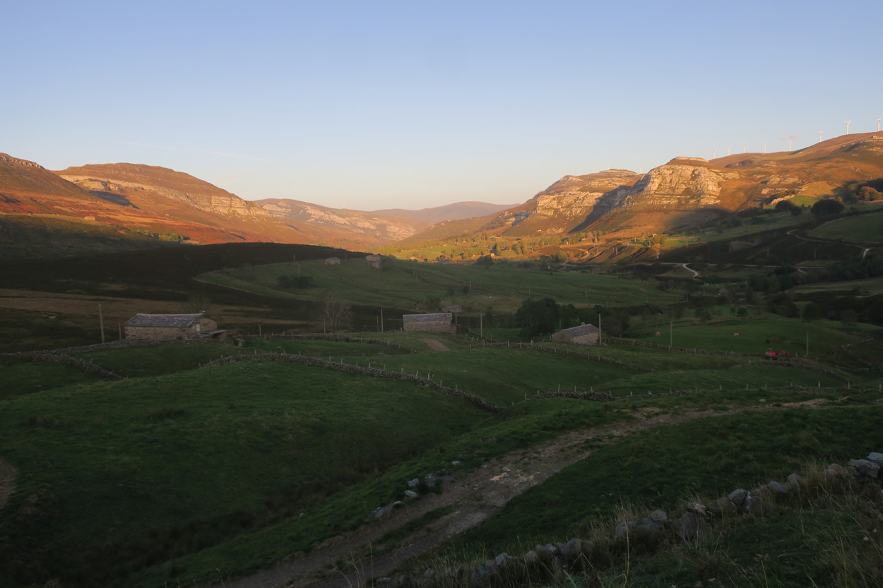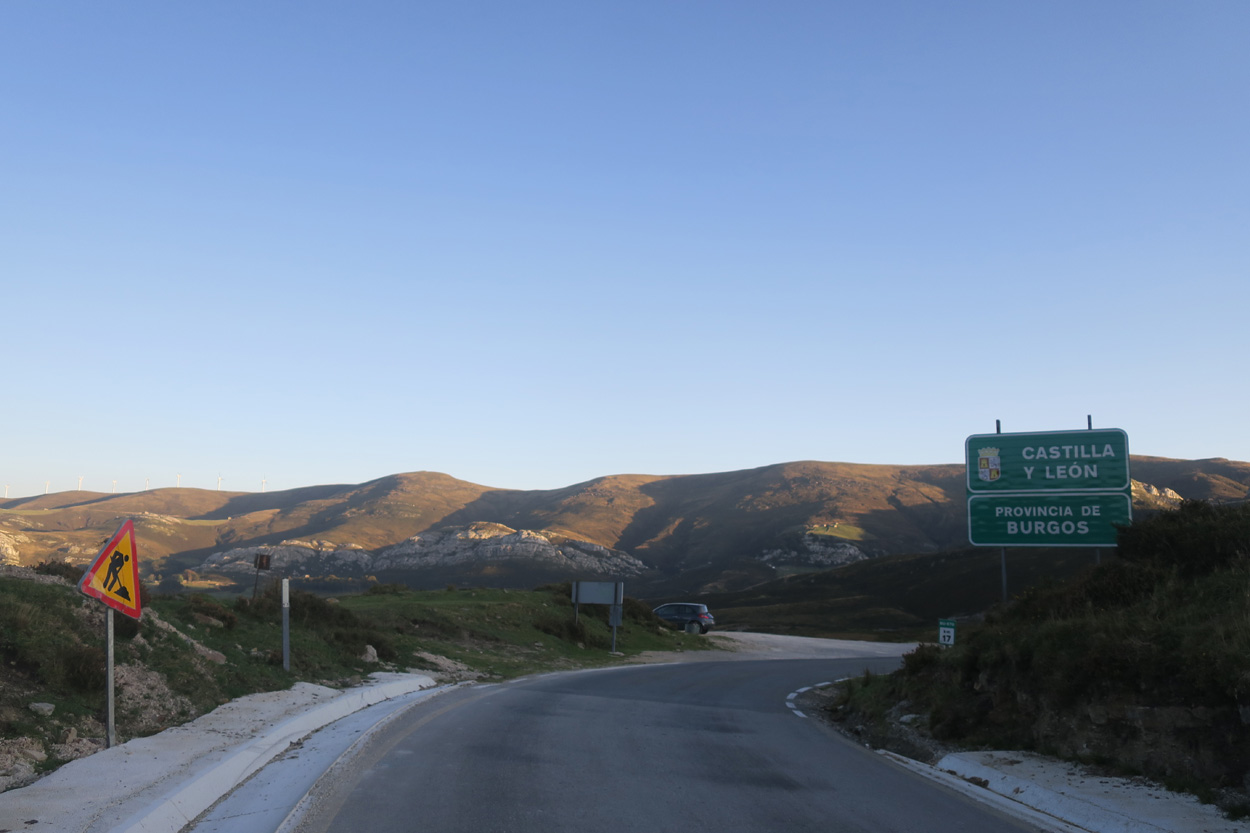 Heute Morgen konnte ich um 8.30 Uhr beim Morgenessen meine frisch gewaschenen Kleider in Empfang nehmen. Um 9.30 Uhr startete ich dann. Zuerst ging es auf dem Asphalt über Puente Pumar bis nach Uznayo. Dort begann dann der Aufstieg auf einer Naturstrasse zum Collado de Sejos. Dort oben auf 1500m kam ich dann gegen 11 Uhr an. In der darauf folgenden kurzen Abfahrt von 200hm hatte ich zum Teil mit heftigen Windböen zu kämpfen. Danach führte die Piste wieder hinauf zum Llano Castrillo auf knapp 1600m und dann ging es langsam, aber steig hinunter zum Puerto de Palombera. Zwischendurch hatte ich hier meine ersten Ausblicke in Richtung Atlantik. Nach dem Puerto de Palombera nahm ich etwa einen Kilometer lang die Strasse und folgte dann danach abseits des Aspahltes einer Piste, auf welcher ich mehr oder weniger auf der Höhe in Richtung Reinosa Fahren konnte. Um 13.15 Uhr erreichte ich dann die Kleinstadt Reinosa. Die Wohnblocks am Rande der Ortschaft waren nicht gerade einladend. Das Zentrum war aber noch recht hübsch und so setzte ich mich dann dort für die Mittagspause in eine Heladeria. Um 14Uhr ging es dann dem noch kleinen Fluss Ebro entlang zum Embalse del Ebro. Auf der südliche Seite des Stausees radelte ich dann auf der Strasse mit Rückenwind nach Cilleruelo de Bezana. Dort ging es dann meist auf Wiesenpisten bis Argomedo. Hier gab es dann eine kurze Abfahrt zum Rio Nela hinunter. Wenig später begann dann in Santelices ein schöner Bahntrassenradweg in Richtung Tunnel de la Engana von ca. 5km Länge. Als ich dann vor dem knapp 7km Langen Tunnel stand, sah ich dass das Tunnelportal bis auf ein kleines Guckloch zugemauert war. Mit dem Bike war da kein Durchkommen möglich. Da ich aber in der Nacht noch einen Youtoube Film über den Tunnel gesehen hatte wusste ich, dass es seitlich des Portals noch einen kleinen Nebeneingang durch einen Stollen geben sollte. Also folgte ich jenem Trampelpfad und gelangte prompt zum Stolleneingang. Dort kam zufälligerweise gerade ein Läufer heraus. Ich fragte ihn kurz nach der Situation im Tunnel. Er meinte das nach ca. 2,5km die Decke eingestürzt sei und er dort wieder umgekehrt sei und dass es zu Beginn des Tunnels ordentlich Wasser am Boden hat. Er sagte mir auch dass der Nordeingang des Tunnels nicht verbarrikadiert sein soll. Also montierte ich das Licht und machte mich auf in den Stollen. Nach etwa 100 Metern erreichte ich dann den Haupttunnel. Dort gab es dann noch eine Treppe hinunter zum Bahntrasse. Wegen des Wassers am Tunnelboden ging ich dann kurze Zeit zu Fuss dem Tunnelrand entlang. Konnte dann aber ziemlich bald im Trockenen fahren. Auf dem lehmigen Tunnelboden sah ich auch diverse Bikespuren. Bis zur Stelle mit dem Deckeneinsturz kam ich gut voran. Als ich dann dort war, sah ich dass es vom Schutthaufen bis zum Felsen noch genügend Luft hatte um mit dem Bike drüber zu Steigen. Ich versuchte es vorsichtig und schaffte es heil auf die andere Seite. Hier angekommen konnte ich dann schon das Licht am Ende des Tunnels sehen. Bis unmittelbar vor den Schuttkegel gab es von dieser Seite her sogar Autospuren. Es dauerte aber dann noch knapp 20 Minuten bis ich draussen war, denn es waren ja noch sicherlich 4,5km zurück zulegen. Nach 35min im Untergrund erblickte ich dann um 17.45 Uhr wieder das Tageslicht. Nach weiteren 5km auf dem Bahntrasse erreichte ich dann an dessen Ende die Strasse, welche zum Puerto de las Estacas hinauf führt. Ich hatte nun noch gut 90 min Zeit bis zum Sonnenuntergang um nach Espinosa de los Monteros zu gelangen. Es waren noch etwa 27km und 600Höhenmeter zurückzulegen. Also verschärfte ich mein Tempo. Gerade bei Sonnenuntergang erreichte ich dann mein Tagesziel und konnte sogleich auch ein gutes Hotelzimmer beziehen. Zum Essen sah es an diesem Sonntag Abend nicht so Toll aus aber schlussendlich fand ich dann doch noch ein Bar-Restaurant wo es etwas anständiges gab.