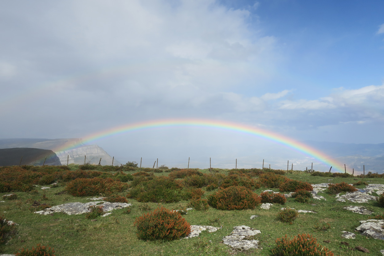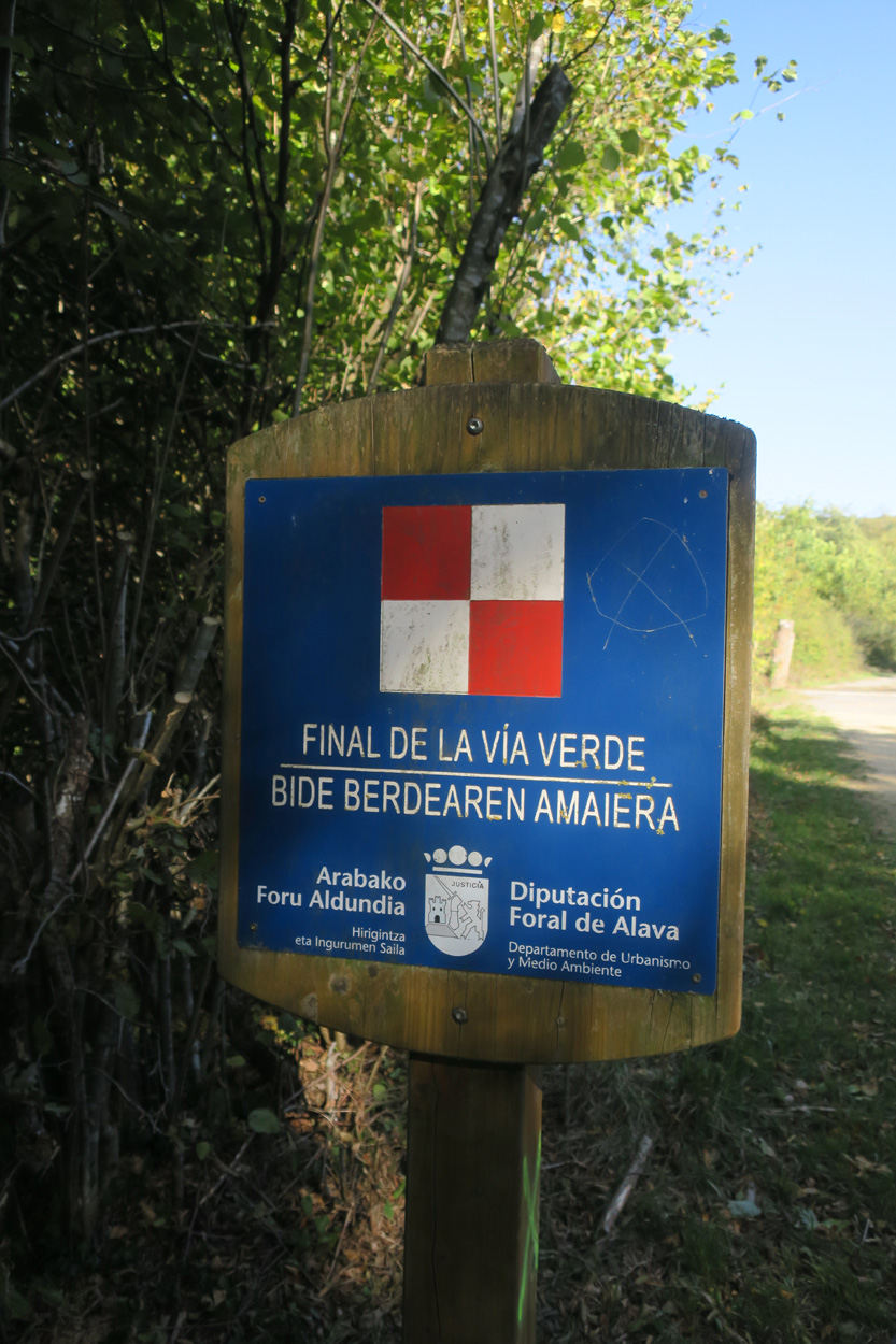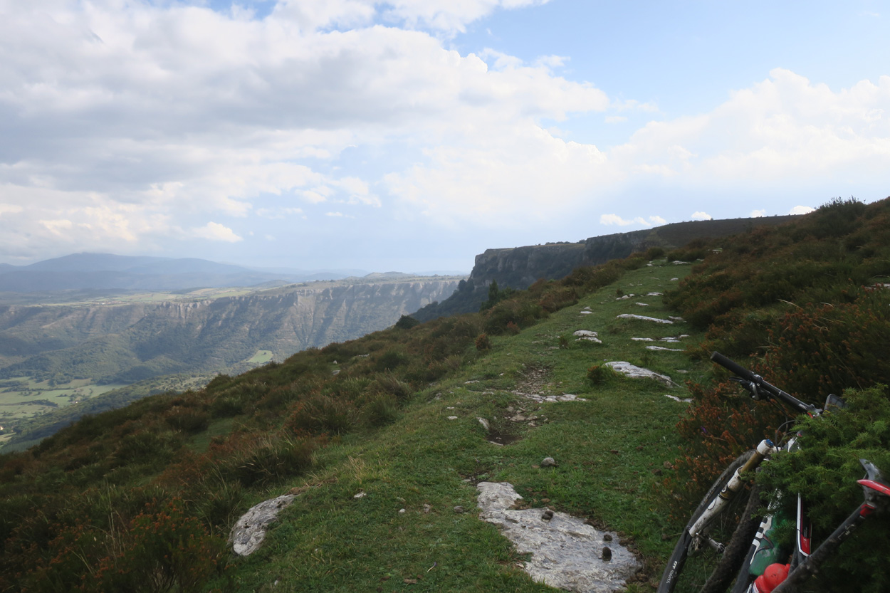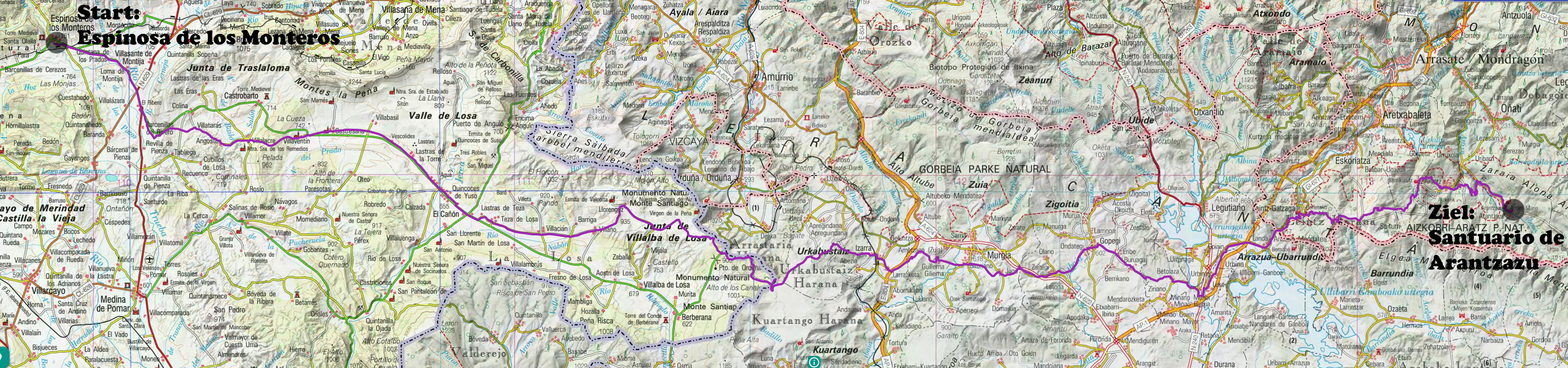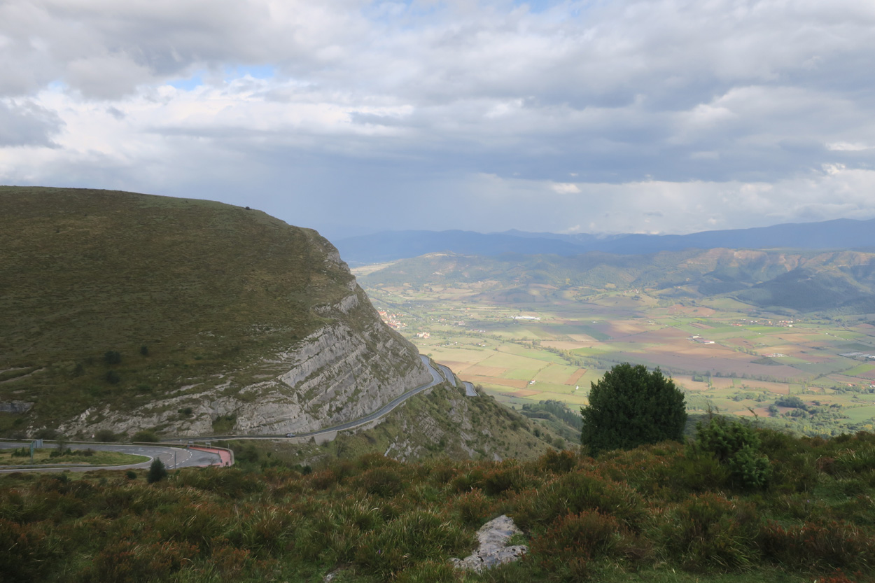 Heute Morgen gab es in der Unterkunft leider kein Morgenessen. Darum suchte ich eine benachbarte Bar auf. Um 9 Uhr Startete ich dann. Da es am Himmel recht wolkenverhangen aussah, wählte ich eine speditive Route um noch vor dem Regen weiterzukommen. Die ersten 10 km machte ich auf einer Hauptstraße. Dann folgten 20km Pisten und Trails bis Quincoces de Yuso. Dort wurde ich dann gegen 11 Uhr vom Regenwetter eingeholt. Doch glücklicherweise war der Niederschlag nur von kurzer Dauer. Auf kleinen Strassen ging es dann weiter biz zur Siedlung Llorengoz de Losa. Dort konnte ich dann um 12 Uhr auf einem GR Wanderweg zum Puerto de Orduna weiterradeln. Dort geriet ich dann nochmals in einen heftigen Schauer so dass ich kurz bei einem Müllcontainer Unterstand Schutz suchte. Danach ging es auf einem schönen, gut fahrbaren Trail hinauf zum Mirador Esquina Rubon. Dort hatte man eine Tolle Aussicht und konnte zudem noch einen prächtigen Regenbogen sehen. Auf einer markierten Bikeroute ging es dann weiter zum Mirador de Salto Nervión und über den Alto del Corral nach Izarra. Dort reichte es gerade noch um vor der Mittagspause kurz vor 14Uhr in ein einem Laden Proviant zu kaufen. Danach ging es teilweise auf dem Asphalt und teilweise auf Pisten weiter in Richtung Vitoria Gasteiz. Bei dem Vorort Luko gelangte ich dann gegen 16Uhr auf einen schönen Bahntrasse Radweg. Auf diesem legte ich dann knapp 10 km bis zum Venta Fria zurück. Dort begann ich dann um 16.45 Uhr mit dem Aufstieg zur Sierra de Elgea. Es war wieder eine schöne relativ grüne Hügellandschaft hier. Bei Deguria auf knapp 1100m erreichte ich dann um 17.45 Uhr den höchsten Punkt dieses Tages. Hier ging es dann mit 2 kleinen Gegensteigungen hinunter nach Araotz. Um 18.30 Uhr gab es hier dann nochmals 200 Höhenmeter zur Siedlung Azkoitian-aundi. Um 18.45 Uhr hatte ich dann diesen kleinen Zwischenaufstieg auch geschafft. Doch leider war dann die folgende Piste hinunter zum Gehöft Arrikrutz mit Dornengestrüpp ziemlich verachsen. Da ich nicht mehr wahnsinnig viel Zeit bis zum Sonnenuntergang hatte ging ich das Risko ein und fuhr da hinunter. Am Ende der Abfahrt musste ich dann feststellen das ich am Vorderrad eine Platte hatte. Es war Mittlerweilen schon 19.30 Uhr und es fehlten noch gut 250 Höhenmeter bis zum Santuario de Arantzazu. Als ich dann nach einem kurzen Karrenweg Steilstück die Strasse zum Santuario erreichte, musste ich feststellen das mittlerweilen auch im Hinterrad die Luft ausging. Mit 3 mal Nachpumpen erreichte ich dann gegen 20 Uhr das Hotel des Klosters. Zum Glück durfte ich das Bike ins Zimmer nehmen. Nach dem Abendessen war ich dann mit dem Reparieren der Schläuche beschäftigt.