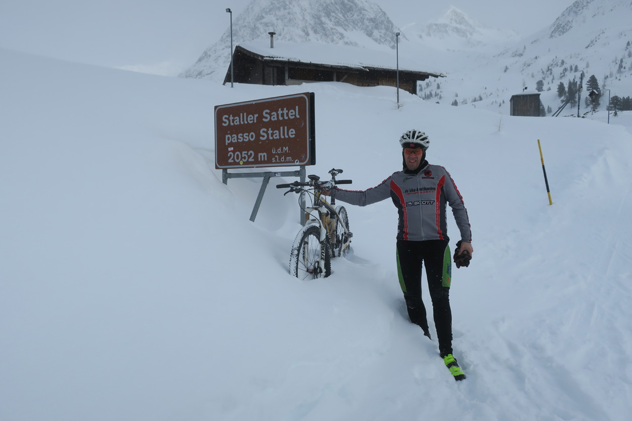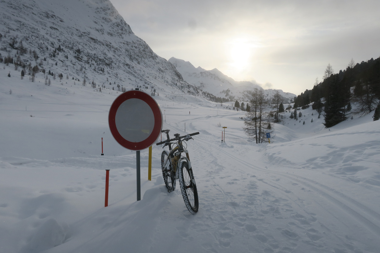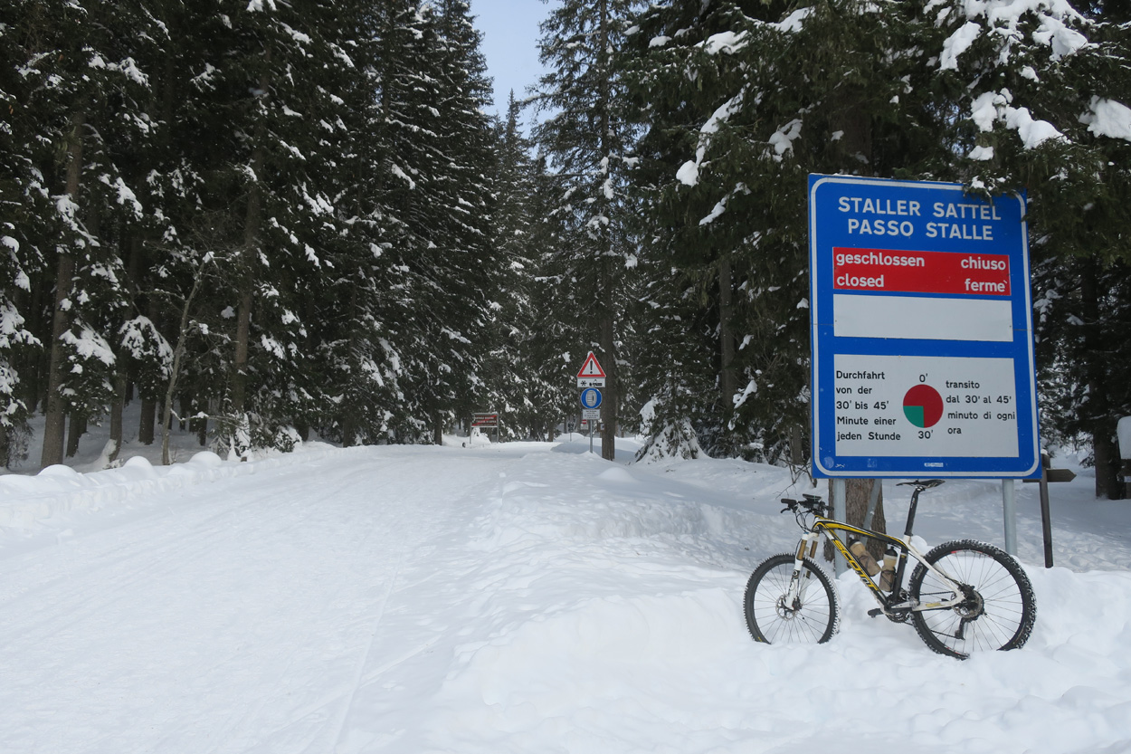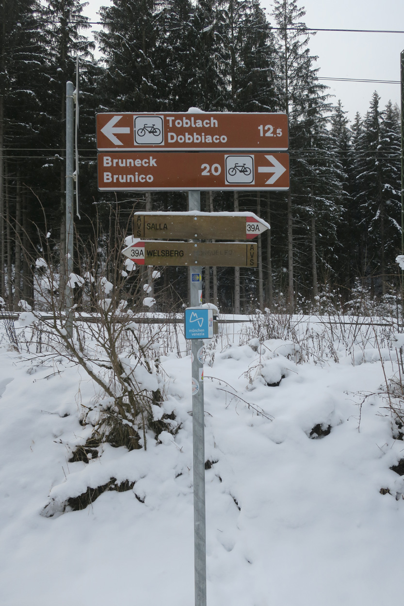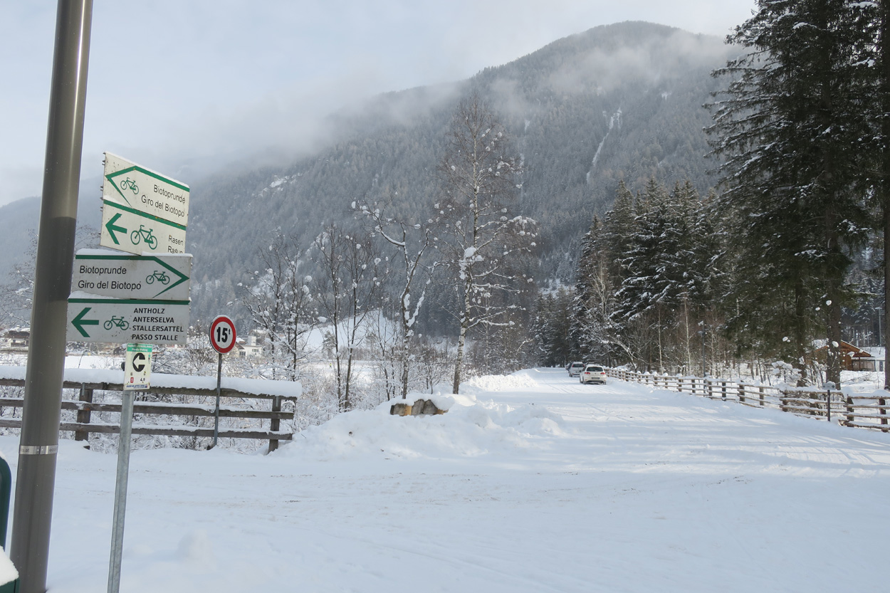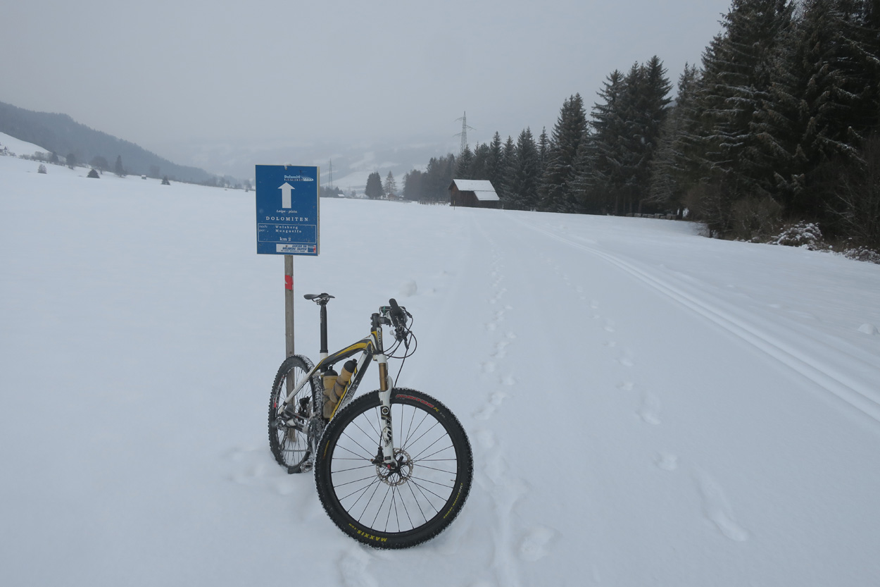 Heute Morgen ging ich in 7.45Uhr ans Morgenessen. Leider hatte ich in der Nacht nicht allzu lange geschlafen, denn ich musste mir noch eine Route ausdenken.... Nach dem sehr guten Morgenessen startete ich dann um 8.30Uhr vor dem Hotel Hohe Gaisl auf knapp 2000m ü M. Zuerst ging es auf der mit Neuschnee bedeckten Strasse (ca. 5 bis 10cm Neuschnee) und dem Winterwanderweg in flottem Tempo hinunter zum Brückele. Die Dame an der Mautstelle Brückele staunte nicht schlecht als Sie mich sah und wünschte mir noch eine schöne Tour. Auf dem weiteren Weg nach Prags konnte ich dann eine Forststrasse nehmen wo zuvor grad eine Skitruppe des Italienischen Militär durchgewandert war. Von Prags nach Welsberg nahm ich dann den offiziellen Radweg. Es war als Loipe präpariert und hatte eine optimale Härte um darauf in hohem Tempo Fahren zu können. Das nächste Teilstück am Olanger Stausee entlang war dann mit einem Traktor grob geräumt worden. Danach ging es über die Staumauer zum Weiler Goste. Hier begann dann nun das Antholztal wo ich abwechslungsweise auf der Nebenstrasse und dem Winterwanderweg nach Antholz Niedertal fuhr. In Antholz Niedertal ist mir beim vorbeifahren noch ein professioneller Bikeshop aufgefallen. Um ca. 11Uhr war ich dann kurz vor Antholz Mittertal, als mir plötzlich der linke Kurbelarm brach. Ich kehrte um und ließ es 2km zurück zum Bike Geschäft rollen. Leider öffnete dieses erst um 13.30 Uhr. Auch per Telefon war niemand zu erreichen. Ich fragte dann im Lebensmittelladen nebenan ob man vielleicht eine Händy Nummer vom Bikeshop hat. Da bekam ich den Tip dass ich im Restaurant daneben fragen soll. Hier traf ich dann die Mountainbike Legende Roel Paulissen der mit einem Kollegen den Laden betreibt. Da meine XTR Kurbel schon sicher 10Jahre alt war und noch für 9Fach Übersetzung war, war es wie ein sechser im Lotto was passendes zu finden. Schlussendlich konnte er dann an einem alten Occasionsbike eine noch passende Kurbel ausbauen und bei mir wieder einbauen. Kurz nach 12Uhr konnte ich dann meinen Trip wieder fortsetzten. Für die rasche Reparatur war ich sehr sehr dankbar, denn ich wollte noch unbedingt den Stallersattel mal im Winter ausprobieren. Auf der Straße radelte ich dann hinauf zum Antholzersee. Dort war wegen eines Biathlon Weltcup gerade der Teufel los.... Nach der Überquerung des gefrorenen Anthohlzersees auf dem Winterwanderweg begann dann der Schlussaufstieg auf der Passtrasse welche als Schlittelpiste gepresst war. Ich merkte bald dass die Piste etwa 50cm vom Rad entfernt am härtesten war. Obwohl es auch hier einwenig Neuschnee (ca.5cm) gab, konnte ich dann bis zur Passhöhe auf 2052m alles fahrend bewältigen. Um 14.30Uhr überschritt ich dann die Staatsgrenze von Südtirol nach Österreich auf dem Pass. Auf dem gespurten Winterwanderweg erreichte ich dann um 14.45 Uhr das Alpengasthaus Obersee. Leider liess hier die Härte des Untergrundes etwas zu wünschen übrig. Im schönen Alpengasthaus konsumierte ich kurz eine Gulaschsuppe und überquerte danach den Obersee. Leider war hier der Weg wegen des Neuschnees zu weich um mit einem normalen Bike fahren zu können. Nach der Seeüberquerung ging es dann abwärts und somit reichte die Schneehärte um auf der Piste fahren zu können. Ab der Stalleralm auf 1968m war dann die Strasse gepfadet. Nun ging es noch das Defreggental bis nach Huben ins Tauerntal hinunter. Im Defreggental konnte ich noch ein paar ganz schöne Abschnitte auf harten Winterwanderwegen machen. Um 17.15 bei Einbruch der Dunkelheit erreichte ich dann Huben. Hier war dann gar nichts los. Auch die Restaurants waren geschlossen. Um 17.40 Uhr fuhr ich dann mit dem letzten Postbus des heutigen Tages durch den Tauerntunnel nach Mittersill im Pinzgau. Hier kam ich dann um 18.30Uhr am Bahnhof an und nahm dann gleich ein Zimmer im gegenüberliegenden Gasthaus Post. Die Chefin war sehr freundlich und bot mir sogar an die Kleider zu waschen.