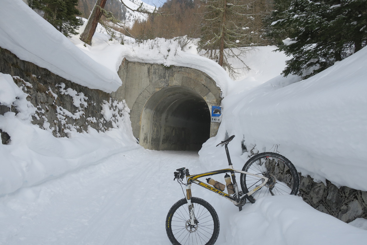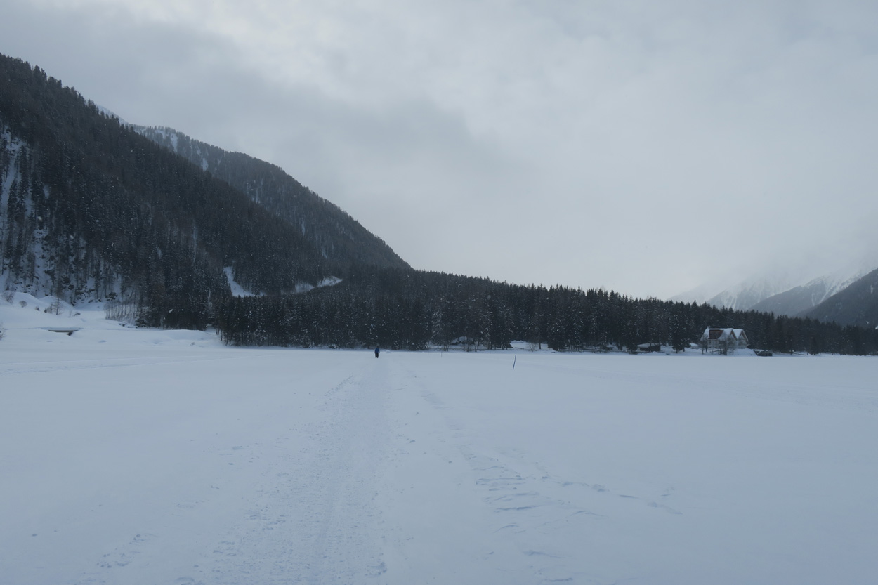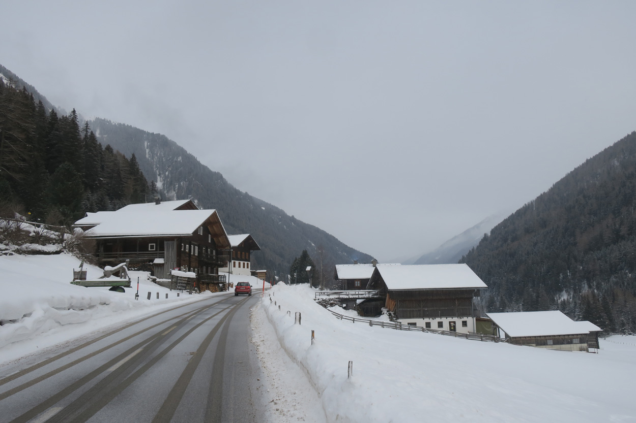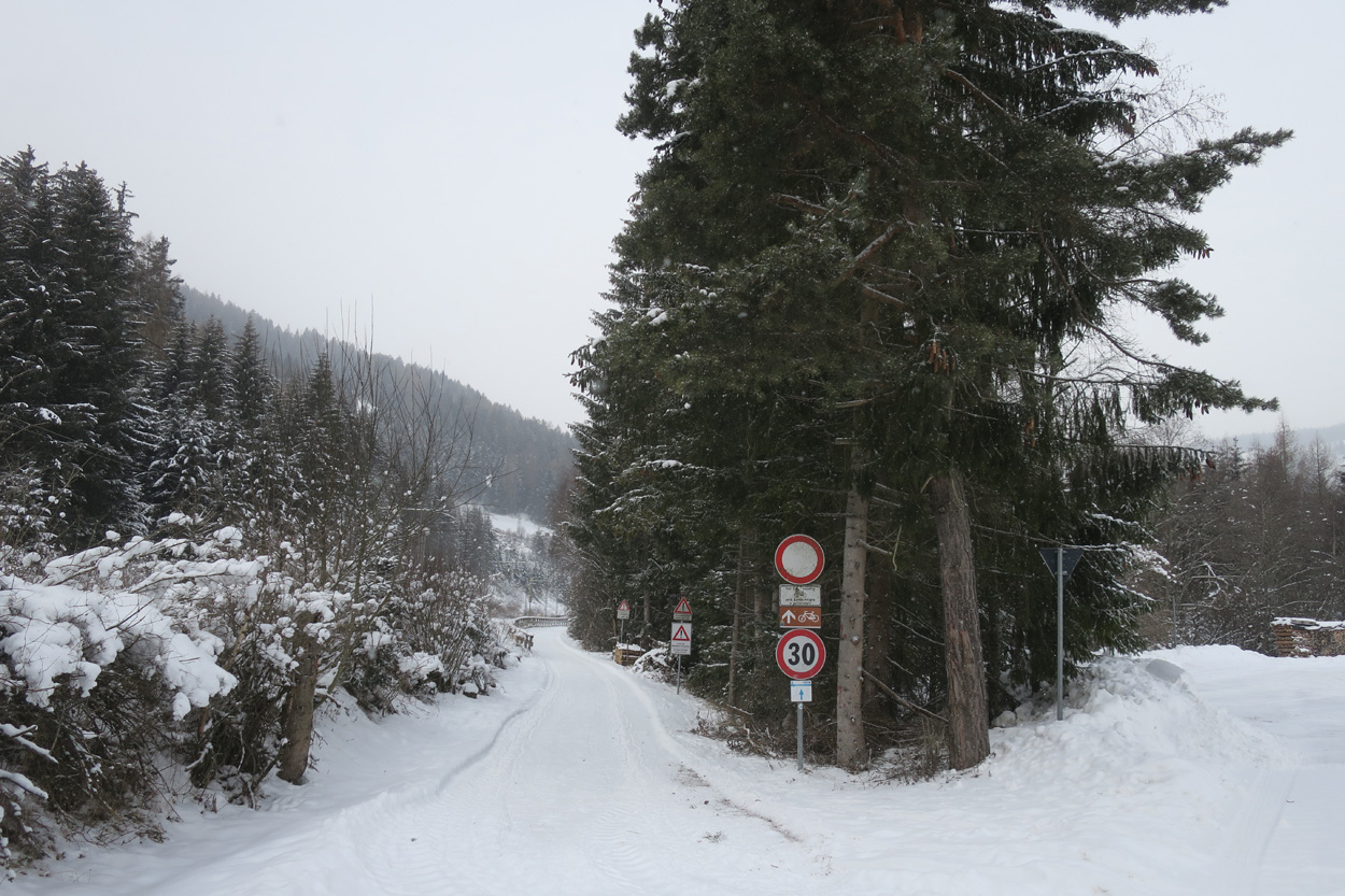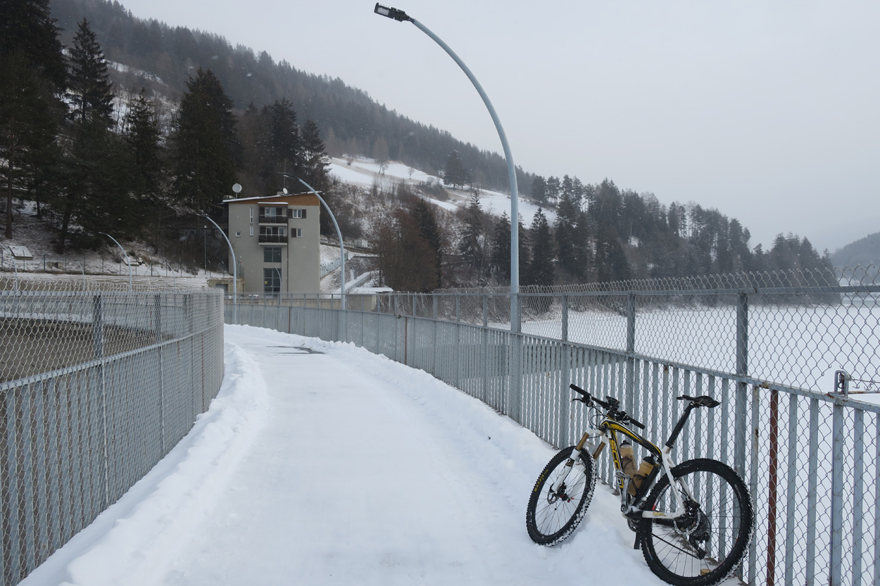 Heute Morgen ging ich in 7.45Uhr ans Morgenessen. Leider hatte ich in der Nacht nicht allzu lange geschlafen, denn ich musste mir noch eine Route ausdenken.... Nach dem sehr guten Morgenessen startete ich dann um 8.30Uhr vor dem Hotel Hohe Gaisl auf knapp 2000m ü M. Zuerst ging es auf der mit Neuschnee bedeckten Strasse (ca. 5 bis 10cm Neuschnee) und dem Winterwanderweg in flottem Tempo hinunter zum Brückele. Die Dame an der Mautstelle Brückele staunte nicht schlecht als Sie mich sah und wünschte mir noch eine schöne Tour. Auf dem weiteren Weg nach Prags konnte ich dann eine Forststrasse nehmen wo zuvor grad eine Skitruppe des Italienischen Militär durchgewandert war. Von Prags nach Welsberg nahm ich dann den offiziellen Radweg. Es war als Loipe präpariert und hatte eine optimale Härte um darauf in hohem Tempo Fahren zu können. Das nächste Teilstück am Olanger Stausee entlang war dann mit einem Traktor grob geräumt worden. Danach ging es über die Staumauer zum Weiler Goste. Hier begann dann nun das Antholztal wo ich abwechslungsweise auf der Nebenstrasse und dem Winterwanderweg nach Antholz Niedertal fuhr. In Antholz Niedertal ist mir beim vorbeifahren noch ein professioneller Bikeshop aufgefallen. Um ca. 11Uhr war ich dann kurz vor Antholz Mittertal, als mir plötzlich der linke Kurbelarm brach. Ich kehrte um und ließ es 2km zurück zum Bike Geschäft rollen. Leider öffnete dieses erst um 13.30 Uhr. Auch per Telefon war niemand zu erreichen. Ich fragte dann im Lebensmittelladen nebenan ob man vielleicht eine Händy Nummer vom Bikeshop hat. Da bekam ich den Tip dass ich im Restaurant daneben fragen soll. Hier traf ich dann die Mountainbike Legende Roel Paulissen der mit einem Kollegen den Laden betreibt. Da meine XTR Kurbel schon sicher 10Jahre alt war und noch für 9Fach Übersetzung war, war es wie ein sechser im Lotto was passendes zu finden. Schlussendlich konnte er dann an einem alten Occasionsbike eine noch passende Kurbel ausbauen und bei mir wieder einbauen. Kurz nach 12Uhr konnte ich dann meinen Trip wieder fortsetzten. Für die rasche Reparatur war ich sehr sehr dankbar, denn ich wollte noch unbedingt den Stallersattel mal im Winter ausprobieren. Auf der Straße radelte ich dann hinauf zum Antholzersee. Dort war wegen eines Biathlon Weltcup gerade der Teufel los.... Nach der Überquerung des gefrorenen Anthohlzersees auf dem Winterwanderweg begann dann der Schlussaufstieg auf der Passtrasse welche als Schlittelpiste gepresst war. Ich merkte bald dass die Piste etwa 50cm vom Rad entfernt am härtesten war. Obwohl es auch hier einwenig Neuschnee (ca.5cm) gab, konnte ich dann bis zur Passhöhe auf 2052m alles fahrend bewältigen. Um 14.30Uhr überschritt ich dann die Staatsgrenze von Südtirol nach Österreich auf dem Pass. Auf dem gespurten Winterwanderweg erreichte ich dann um 14.45 Uhr das Alpengasthaus Obersee. Leider liess hier die Härte des Untergrundes etwas zu wünschen übrig. Im schönen Alpengasthaus konsumierte ich kurz eine Gulaschsuppe und überquerte danach den Obersee. Leider war hier der Weg wegen des Neuschnees zu weich um mit einem normalen Bike fahren zu können. Nach der Seeüberquerung ging es dann abwärts und somit reichte die Schneehärte um auf der Piste fahren zu können. Ab der Stalleralm auf 1968m war dann die Strasse gepfadet. Nun ging es noch das Defreggental bis nach Huben ins Tauerntal hinunter. Im Defreggental konnte ich noch ein paar ganz schöne Abschnitte auf harten Winterwanderwegen machen. Um 17.15 bei Einbruch der Dunkelheit erreichte ich dann Huben. Hier war dann gar nichts los. Auch die Restaurants waren geschlossen. Um 17.40 Uhr fuhr ich dann mit dem letzten Postbus des heutigen Tages durch den Tauerntunnel nach Mittersill im Pinzgau. Hier kam ich dann um 18.30Uhr am Bahnhof an und nahm dann gleich ein Zimmer im gegenüberliegenden Gasthaus Post. Die Chefin war sehr freundlich und bot mir sogar an die Kleider zu waschen.