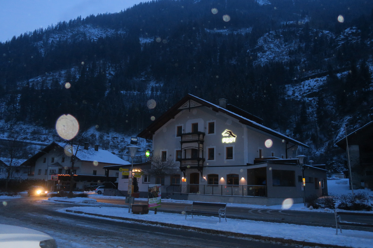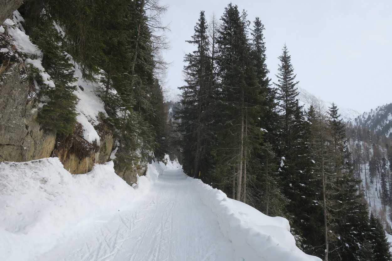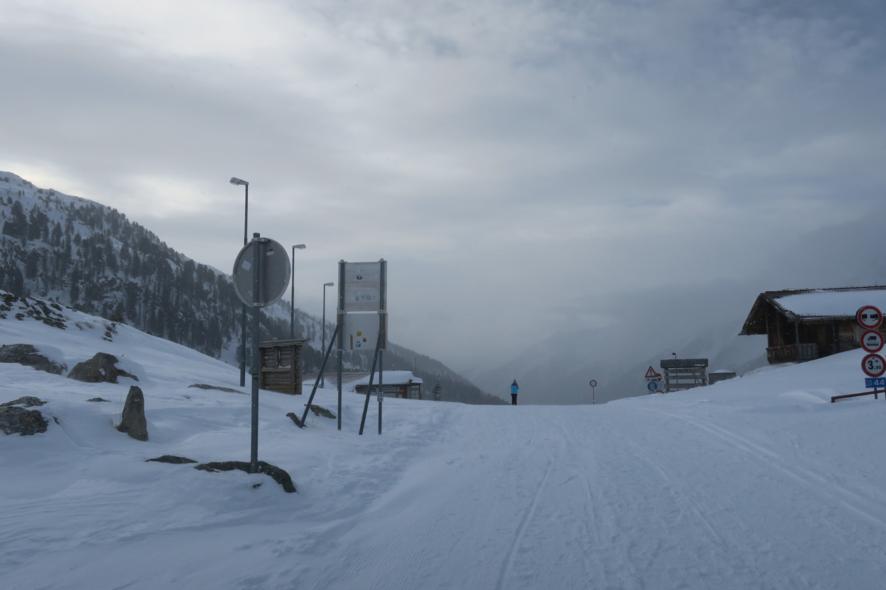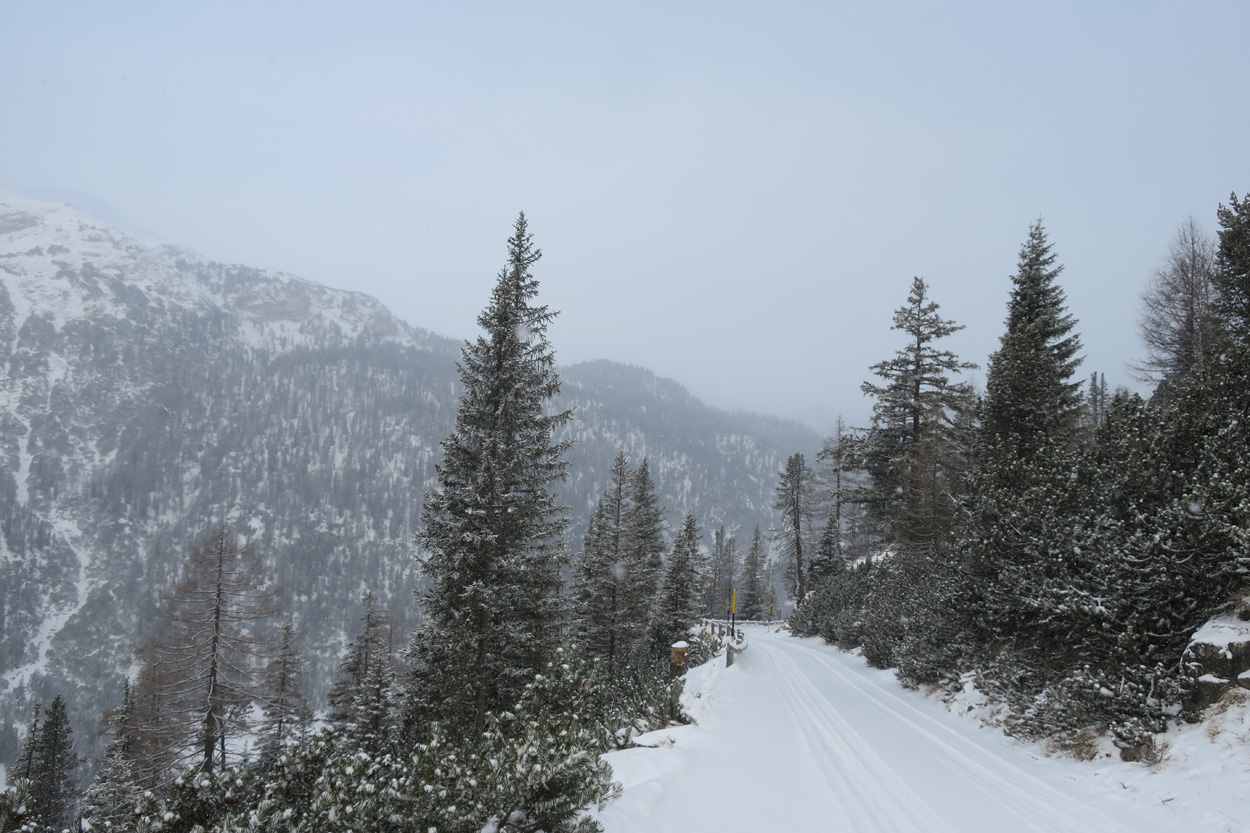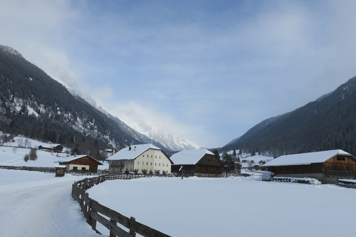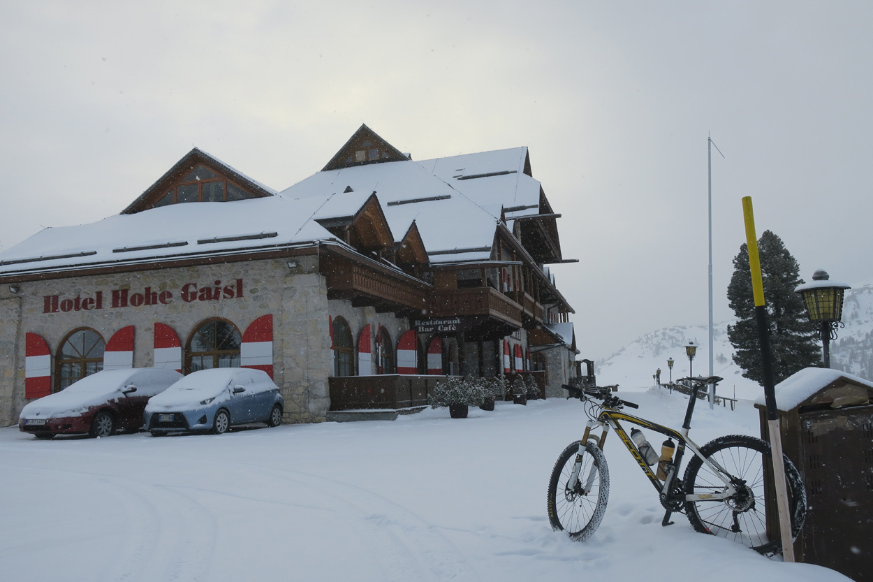 Heute Morgen ging ich in 7.45Uhr ans Morgenessen. Leider hatte ich in der Nacht nicht allzu lange geschlafen, denn ich musste mir noch eine Route ausdenken.... Nach dem sehr guten Morgenessen startete ich dann um 8.30Uhr vor dem Hotel Hohe Gaisl auf knapp 2000m ü M. Zuerst ging es auf der mit Neuschnee bedeckten Strasse (ca. 5 bis 10cm Neuschnee) und dem Winterwanderweg in flottem Tempo hinunter zum Brückele. Die Dame an der Mautstelle Brückele staunte nicht schlecht als Sie mich sah und wünschte mir noch eine schöne Tour. Auf dem weiteren Weg nach Prags konnte ich dann eine Forststrasse nehmen wo zuvor grad eine Skitruppe des Italienischen Militär durchgewandert war. Von Prags nach Welsberg nahm ich dann den offiziellen Radweg. Es war als Loipe präpariert und hatte eine optimale Härte um darauf in hohem Tempo Fahren zu können. Das nächste Teilstück am Olanger Stausee entlang war dann mit einem Traktor grob geräumt worden. Danach ging es über die Staumauer zum Weiler Goste. Hier begann dann nun das Antholztal wo ich abwechslungsweise auf der Nebenstrasse und dem Winterwanderweg nach Antholz Niedertal fuhr. In Antholz Niedertal ist mir beim vorbeifahren noch ein professioneller Bikeshop aufgefallen. Um ca. 11Uhr war ich dann kurz vor Antholz Mittertal, als mir plötzlich der linke Kurbelarm brach. Ich kehrte um und ließ es 2km zurück zum Bike Geschäft rollen. Leider öffnete dieses erst um 13.30 Uhr. Auch per Telefon war niemand zu erreichen. Ich fragte dann im Lebensmittelladen nebenan ob man vielleicht eine Händy Nummer vom Bikeshop hat. Da bekam ich den Tip dass ich im Restaurant daneben fragen soll. Hier traf ich dann die Mountainbike Legende Roel Paulissen der mit einem Kollegen den Laden betreibt. Da meine XTR Kurbel schon sicher 10Jahre alt war und noch für 9Fach Übersetzung war, war es wie ein sechser im Lotto was passendes zu finden. Schlussendlich konnte er dann an einem alten Occasionsbike eine noch passende Kurbel ausbauen und bei mir wieder einbauen. Kurz nach 12Uhr konnte ich dann meinen Trip wieder fortsetzten. Für die rasche Reparatur war ich sehr sehr dankbar, denn ich wollte noch unbedingt den Stallersattel mal im Winter ausprobieren. Auf der Straße radelte ich dann hinauf zum Antholzersee. Dort war wegen eines Biathlon Weltcup gerade der Teufel los.... Nach der Überquerung des gefrorenen Anthohlzersees auf dem Winterwanderweg begann dann der Schlussaufstieg auf der Passtrasse welche als Schlittelpiste gepresst war. Ich merkte bald dass die Piste etwa 50cm vom Rad entfernt am härtesten war. Obwohl es auch hier einwenig Neuschnee (ca.5cm) gab, konnte ich dann bis zur Passhöhe auf 2052m alles fahrend bewältigen. Um 14.30Uhr überschritt ich dann die Staatsgrenze von Südtirol nach Österreich auf dem Pass. Auf dem gespurten Winterwanderweg erreichte ich dann um 14.45 Uhr das Alpengasthaus Obersee. Leider liess hier die Härte des Untergrundes etwas zu wünschen übrig. Im schönen Alpengasthaus konsumierte ich kurz eine Gulaschsuppe und überquerte danach den Obersee. Leider war hier der Weg wegen des Neuschnees zu weich um mit einem normalen Bike fahren zu können. Nach der Seeüberquerung ging es dann abwärts und somit reichte die Schneehärte um auf der Piste fahren zu können. Ab der Stalleralm auf 1968m war dann die Strasse gepfadet. Nun ging es noch das Defreggental bis nach Huben ins Tauerntal hinunter. Im Defreggental konnte ich noch ein paar ganz schöne Abschnitte auf harten Winterwanderwegen machen. Um 17.15 bei Einbruch der Dunkelheit erreichte ich dann Huben. Hier war dann gar nichts los. Auch die Restaurants waren geschlossen. Um 17.40 Uhr fuhr ich dann mit dem letzten Postbus des heutigen Tages durch den Tauerntunnel nach Mittersill im Pinzgau. Hier kam ich dann um 18.30Uhr am Bahnhof an und nahm dann gleich ein Zimmer im gegenüberliegenden Gasthaus Post. Die Chefin war sehr freundlich und bot mir sogar an die Kleider zu waschen.