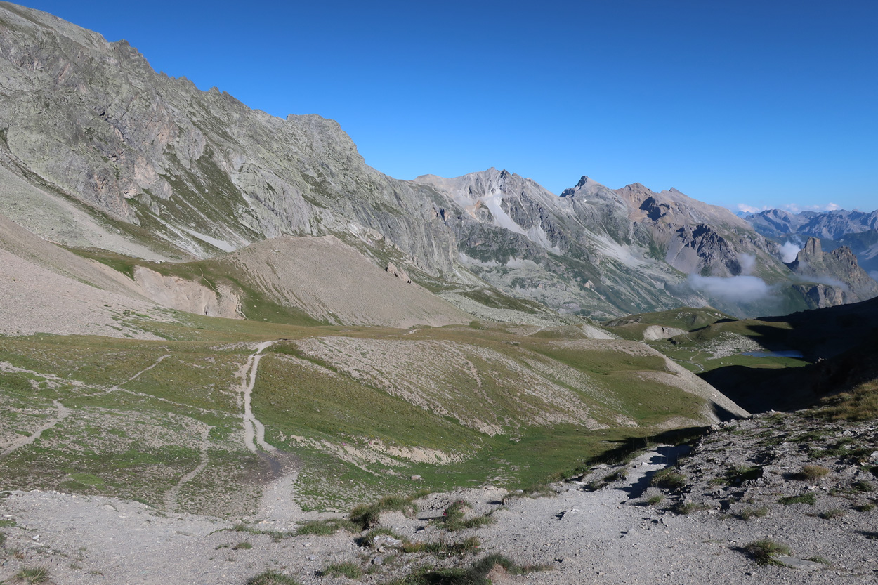 Blick vom Col Girardin auf die bevorstehende Abfahrt und zum Col de