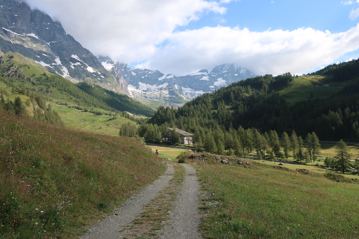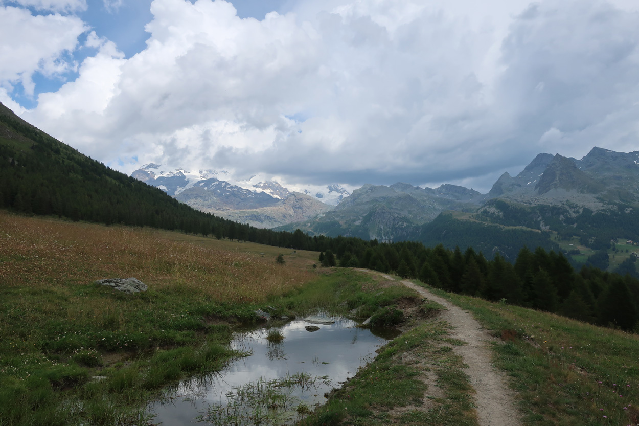 Heute morgen gab es um 7:30 Uhr das Morgenessen. Um 8:45 Uhr ging es dann auf einem Trail ins Zentrum von Breuil-Cervinia. Dort kaufte ich dann noch Saft. Danach ging es ein Stück talabwärts bis etwa auf 1850 Meter über Meer. Dort folgte ich dann etwa 5 km auf einem alten Trasse einer Kraftwerksbahn. Diese ebene Strecke der Felswand entlang mit einigen Tunnels, war sehr spektakulär. Danach ging es hinunter nach Valtournenche. Hier auf etwa 1500m begann dann der nächste Aufstieg über Cheneil und dem Col di Fontana Freddo zum Col de Nanaz auf fast 2800m ü M. Bis zur Wallfahrtskapelle beim Col di Fontana Freddo auf gut 2500m konnte ich fast alles fahren. Danach war ich über den Col de Nanaz etwa eine Stunde am laufen bis ich das Rifugio Grand Tournalin erreichte. Dort kehrte ich dann knapp eine Stunde lang für das Mittagessen ein. Nach dem Mittagessen ging es auf einer Piste 500 Höhenmeter hinunter zur Alp Nanaz Desot. Dort wollte ich dann dem Wasserkanalweg des Rû de Courtod folgen. Doch leider musste ich nach 500 Metern schon wieder umkehren weil da der Weg gesperrt war. Mir blieb nichts anderes übrig, als ein Stück weiter abwärts zu fahren. Glücklicherweise gab es dann eine Umleitung die gut fahrbar war. Jedoch musste ich dann wieder etwa 100 Höhenmeter aufwärts bewältigen, bis ich den Kanal wieder erreichte. Danach konnte ich alles dem wunderschönen Kanal entlang radeln. Zwischendurch gab es mal einen Absatz wo der Kanal dann 100Höhenmeter weiter unten weiterführte. Diese untere Partie des Kanals hatte viele Tunnels und war teilweise aus dem Fels geschlagen. Dieser Abschnitt war früher immer gesperrt. Nach etwa 20 km auf diesem Wasserkanalweg war dann bei der Siedlung Cuignon das lockere Radeln zu Ende. Nun ging es fast ausschließlich auf Trails hinunter zum Talgrund des Aostatals auf etwa 400 Meter über Meer. Von der Ortschaft Torille im Talgrund gab es dann einen Radweg bis Hône. Auf diesem Abschnitt musste ich dann noch etwa 15 Minuten unterstehen wegen eines kräftigen Gewitterregens. In Hône folgten dann noch 7km und 400 Höhenmeter Aufstieg bis zu meinem Tagesziel Pontboset. Dort gab es ein einfaches Hotel mit einem Stern. Zum Abendessen gab es hier ein sehr gutes Menü. Jeder bekam dasselbe. Wenn man nicht genug hatte wurde nachgeschöpft. Von den Gästen war ich heute der jüngste hier. Morgen wird es nochmals eine Tagesetappe im Aostatal geben.
