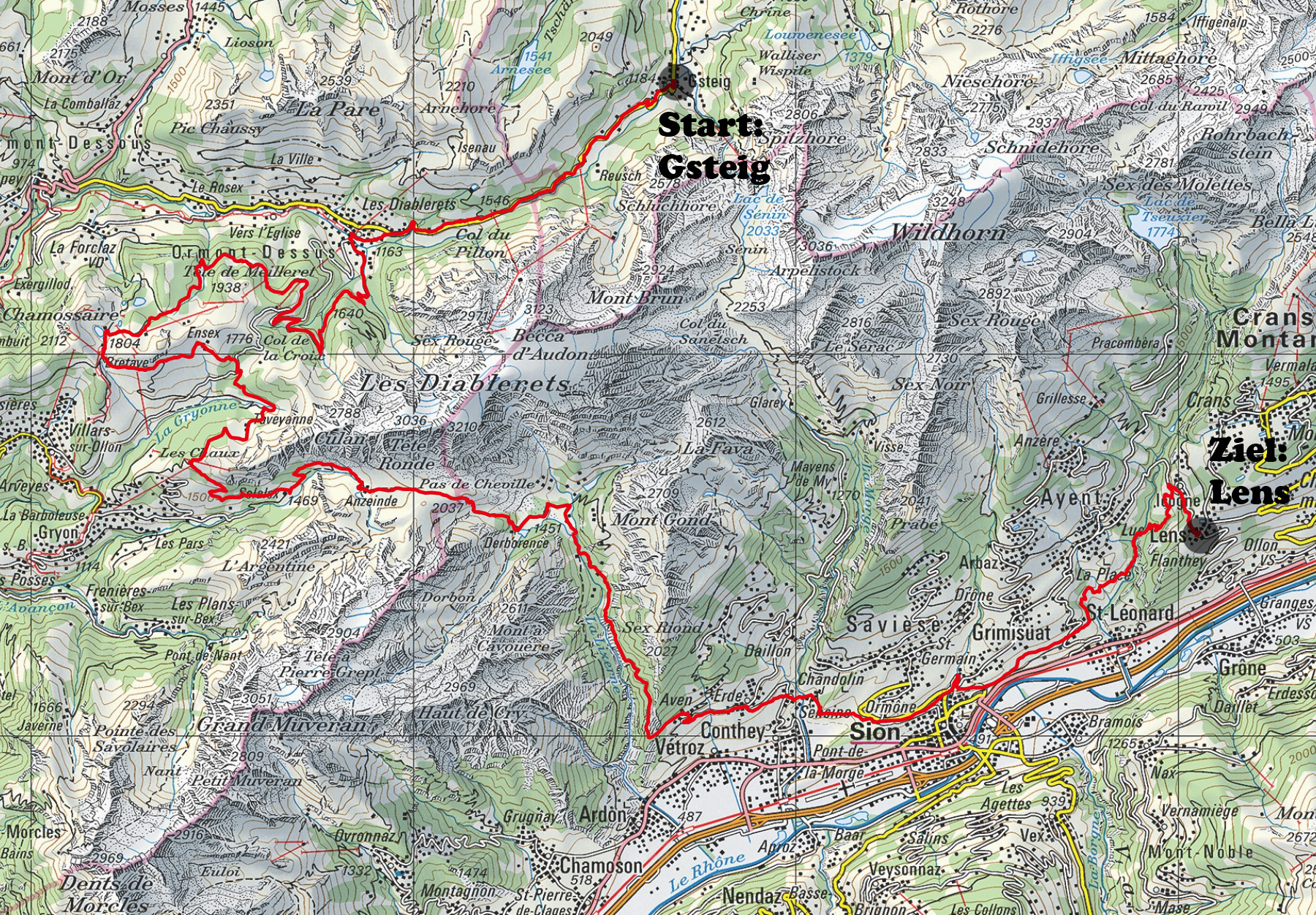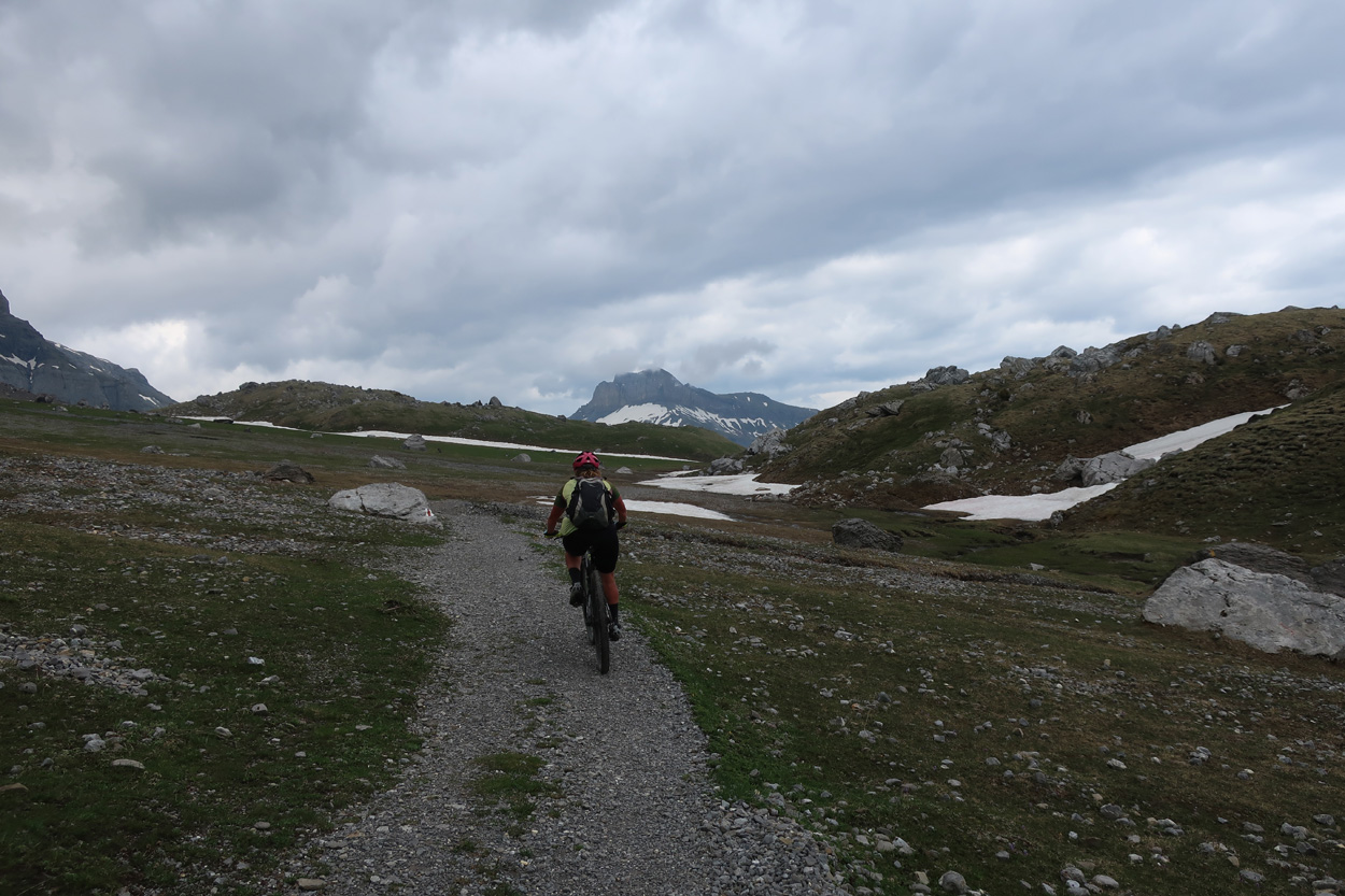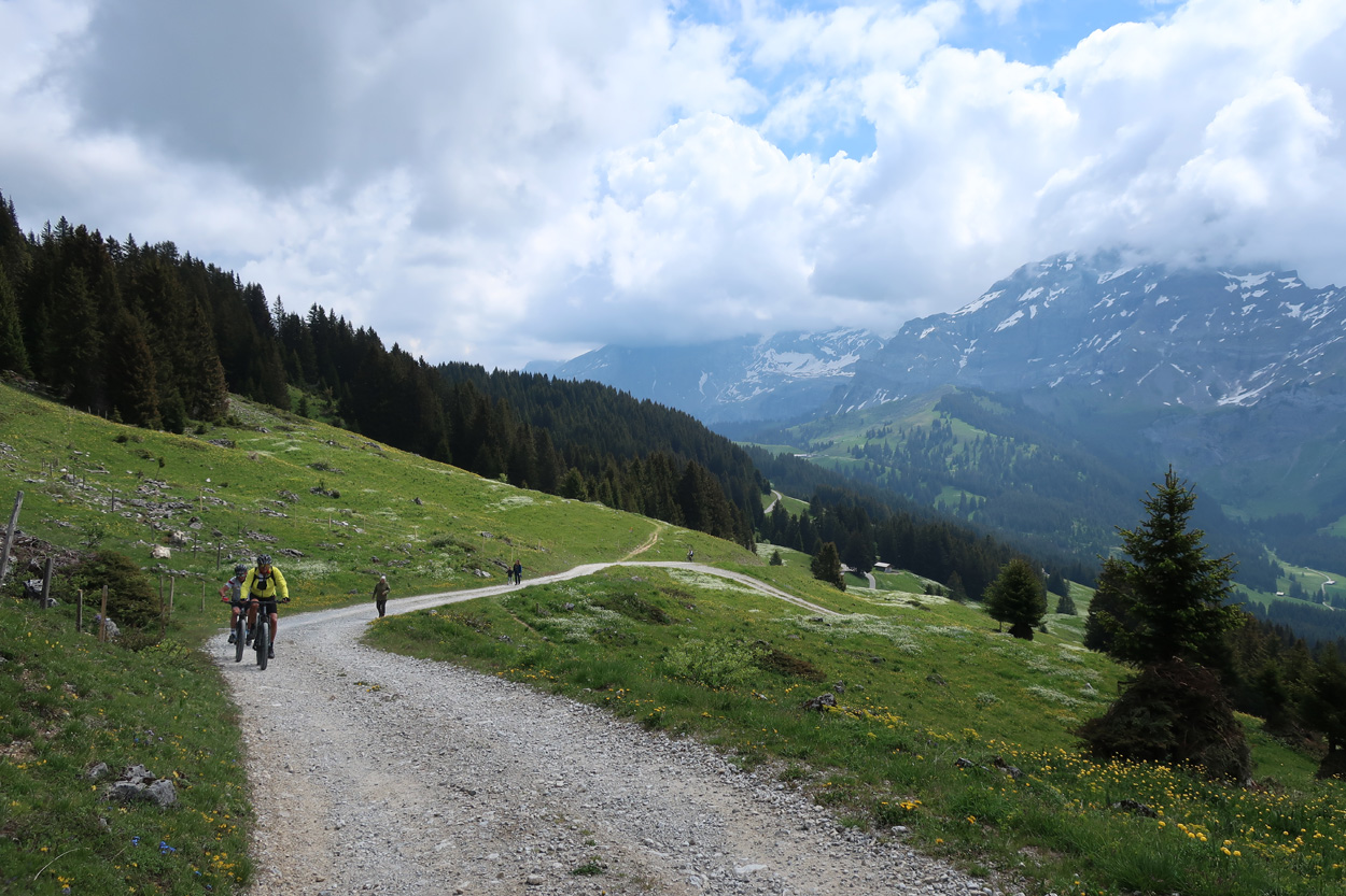 Heute Morgen gab es um 7.30Uhr das Morgenessen. Um 8.30Uhr starteten wir dann. Zuerst ging es auf der Hauptstrasse zum Col du Pillon hinauf. Nach etwa 40min war dann die Passhöhe auf 1550m erreicht. Nach einer kurzen Abfahrt teilweise auf einem Bikeweg erreichten wir dann Les Diablerets. Dort kauften wir dann noch kurz Proviant. Danach ging es auf der Bikeroute zum Col de Bretaye wo wir um 11.30Uhr waren. Da die Bahn wegen der Corona Kriese noch nicht in Betrieb war, war hier oben auf 1800m noch nicht wahnsinnig viel Los. Auf der Bikeroute ging es dann mehr oder weniger auf der Höhe weiter zum Skigebiet Restaurant les Chaux. Dazwischen gab es ein Paar schöne Alpsiedlungen zu bestaunen. Vom Les Chaux aus nahmen wir dann einen tollen Trail hinunter zur Alp La Mérine. Danach folgten wir dann wieder der offiziellen Bikeroute zur Alp Solalex. Dort waren wir um 12.45Uhr. Die beiden Restaurants waren ordentlich besucht und hatten im innern keinen Platz mehr. Darum assen wir dann in der Nähe einen Teil unseres Provinates. Danach ging es auf der teilweise steilen Fahrstrasse zur Alp Anzeinde. Dort kehrten wir dann um 14Uhr in der Hütte kurz ein. Dann ging es noch fahrend bis zum Pas de Cheville auf der Grenze zum Kanton Wallis auf 2037m. Im Abstieg nach Derborence mussten wir dann etwa 30min oder 2/3 der Strecke Laufen. Um 15.45Uhr erreichten wir dann in Derborence wieder die Strasse. Hier machten wir uns dann Gedanken über das Tagesziel. Wir buchten dann ein Hotel in Lens. Nun mussten wir noch etwa 35km und 700Höhenmeter zurücklegen. Zuerst fuhren wir auf der imposanten Strasse mit den vielen kleinen Tunnels nach Aven. In der Nähe von Contey erreichten wir dann den Tiefsten Punkt auf 540m. Durch die Rebberge ging es dann oberhalb Sion weiter zur Bisse de Claveau. Auf der wunderschönen Bisse de Claveau radelten wir dann bis zu dessen Ende bei P.691. Hier folgte dann noch der Schlussaufstieg nach Lens auf 1120m. Um 18.45Uhr erreichten wir dann die Gebuchte Unterkunft mitten auf dem Dorfplatz. Im Hauseigenen Restaurant konnten wir dann noch ein gutes Abendessen geniessen.