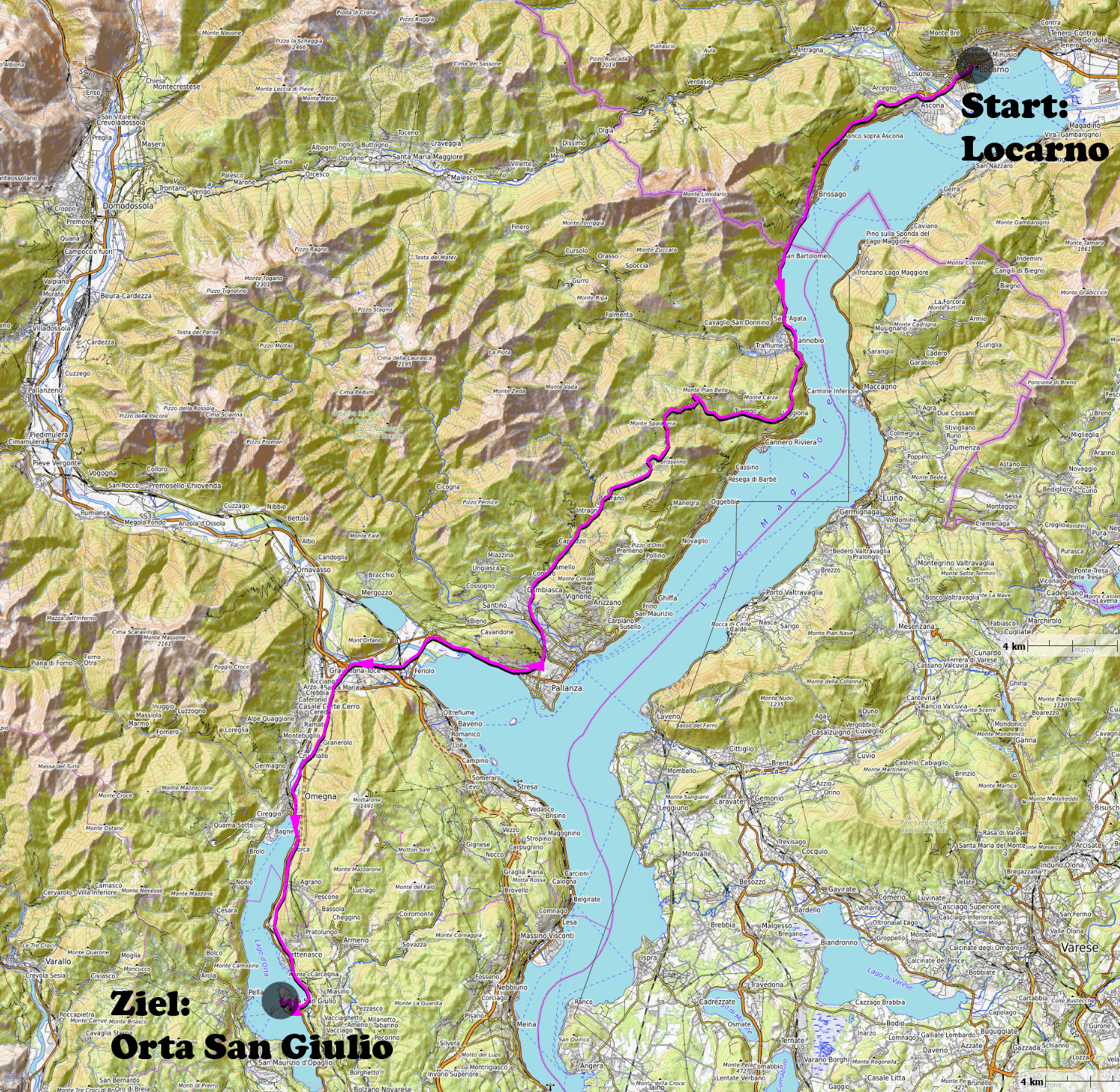 Heute Morgen kam ich pünktlich um 10Uhr mit dem Zug in Locarno an. Als ich dann aus dem Zug ausstieg, musste ich leider Feststellen das mein Hinterrad Platt war. 15min später ging es dann los. Zuerst radelte ich über die Piazza Grande und die Altstadt an den Ortsrand von Locarno. Dort fand ich dann noch ein Bike Shop wo ich einen Ersatzschlauch kaufen konnte. Bei Ascona machte ich dann noch eine Zusatzrunde über den Monte Verita und Ronco um nach Brissago zu kommen. Um 11.45Uhr erreichte ich dann die schöne italienische Ortschaft Cannobio. Dort begann dann der Aufstieg über Viggiona und Trarego zum Il Colle. Auf der Wanderwegpartie von oberhalb von Cannobio nach Viggiona, musste ich dann etwa 10 Minuten laufen. Gegen 14 Uhr hatte ich dann das Pässli Il Colle auf 1230m erreicht. Dort folgte dann eine schöne Offroad Partie hinunter nach Aurano wo es dann auf der Strasse weiter in Richtung Verbania ging. Von hier aus gab es dann einen schönen Naturweg durch das Delta des Flusses Toce nach Gravellona. Hier konnte ich dann über Granerolo abseits des Verkehrs in Richtung Omegna fahren. Von Omegna gab es dann einen sehr schönen und längeren Trail nach Pettenasco. Zum Abschluss des Tages ging es dann noch auf den Sacro Monte di Orta hinauf. Dort besichtigte ich dann noch die Wallfahrtskirche und die umliegenden Kapellen. Bei Sonnenuntergang erreichte ich dann das Zentrum der historischen Ortschaft Orta San Giulia. Nach ausführlicher Besichtigung der Ortschaft nahm ich dann ein Zimmer im Hotel Leon d' Oro direkt am See.
