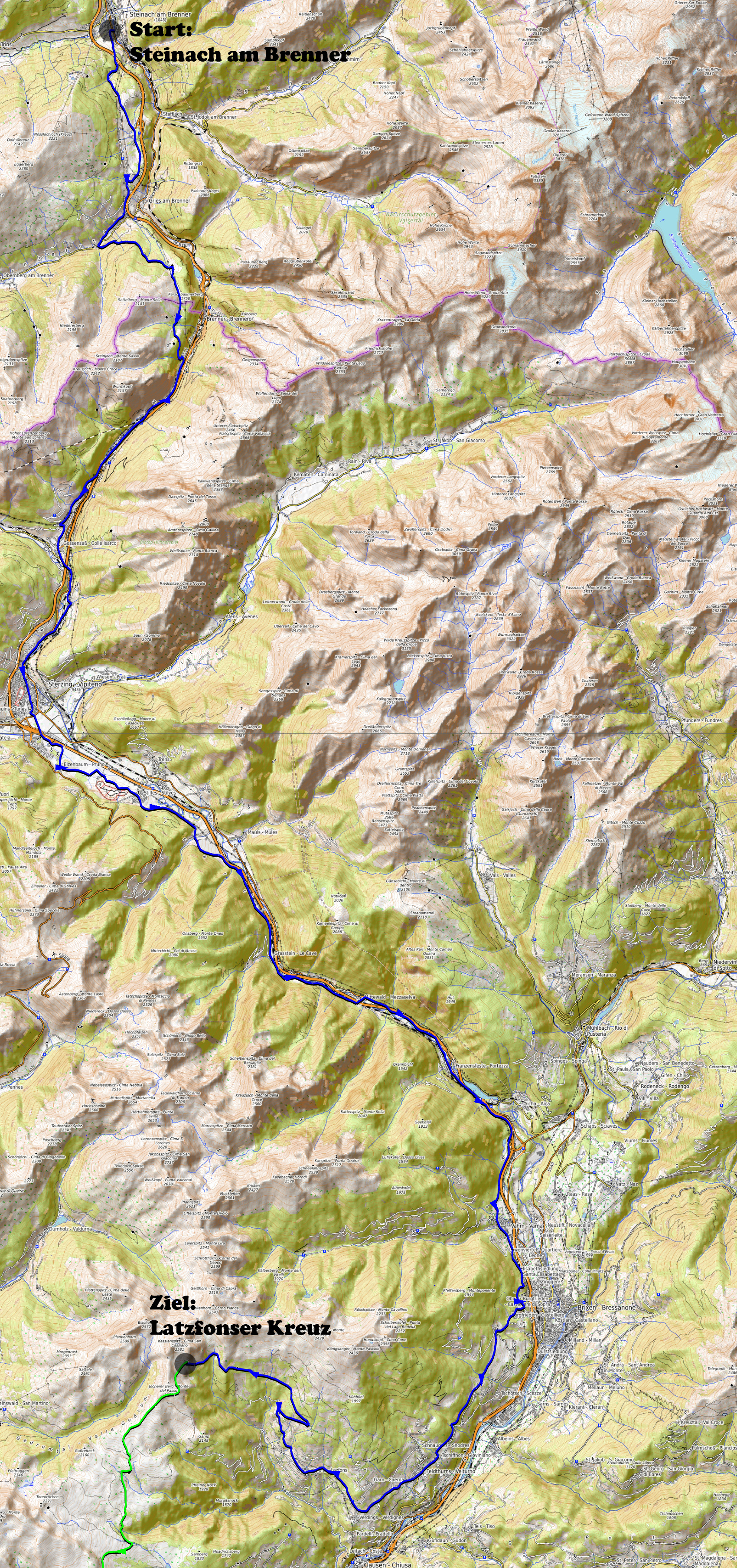 Brennerbad- Schelleberg- Gossensass- Unterried- Sterzing- Elzebaum- Stilfes-