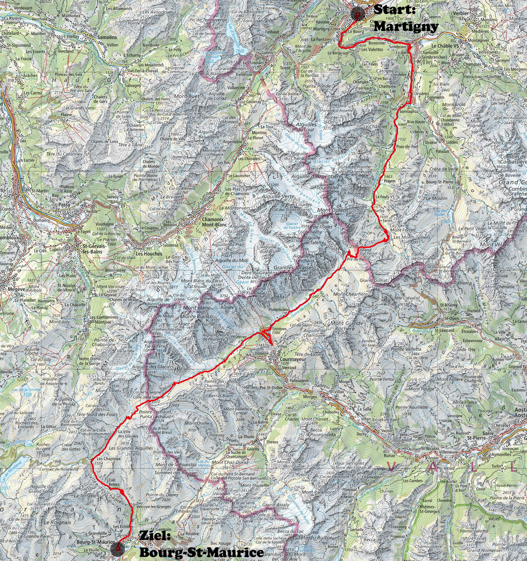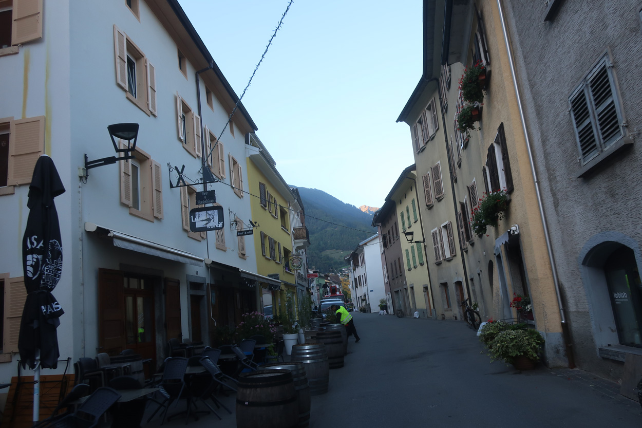 Heute Morgen ging ich um 7.15Uhr zum Morgenessen. Es gab ein gutes Büffet. Nachdem ich dann im Laden gleich neben dem Hitel noch Saft gekauft hatte ging es dann los. Zuerst fuhr ich durch das Stadtzentrum von Martigny und dann noch durch historische Zentrum von Martigny-Bourg. Am Ortsrand von Martigny nahm ich dann die Nationalstrasse bis Bovernier und danach wollte ich auf dieser weiterfahren bis Sembrancher. Der Verkehr wurde mir dann aber bald zu gefährlich so dass ich dann auf den eher mühsamen Wanderweg wechselte. Ich konnte es einfach nicht verstehen dass man auf einer teilweise 3 bis 4 Spurigen Hauptstrasse nicht fähig ist eine Velospur zu machen. In Sembracher ging es dann auf einer Naturstrasse über ein kleines Pässli nach Orsières. Von hieraus ging es dann teilweise auf der Bikeroute nach La Fouly. Dort konnte ich dann um 11.30Uhr nochmals Saft kaufen. Gegen 12Uhr erreichte ich dann das Ende der Asphaltstrasse hinter dem Weiler Ferret. Hier führt dann noch ein schöner Fahrweg bis zur Alp La Peule auf 2070m. Ab hier ging es dann auf dem Wanderweg bis zur Passhöhe des Grand Col Ferret auf 2537m. Der Wanderweg wurde hier vorbildlich zum komplett fahrbaren Biketrail ausgebaut und war wunderprächtig. Um 13.15Uhr erreichte ich dann auf der Passhöhe die Landesgrenze zu Italien. Hier tummelte sich dann gerade noch eine Asiatische Wandergruppe. Die Abfahrt zum Rifugio Elena war dann eher anspruchsvoll (total etwa 5 min Laufen). Vom Rifugio Elena führte dann wieder eine Piste und später eine Teerstrasse nach Entrèves. Hier im Italienischen Val Ferret suchte ich dann um 14Uhr das erste noch geöffnete Restaurant für meine Mittagspause auf. Kurz nach 15Uhr erreichte ich dann Entrèves, die Ortschaft am Mont Blanc. Hier wollte ich dann direkt auf einer Piste ins Val Veny fahren. Diese war aber wegen Bauarbeiten und Steinschlaggefahr gesperrt. Deshalb ging es dann nochmals 100hm weiter talabwärts in Richtung Courmayeur. Dort nahm ich dann die offizielle Straße ins Val Veny. Bis etwa 1800m ü M war sie Asphaltiert. Danach führte eine Naturstrasse zum Rifugio Elisabetta auf 2150m. Im Gegensatz zu früher wurde die Strasse wieder frisch eingekiest so dass sie bestens Fahrbar war. Am meisten erstaunt hatte mich dann aber der weitere Streckenverlauf zum Col de la Seigne. Hier wurde der Weg komplett fahrbar hergerichtet. Zum Teil war aber die Steigung grenzwärtig. Um 17.45Uhr erreichte ich dann auf dem 2515m hohen Pass Frankreich. Nach einer kurzen Pause ging es dann auf dem Flowtrail weiter zur Alp la Villes des Glaciers. Von hieraus waren dann 20km Abfahrt auf dem Asphalt bis Bourg Saint Maurice zurückzulegen. Genau bei Sonnenuntergang um 19.15Uhr erreichte dann die große Ortschaft Bourg Saint Maurice. Hier suchte ich dann nach einem Zimmer und hatte dann beim zweiten Hotel Erfolg. Auch das Abendessen konnte ich dann in diesem kleinen Hotel geniessen. Nach dem Abendessen reparierte ich dann noch einen Schrammen, welchen ich am Hinterreifen eingefangen hatte.