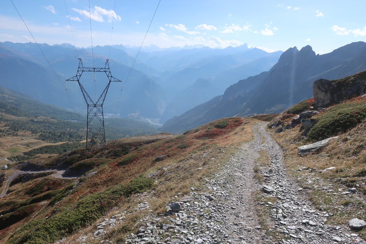 Heute Morgen gab es ein eher einfaches Frühstück. Gegen 8.30Uhr war ich dann startklar. Zuerst ging es dann etwa 15km auf dem offiziellen Radweg bis auf die Höhe der Ortschaft Aime. Dort machte ich dann einen kleinen Aufstieg zum Gehöft les Esserts um länger abseits des Verkehrs sein zu können. Nach der Ortschaft Centron führte dann der Veloweg durch den Fluchtstollen der Nationalstrasse. Nach dem ca. 2km langen Stollen bei der Ortschaft Saint-Marcel, musste ich dann den Rest der Strecke bis Moûtiers ca. 8km auf der Nationalstrasse zurücklegen. Immerhin war der Pannenstreifen, sofern es einen gab, als Velospur markiert. In Moûtiers kaufte ich dann auf dem Markt noch Saft. Danach ging es auf einer Nebenstrasse mit nur sehr wenig Verkehr hinauf nach Saint-Martin-de-Belleville. Dort auf knapp 1400m ü M kehrte ich dann um 12.30Uhr fürs Mittagessen kurz ein. Der Service in diesem Restaurant war sehr speditiv so dass ich nach 45min Pause wieder weiterfuhr. Bis zur Alp Gittamelon 1674m war der Fahrweg dann meist noch aspahltiert. Danach ging er in eine Naturstrasse über, auf welcher ich bis zum Petit Col des Encombres fuhr. Dort auf 2350m Traversierte ich dann auf einem schönen Trail zum le Perronet P.2370 um zusätzliche Höhenmeter auf einer Gegensteigung zu vermeiden. Teilweise auf dem Fahrweg und teilweise auf dem geilen Bikeweg ging es dann hinunter nach Saint-Martin-de-Belleville. Dort im Talgrund, bei einem Steinbruchgelände, begann dann der Aufstieg auf einer Naturstrasse nach Montricher. Von hier aus ging es dann auf einer kleinen Asphaltstraße über den Col d'Albanne nach Albanne und Albanette. Von Albanette ging es dann auf einer für Motorfahrzeuge gesperrten Piste durch einen Steinschlaghang nach Valloire. Für Velos war hier eine Fahrspur freigeräumt. Gegen 18.45Uhr erreichte ich dann Valloire. In diesem Skiort am Fuße des Col de Galibiers gäbe es zur Saison unzählige Hotels, doch zur Zeit war vermutlich nur noch eines davon offen. In diesem nahm ich dann auch ein Zimmer Halbpension. Das Abendessen war hier sehr gut.