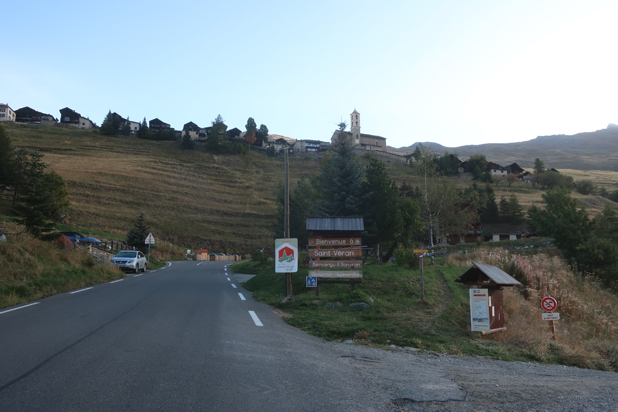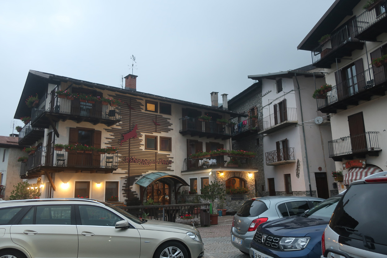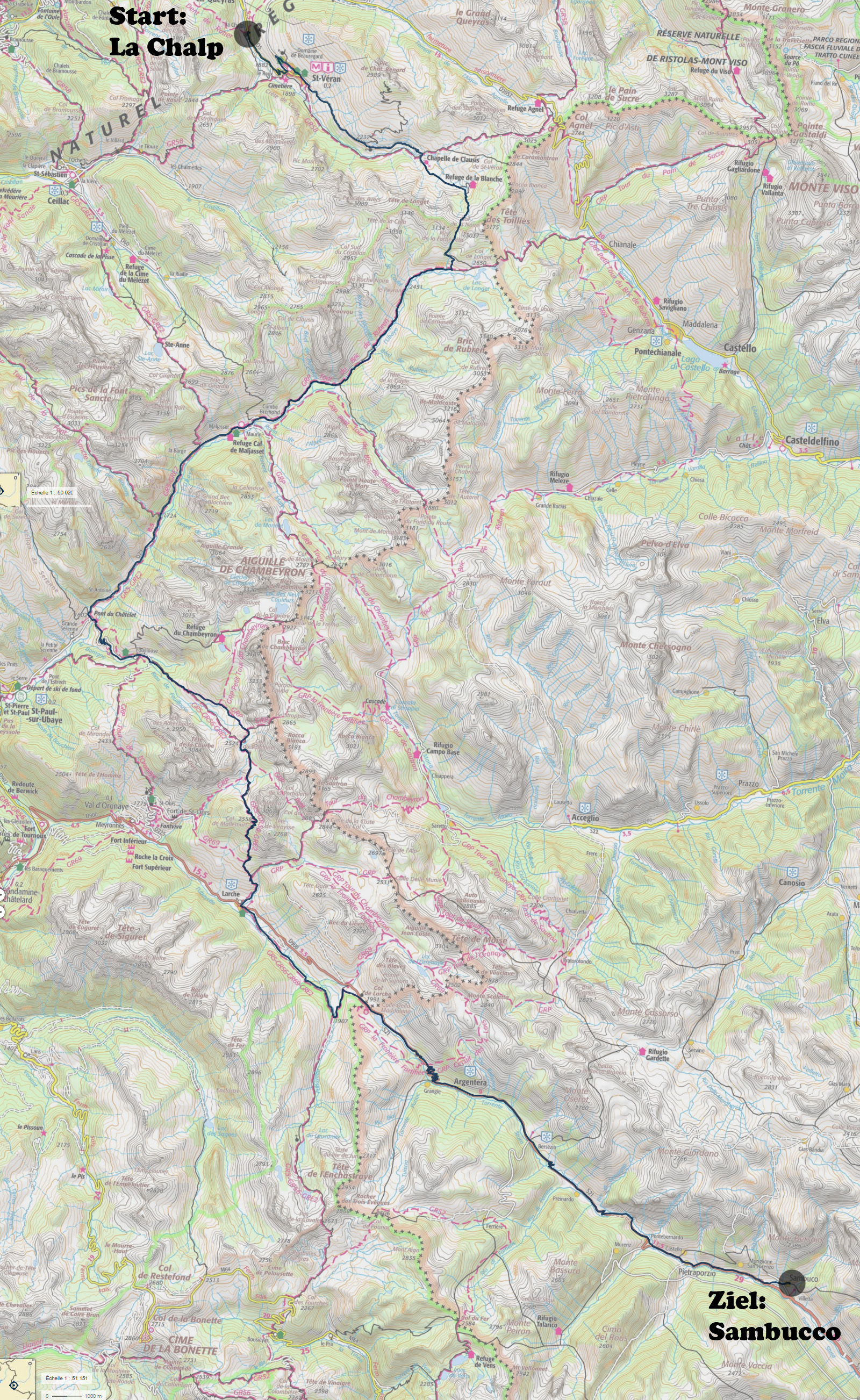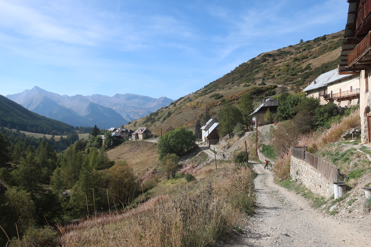 Heute Morgen gab es um 7.30Uhr das einfache Morgenessen. Etwa um 8.30Uhr startete ich dann. Zuerst ging es auf der Strasse hinauf nach Saint- Veran. Dort auf 2050m ü M war jetzt kaum was los und die Geschäfte und Restaurants waren geschlossen. Zum Glück hatte ich den Gastgeber der Unterkunft noch um Brot gebeten. Danach fuhr ich auf einer Naturstrasse bis zum Refuge de la Lac Blanc auf 2500m. Ab hier führte dann ein Wanderweg hinauf zum Col de la Noir. Hier war ich dann etwa eine Stunde am Laufen bis ich den Pass und den höchsten Punkt dieser Tour auf 2955m erreichte. Nun folgte eine fast endlos lange Trailabfahrt von ca.10km länge bis Maljasset. Fast alles war hier gut fahrbar. Die Ruhe wurde hier, in dieser fast unberührten Wildnis, nur kurz durch 2 tieffliegende Kampfjets abrupt unterbrochen. Etwa um 12.30Uhr erreichte ich dann das Alpdorf Maljasset wo sich die Gastbetriebe bereits im Winterschlaf befanden. Danach ging es weiter talabwärts bis zur imposanten Pont du Châtelet auf 1600m. In der Nähe dieser Brücke, bevor dann der Aufstieg nach Fouillouse begann, machte ich dann am Straßenrand Pause und verspeiste das Brot und den Rest des Salamis. Danach ging es weiter nach Fouillouse, wo ich um 14Uhr ankam. Das Hotel hier war geschlossen. Aber wenige Meter weiter gab es tatsächlich noch ein offenes Gasthaus mit dem ich nicht gerechnet hätte. Hier kehrte ich dann noch schnell für Getränke und Kuchen ein Danach ging es weiter zum Valon de la Plate Lombarde P. 2535. Im Aufstieg zu diesem Pässli war ich dann insgesamt etwa 10 bis 15min am Laufen. Kurz vor 16Uhr erreichte ich dann den Pass. Danach ging es kurz auf 2363m hinunter wo dann der nächste Aufstieg auf einer gut fahrbaren alten Militärstrasse zum Col de Mallemort auf 2558m begann. Dieses Pässli welches oberhalb einer Militäruine war, erreichte ich dann gegen 16.45Uhr. Von hieraus ging es dann auf der offiziellen Bikeroute hinunter nach Larche auf 1670m. Diese Trailabfahrt war recht steil und der Schotter war etwas rollig aber für mich fast durchgehend fahrbar. Von Larche aus führte dann eine Bikeroute abseits der Strasse zum knapp 2000m hohen Col de Lache wo ich dann kurz nach 18Uhr wieder auf Italienisches Territorium kam. Da noch etwa 24km bis zu meinem Tagesziel Sambucco zurück zulegen waren, fuhr ich dann die nur schwach befahrene Transithauptstrasse hinunter. Um 19Uhr erreichte ich dann nach einer kurzen Gegensteigung das sehr gute Hotel della Pace im Zentrum von Sambucco. Hier gab es dann ein sehr gutes und großzügiges Abendmenü und ein wunderschönes Zimmer für 85€ mit Halbpension.