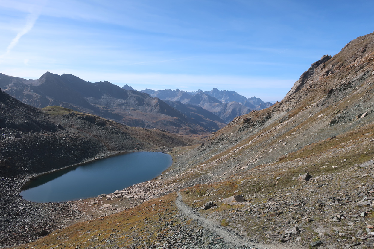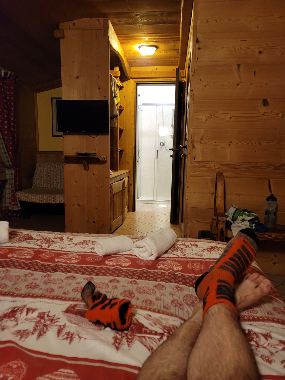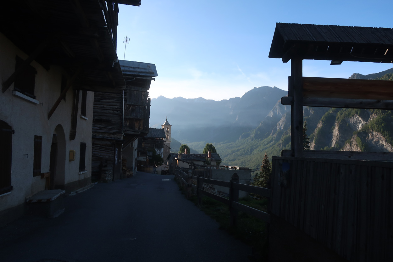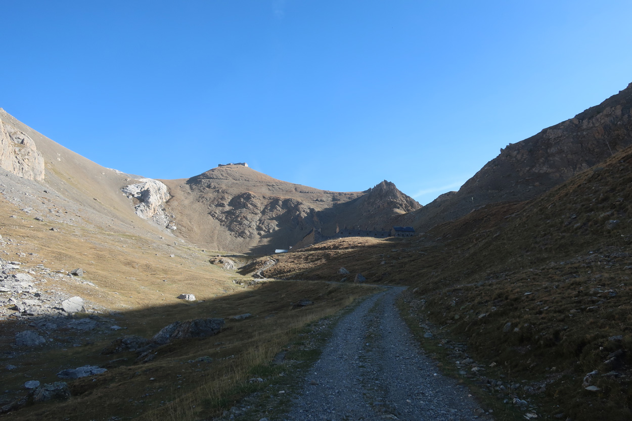 Heute Morgen gab es um 7.30Uhr das einfache Morgenessen. Etwa um 8.30Uhr startete ich dann. Zuerst ging es auf der Strasse hinauf nach Saint- Veran. Dort auf 2050m ü M war jetzt kaum was los und die Geschäfte und Restaurants waren geschlossen. Zum Glück hatte ich den Gastgeber der Unterkunft noch um Brot gebeten. Danach fuhr ich auf einer Naturstrasse bis zum Refuge de la Lac Blanc auf 2500m. Ab hier führte dann ein Wanderweg hinauf zum Col de la Noir. Hier war ich dann etwa eine Stunde am Laufen bis ich den Pass und den höchsten Punkt dieser Tour auf 2955m erreichte. Nun folgte eine fast endlos lange Trailabfahrt von ca.10km länge bis Maljasset. Fast alles war hier gut fahrbar. Die Ruhe wurde hier, in dieser fast unberührten Wildnis, nur kurz durch 2 tieffliegende Kampfjets abrupt unterbrochen. Etwa um 12.30Uhr erreichte ich dann das Alpdorf Maljasset wo sich die Gastbetriebe bereits im Winterschlaf befanden. Danach ging es weiter talabwärts bis zur imposanten Pont du Châtelet auf 1600m. In der Nähe dieser Brücke, bevor dann der Aufstieg nach Fouillouse begann, machte ich dann am Straßenrand Pause und verspeiste das Brot und den Rest des Salamis. Danach ging es weiter nach Fouillouse, wo ich um 14Uhr ankam. Das Hotel hier war geschlossen. Aber wenige Meter weiter gab es tatsächlich noch ein offenes Gasthaus mit dem ich nicht gerechnet hätte. Hier kehrte ich dann noch schnell für Getränke und Kuchen ein Danach ging es weiter zum Valon de la Plate Lombarde P. 2535. Im Aufstieg zu diesem Pässli war ich dann insgesamt etwa 10 bis 15min am Laufen. Kurz vor 16Uhr erreichte ich dann den Pass. Danach ging es kurz auf 2363m hinunter wo dann der nächste Aufstieg auf einer gut fahrbaren alten Militärstrasse zum Col de Mallemort auf 2558m begann. Dieses Pässli welches oberhalb einer Militäruine war, erreichte ich dann gegen 16.45Uhr. Von hieraus ging es dann auf der offiziellen Bikeroute hinunter nach Larche auf 1670m. Diese Trailabfahrt war recht steil und der Schotter war etwas rollig aber für mich fast durchgehend fahrbar. Von Larche aus führte dann eine Bikeroute abseits der Strasse zum knapp 2000m hohen Col de Lache wo ich dann kurz nach 18Uhr wieder auf Italienisches Territorium kam. Da noch etwa 24km bis zu meinem Tagesziel Sambucco zurück zulegen waren, fuhr ich dann die nur schwach befahrene Transithauptstrasse hinunter. Um 19Uhr erreichte ich dann nach einer kurzen Gegensteigung das sehr gute Hotel della Pace im Zentrum von Sambucco. Hier gab es dann ein sehr gutes und großzügiges Abendmenü und ein wunderschönes Zimmer für 85€ mit Halbpension.