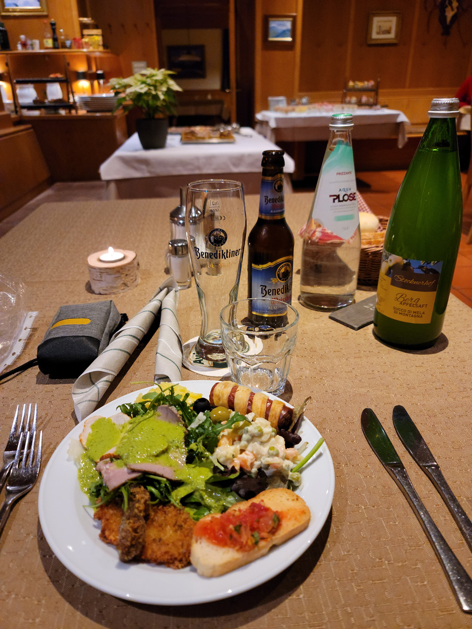 Heute Morgen gab es im Gasthaus auf der Sattelbergalm ein wunderbares Frühstück. Etwa um 8.15Uhr startete ich dann mit der Abfahrt auf der Skipiste nach Gries. Die Skipiste war für mich mit der nötigen Vorsicht gut fahrbar. Von Gries ging es dann auf der Hauptstrasse zum Brennerpass, wo ich um 9.15Uhr die Staatsgrenze zum Südtirol überfuhr. Da alle Radwege nicht vom Schnee geräumt oder präpariert waren, blieb mir nichts anderes übrig als auf der nur schwach befahrenen Hauptstrasse nach Sterzing zu radeln. Das schöne Städtchen Sterzing erreichte ich dann um 9.45Uhr. Leider war es in der Region Sterzing sehr kalt da sich hier wohl ein Kaltluftsee bildetete. Die folgenden Radwege waren zum Teil sehr vereist so das Spikesreifen kein Luxus gewesen wären. Aber mit der nötigen Vorsicht ging es auch mit meinen normalen Reifen. Da ich dann irgendwann genug von eher mühsamen Schneebedeckten Velowegen hatte, nahm ich dann bei der Sachsenklemme wieder die Hauptstrasse bis Franzensfeste. Ab hier war es dann schneefrei. Auf der Radroute mit Trailabschnitten ging es dann hinunter zum Kloster Neustift wo ich noch kurz in die prunkvolle Basilika schaute. Auf dem Weg zu diesem Kloster hatte ich noch Ausblick auf die Baustelle des Brenner Basistunnels wo soeben eine riesige Tunnelbohrmaschiene zusammengebaut wurde. Etwa um 12Uhr erreichte ich dann Brixen. Dort suchte ich dann gegenüber des Domes ein Bäckerei Cafe für die Mittagspause auf. Danach ging es dann noch ein Stück der Eisack entlang, ehe dann beim Weiler Mahr der lage Aufstieg über Latzfons in Richtung Stöffelhütte begann. In der letzten Ortschaft Latzfons auf 1150m hatte ich dann dank dem gutmütigen Besitzers des Lebensmittelladen, noch die Gelegenheit vor der offiziellen Öffnungszeit, Saft zu kaufen. Danach folgte dann der Aufstieg in Richtung Jochalm und Stöfflhütte. Bis auf eine Höhe von 1650m war das kleine Asphaltsträsschen schneefrei. Dort ging es dann in eine gut präparierte Schneepiste über, welche ich gut fahren konnte. Auf etwa 2000m begenete mir dann noch ein anderer Mountainbiker. Etwa um 16.10 Uhr erreichte ich dann die sehr schöne Stöfflhütte welche jedoch jeweils Montags geschlossen ist. Auf der 5km entfernten Vilanderer Alm fragte ich dann um 16.30Uhr bei meiner favorisierten Unterkunft noch für ein Zimmer an. Doch leider war man hier anscheinend voll. Ich entschied mich dann das volle Programm mit dem Höhenweg am Rittnerhorn entlang bis nach Pemmern bei Oberbozen durchzuziehen. Etwa bei Einbruch der Dunkelheit war ich dann auf der höchsten Stelle auf gut 2150m ü M. Hier montierte ich dann noch das Licht und zog noch alle Kleider an die ich im Rucksack hatte. In ordentlichem Tempo ging es dann auf dem Winterwanderweg, auf der Skipiste und am Schluss auf der Rodelbahn hinunter nach Pemmern wo sie die Talstation der Skianlagen befand. Da ich grad kein Händyempfang hatte um noch weitere Unterkpnfte zu finden, checkte ich dort gleich beim erst besten Schuppen ein. Hier im Hotel zum Zirm konnte ich dann ein wunderbares Abendessen vom Buffet geniessen.