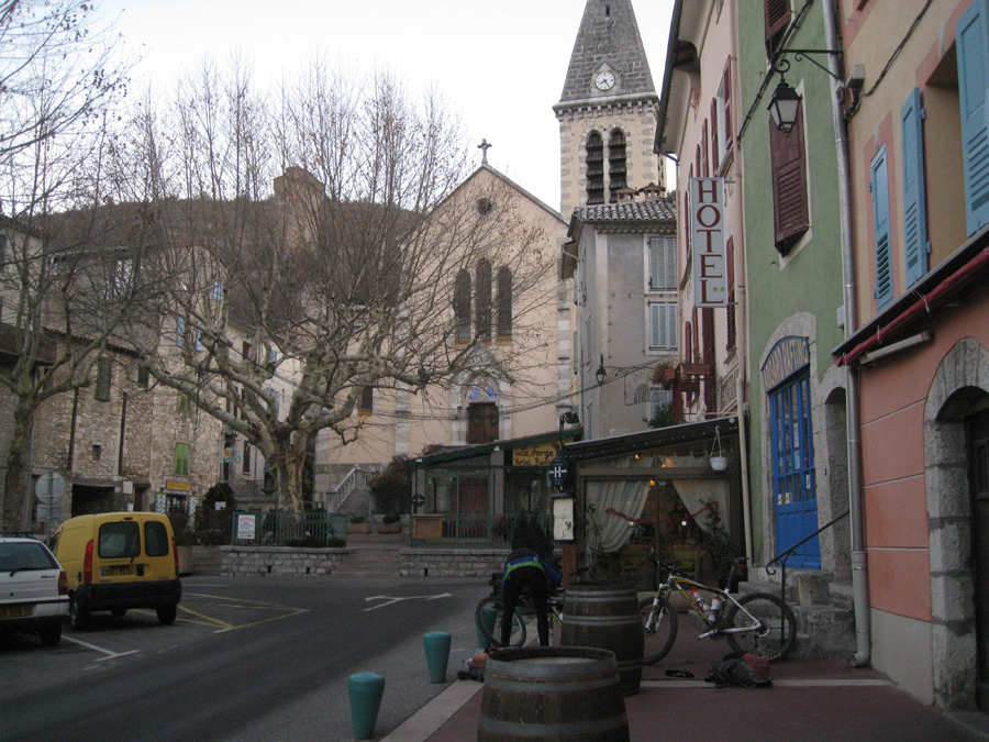 kurz vor dem Start im Zentrum von Castellane vor dem Hotel