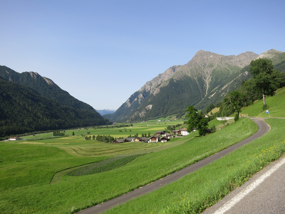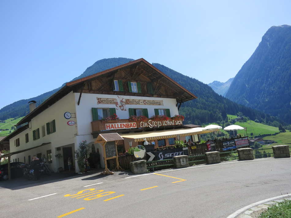 Heute morgen wollte ich um 7.15uhr das Frühstück nehmen doch um 7 Uhr als der Wecker abging drehte ich mich nochmals um... .und schon war es 8Uhr. Mit dieser Verspätung ging es mehrheitlich offroad hinunter nach Sterzing. Dort nahm ich um 10Uhr den Aufstieg zum Rinner Sattel auf 2031m in Angriff. Ich fuhr dabei durch das fast verkehrsfreie Jaufental. Beim Rinnersattel handelt es sich um eine 1.5km westlich des Jaufenpass liegende alternative für das Bike. Für die Abfahrt nach St. Leonhard nahm ich fast ausschließlich varianten zur Hauptstraße. Um ca 14.00uhr erreichte ich dann auf einem tollen Radweg das Stadtzentrum von Meran. Nun ging es auf dem Radweg das Vinschgau hinauf. Anfänglich hatte ich noch angenehmen Rückenwind doch lange dauerte dieser nicht an. Es war wiederum einiges über 30°C so dass auch ich mühe hatte ein anständiges Tempo zu halten. Um 17.20uhr hatte ich in Prad das Letzte mal Saft gekauft und startete mit dem langen Aufstieg Richtung Stilfserjoch. Anfänglich gab es sehr viel Vehrkehr, doch mit der fortschreitenden Tageszeit nahm er laufend ab. Um 19.10Uhr wollte ich im Gasthoft Franzenshöhe auf 2200m ein Zimmer nehmen. Doch in diesem als sehr Gut Bewerteten Haus war mittlerweilen alles voll. Mir blieb somit nichts anderes übrig als die Restlichen 550hm auch noch zu fahren. Um 20uhr habe ich dann den Pass erreicht und im best bewerteten Hotel ein Zimmer genommen. Wirklich moderne Hotels gab es hier oben nicht. Doch immerhin liegt es mit 65€HP im Rahmen und zu essen gab es auch genug. Das beste: das W-Lan Modem liegt gerade vor meinem Zimmer und Frühstück gibt es ab 6.30Uhr.