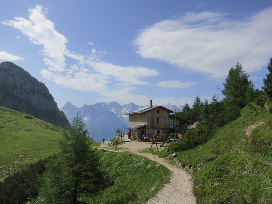 Im Aufstieg zum Passo Sesis, Blick auf das Rifugio Calvi