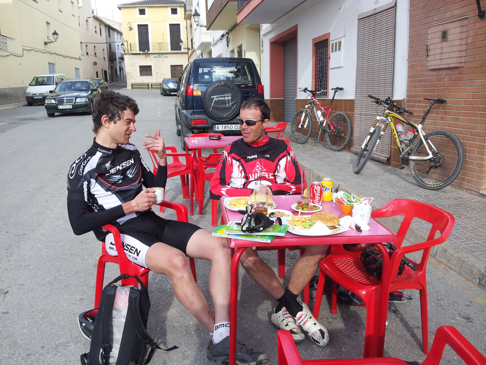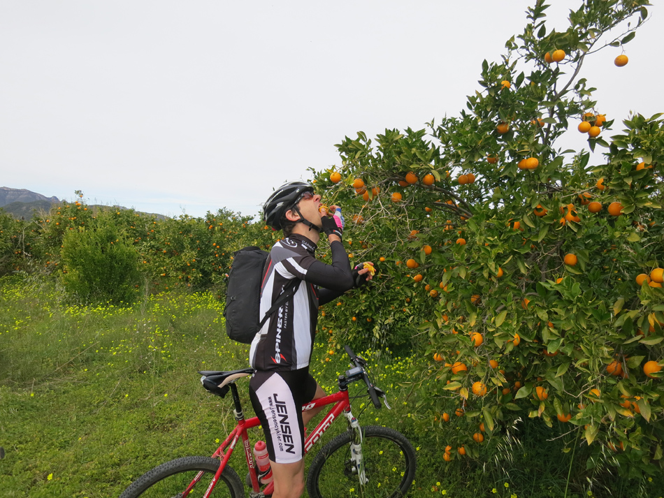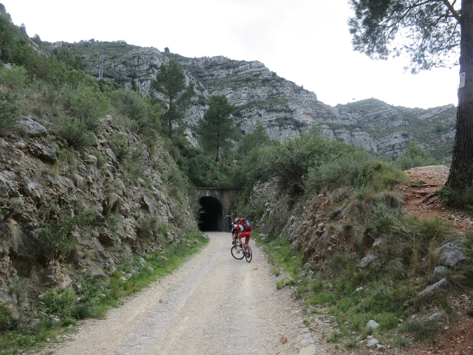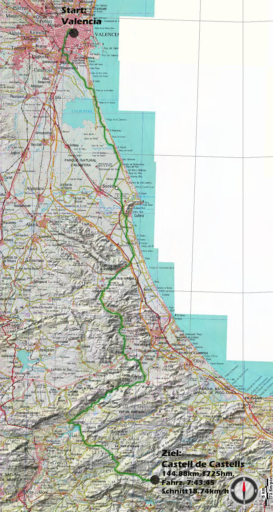 Gestern Abend liess ich es sein den Wecker zu stellen, da wir erst um 22.00Uhr statt um 21uhr in Valencia ankamen. Daher erwachte ich erst um 8 Uhr. Das folgende Frühstück in unserem 4****Hotel Husa Dimar war Sehr gut. Gut gesättigt starteten wir um 9uhr. Es gab zuerst eine kleine Stadtrundfahrt und dann besuchten wir noch den Spanischen Sitz meines Arbeitgebers am Stadtrand. Wir waren froh endlich ausserhalb der Stadt Valencia zu sein und folgten darauf einem schönen Küstenweg durch den Albuferra Naturpark. Nach der Mitagspause in Tavernes de Valldigna war es dann vorbei mit den hässlichen Küstenstädten. Durch Orangenplantagen radelten wir langsam aber sicher ins Gebirge. Ausserhalb der Ortschaft Villalonga folgte dann ein altes ca. 20km langes Bahntrasse in einem Tiefen Taleinschnitt, welchem wir bis Beniarres Folgten. Für mich war das das erste Highlight des Heutigen Tages. Nach dem Besuch einer Bar wo es Pommes und Hamburger gab, ging es noch ins Serra de Almundaina Gebirge auf gut 900m ü Meer. Genau bei Sonnenuntergang erreichten wir in Castell de Castells ein gutes 2**Hotel. Wettermässig war es am Morgen etwas milchig, im Verlaufe des Tages kam aber immer mehr die Sonne zum Vorschein.