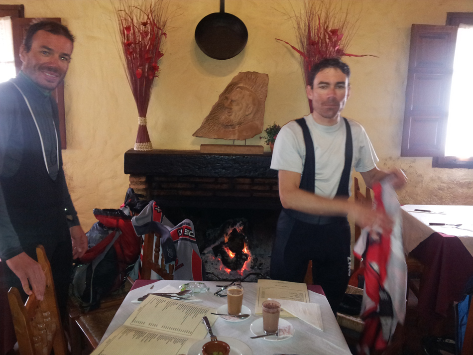 Heute morgen haben wir um 8.30Uhr das Frühstück bestellt. Viel gab es jedoch nicht. Bei wolkenverhangenem Himmel starteten wir Richtung in Richtung Sierra de les Nieves Gebirge. Der Name des Gebirges bedeutet auf Deutsch Schneegebirge und tatsächlich lagen dessen Gipfel in Neuschnee. Je mehr wir in die Gebigswildniss kamen desto mehr begann es dann zu Regnen. Es ging bis 1300m ü M und war sehr unangenehm. Gegen 14uhr erreichten wir dann die Nationalstrasse wo es dann sogar ein Restaurant gab. Der Kellner spürte was wir wollten und führte uns direkt an den Tisch vor dem Cheminee. Während wir das Mittagsmenu vertilgten, tauten wir wieder auf. Eine Stunde später ging es weiter nach Ronda. Die Stadt auf dem Felsen mit der berühmten Brücke war eindrücklich. Der Letze Abschnitt nach Cortes de la Frontera nahmen wir getrennt in Angriff. Ich fuhr mit Heini eine Offroadvariante bei der es im Regen viele Bäche und hohe Zäune zu überklettern gab. Beat war gescheiter er nahm die Asphaltvariante. Nun um 19.15 Uhr erreichten wir auch unser vereinbartes Ziel.