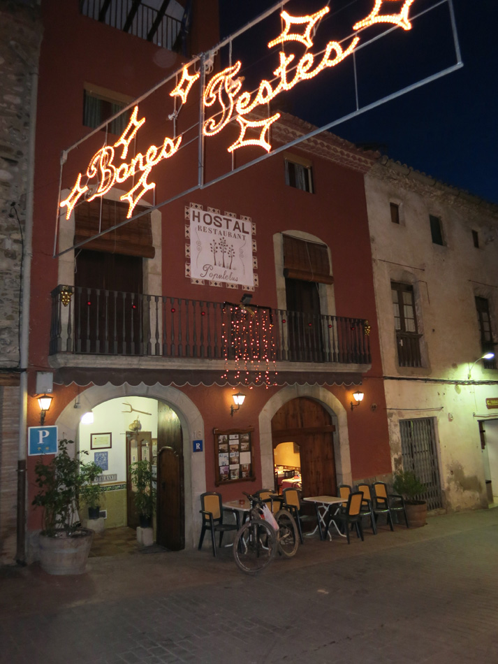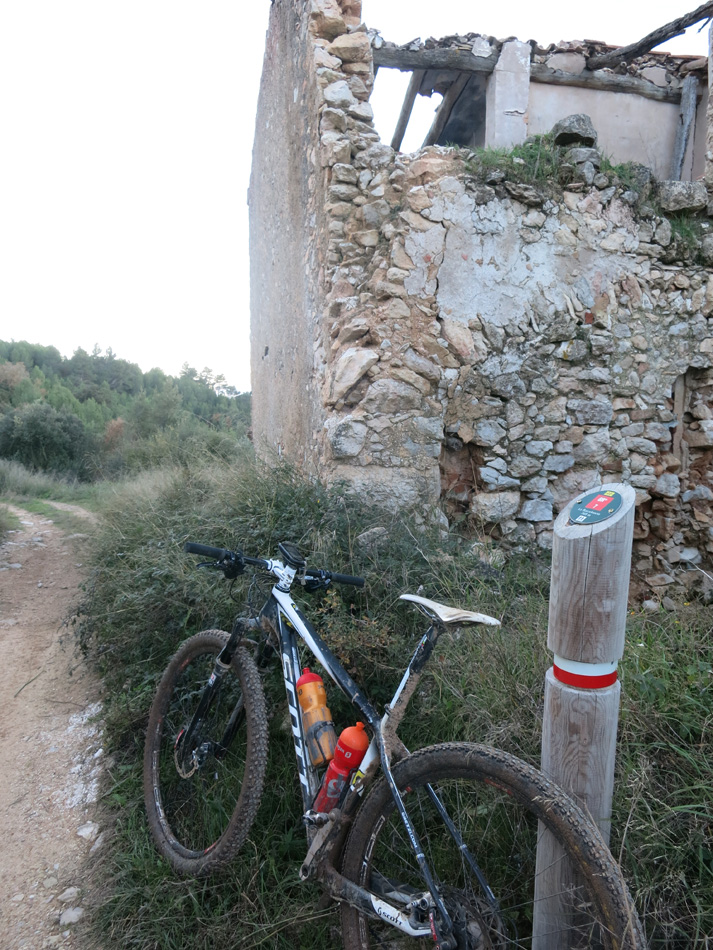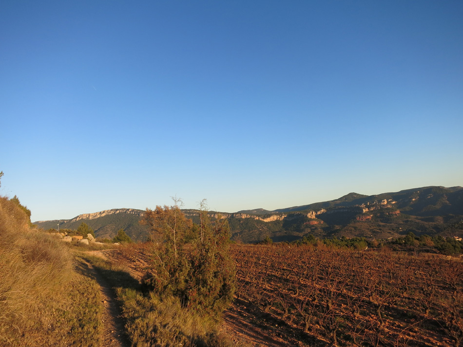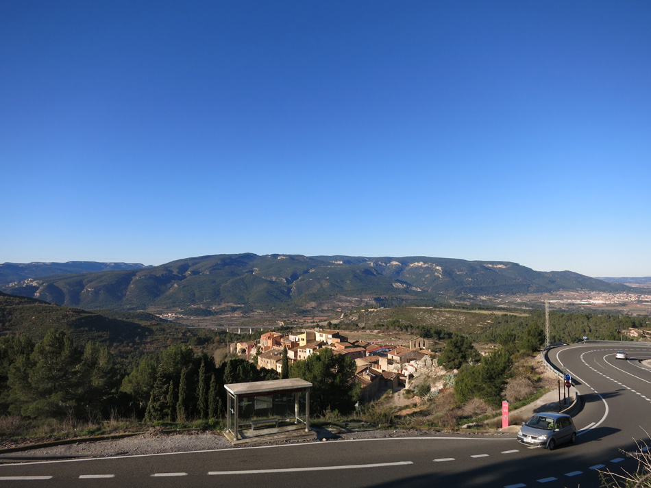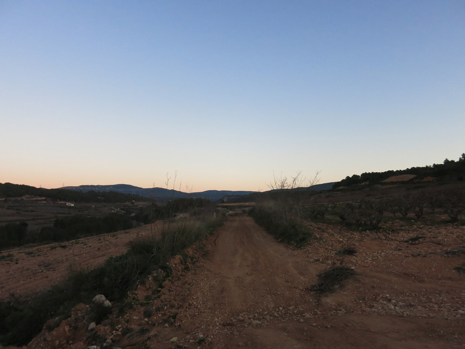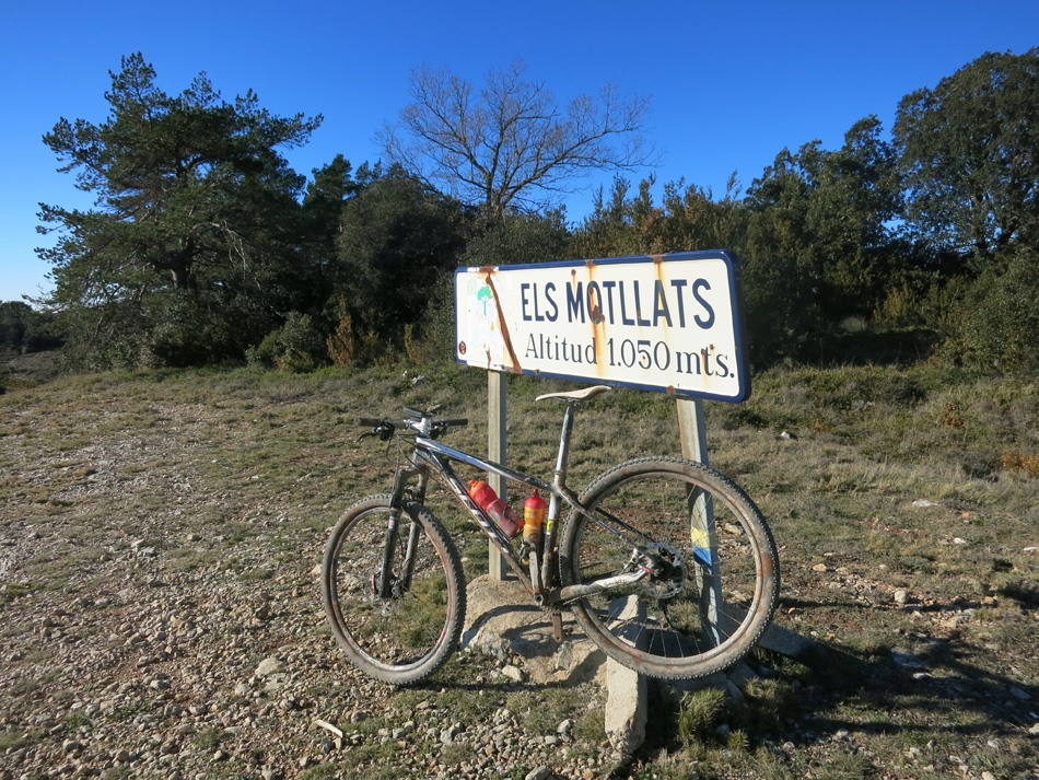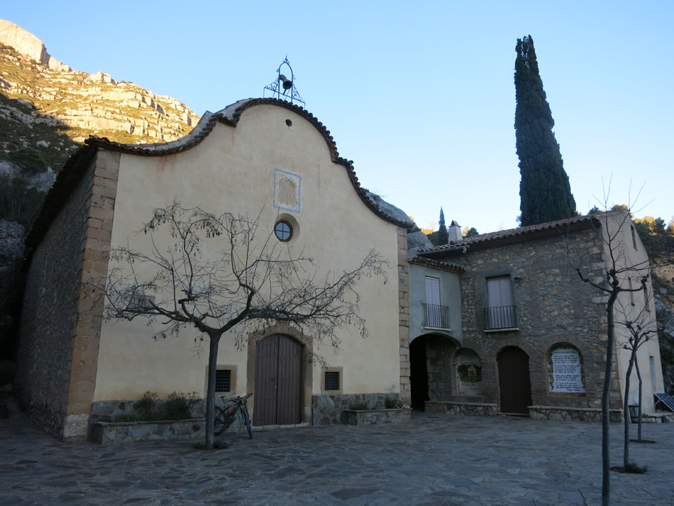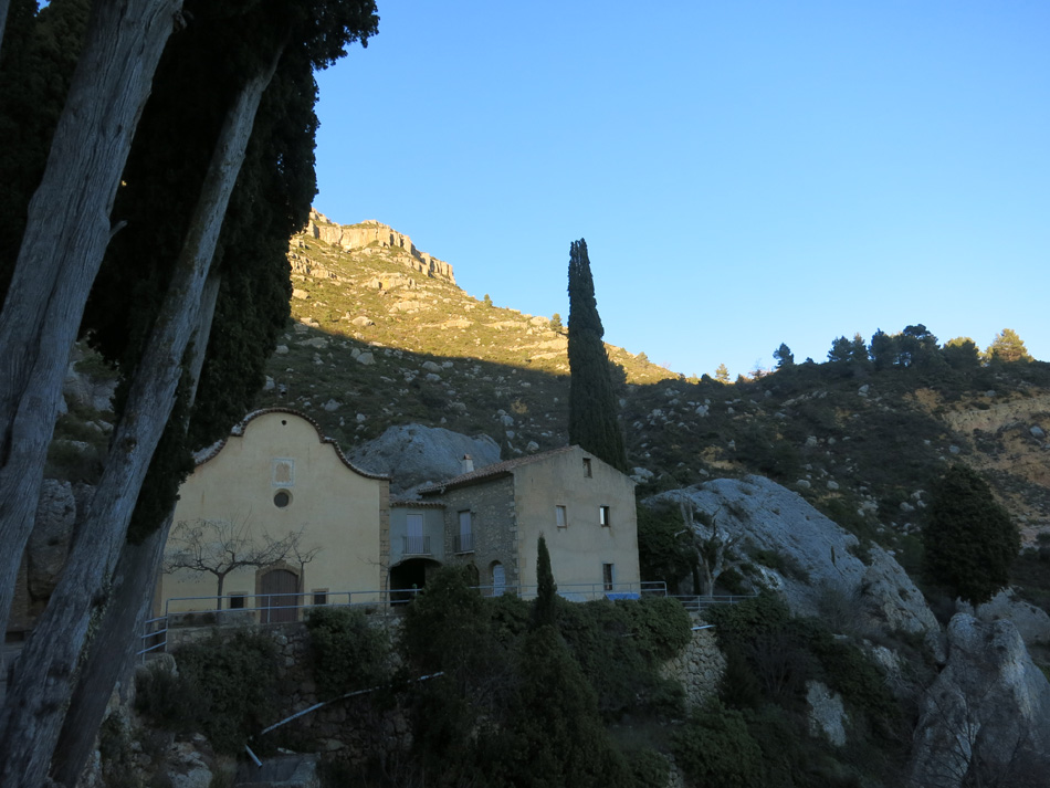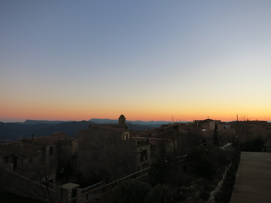 Heute Morgen gab es für mich das Eingeklemmte aus der Bar welches ich gestern noch besorgt hatte. Um 8Uhr ging es los. Zuerst folgte ich der Routa de Cister ( Fernwanderweg GR 175) bis zum Col de Sarria auf 666m. Dort ging es dann schon ein mir bekanntes Stück auf dem GR7 weiter nach Vilaverd. Der Wanderweg verlief hier meist auf der Schattenseite des Gebirges so das es mit dem mässigen Nordwind oder der Biese recht kalt war. Die Pfützen am Schatten waren am zufrieren. Kurz nach 11 Uhr suchte ich dann in La Riba einen Laden auf. Danach begann der Längere Aufstieg nach Montral. Ich wählte hier eine panoramareiche Variante mit Meerblick auf der Sonnenseite des Gebirges. Von Montral ging es dann durch das Serra de l' Embesta Gebirge mehr oder weniger um 1000m ü M nach Prades. Hier hatte ich noch einen grossen Dorn im Vorderrad eingefangen. Nach dem Schlauchwechsel erreichte ich gegen 15 Uhr die sehr schöne Ortschaft Prades. Hier suchte ich zuerst mal eine Bar auf um ein Eingeklemmtes zu essen und mich aufzuwärmen. Hier fasste ich auch den Entschluss noch weiter in Richtung Montsant Gebirge zu fahren. Bei der kleinen Ortschaft Albarca begann dann Highlight des heutigen Tages. Es war dies der GR174 Wanderweg welcher bei der Ermita de S. Juan vorbei nach La Morera de Montsant führte. Er war fast durchwegs fahrbar und befand sich auf einem kleinen Felsband. Um 17.30 bei Sonnenuntergang erreichte ich die Ortschaft La Morera de Montsant. Wie ich mir dachte war das Hotel hier geschlossen so dass ich auf einer Piste noch 6km abwärts nach Poboleda fuhr. Hier gab es für einmal wieder ein schönes Hostal welches sogar ein Restaurant mit gutem Essen hatte.