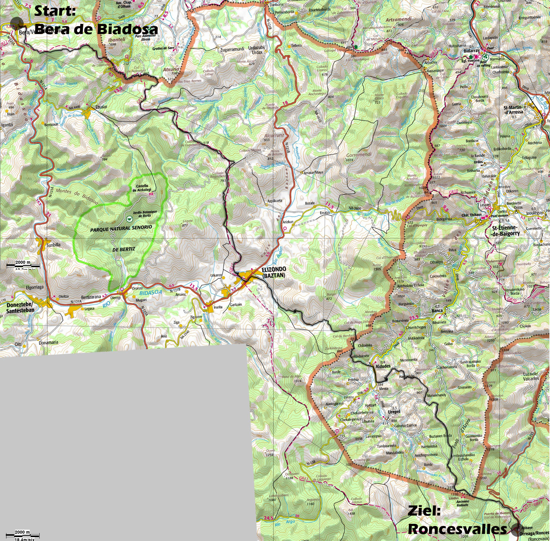 2. Etappe: Vera de Biadosa- Col de Lizzarieta- Col de Nabarlatz- Elizondo- Col de Berdatitz- Aldudes- Errola- Lindus- Puerto de Ibaneta- Roncesvalles