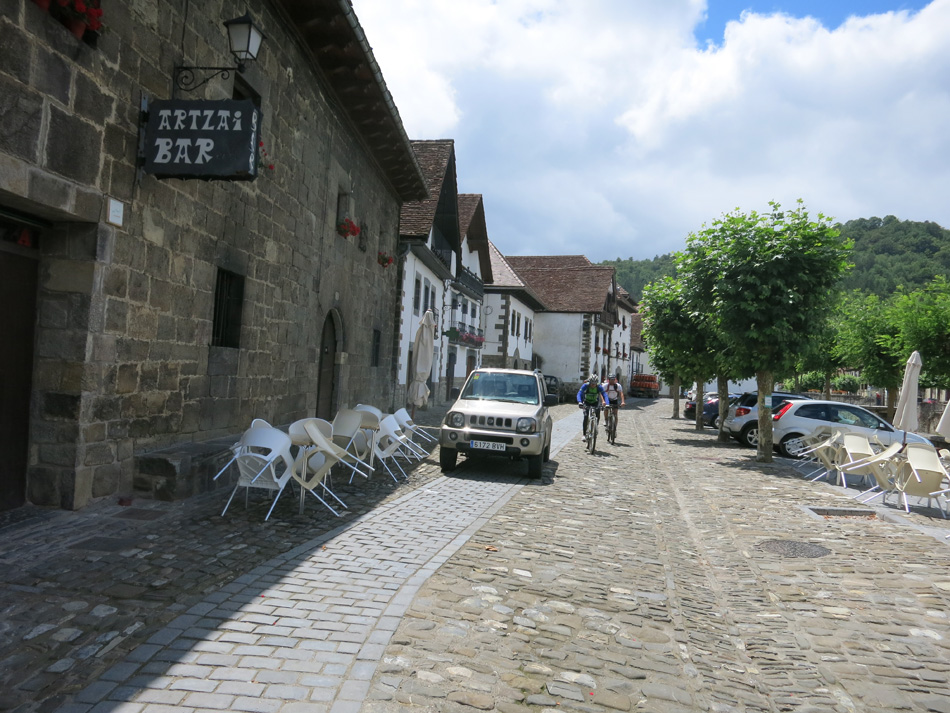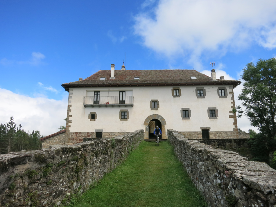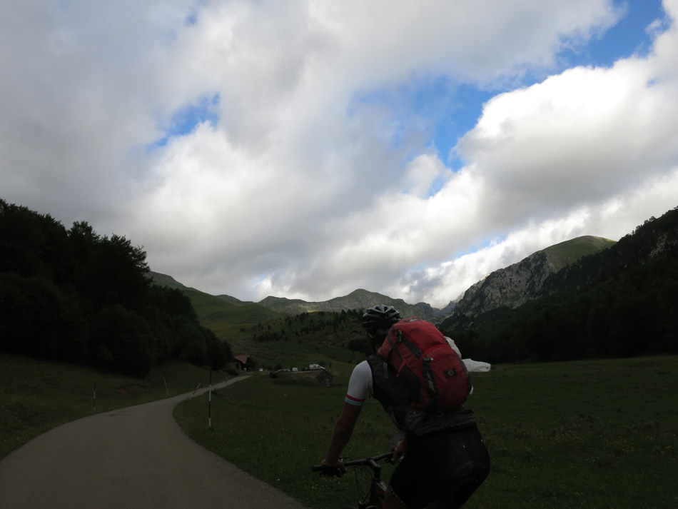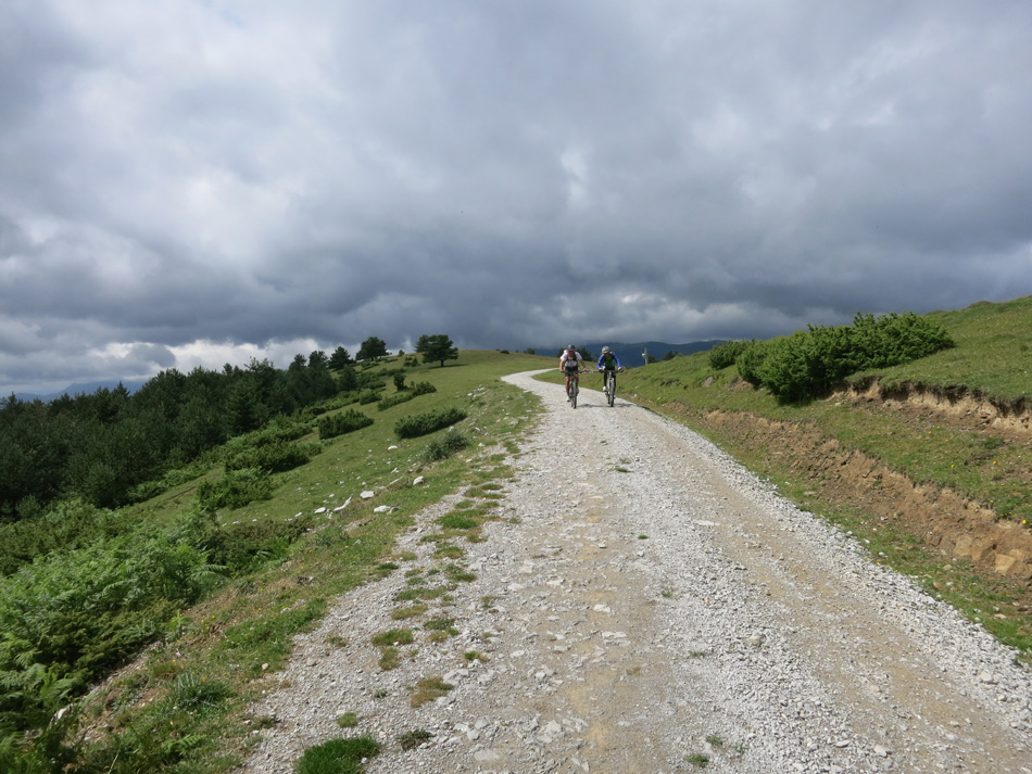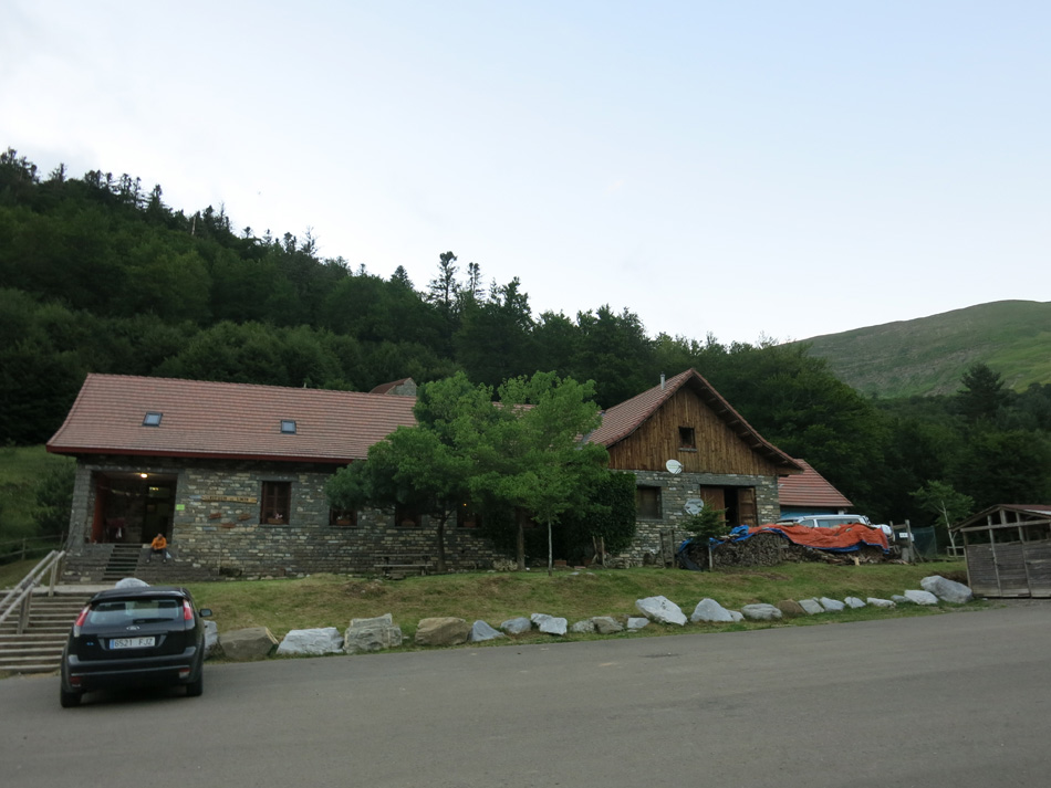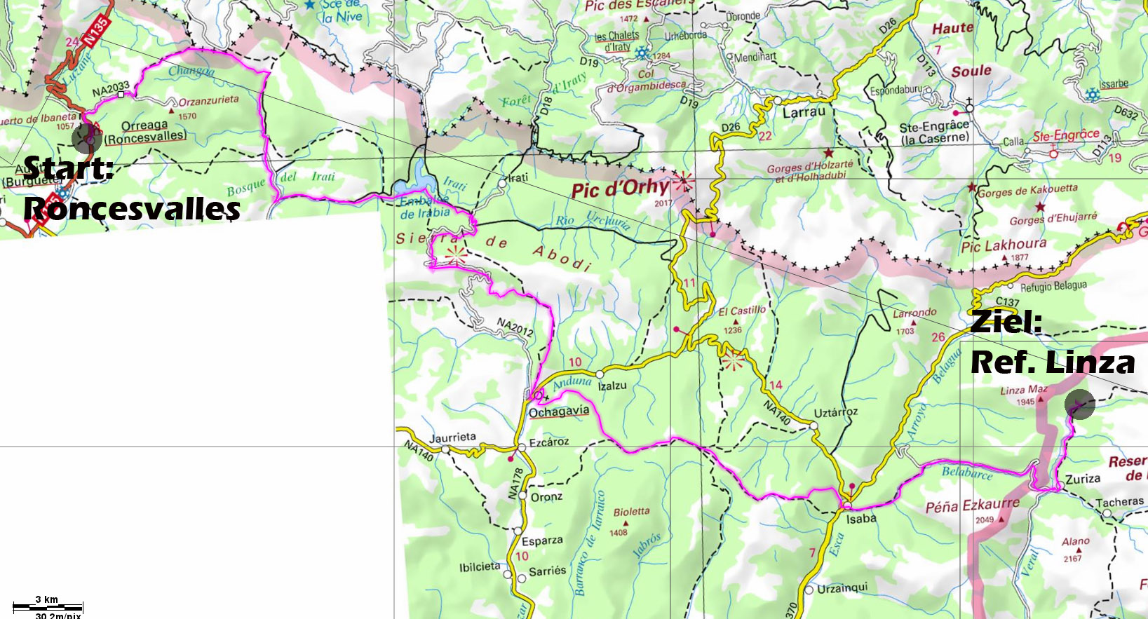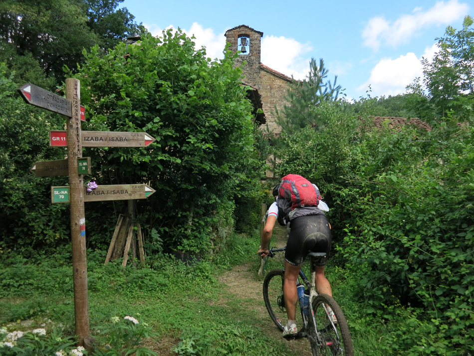 Heute Morgen gingen wir etwas nach 7 Uhr zum Frühstück. Meine Schwester hatte leider sehr starke Schmerzen an der Rippe so dass Sie sich entschied hier abzubrechen und mit einem Bus den nächsten französischen Bahnhof aufzusuchen. Um etwa 8.15 Uhr starteten wir dann nur noch zu dritt. Auf dem Pilgerweg ging es dann zum Leopeder auf 1432m hinauf. Leider begann es dann intensiv zu regnen so dass wir uns in einer Nothütte zusätzliche Kleider anziehen mussten. Mehr oder weniger auf der Staatsgrenze ging es dann auf dem GR12 weiter zum Col d' Arnostéguy wo dann eine Wiesenabfahrt zum Rifugio Azpegi begann. Sie war eigentlich ganz schön außer dass es stark regnete. Auf dem Asphalt ging es dann hinunter bis kurz vor Orbaizeta wo wir dann auf einem Wasserkanalweg zum Pantano de Irabia Stausee kamen. Auf der Rechten Seite des See ging es dann auf einem sehr schönen Trail weiter und danach dann auf der Strasse zum Tapalko Pasabidea Pass auf 1368m. Hier besserte sich dann das Wetter zum Glück wieder. Auf Pisten und dem GR11 kamen wir dann zur Mittagszeit zur Nuestra Señora de Muskilda Wallfahrtskapelle, welche ausgesprochen sehenswert war. Von dort führte ein gut fahrbarer Steinplattenweg nach Orchagavia hinunter. In diesem sehenswerten Ort suchten wir nun ein Restaurant auf, ehe wir unsere Fahrt auf dem GR11 fortsetzten. Auf einer schönen Piste ging es dann auf den Collado de Kakueta. Hier folgte zuerst ein sehr schöner Höhenweg und dann die Abfahrt auf dem GR11 nach Izaba. Die Abfahrt war zum Teil anspruchsvoll aber sehr schön. Besonders hübsch war es bei der Kapelle Nuestra Señora de Idola. Bei Isaba folgte dann die nächste Trailpartie ins Valle de Belabarze. Etwa um 18 Uhr waren wir dann in Zuriza wo es ein Restaurant mit Zimmern und ein Camping Platz gab. Wir entschieden uns jedoch noch weiter bis zum Rifugio de Linza zu fahren. Wo wir dann 15min später auch ankamen. Es war eine sehr einfache Hütte ohne Kommunikationsmöglichkeiten auf 1350m.