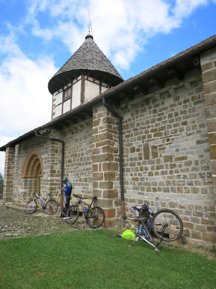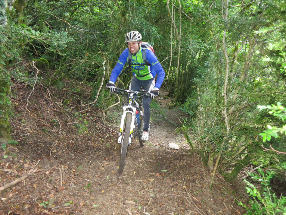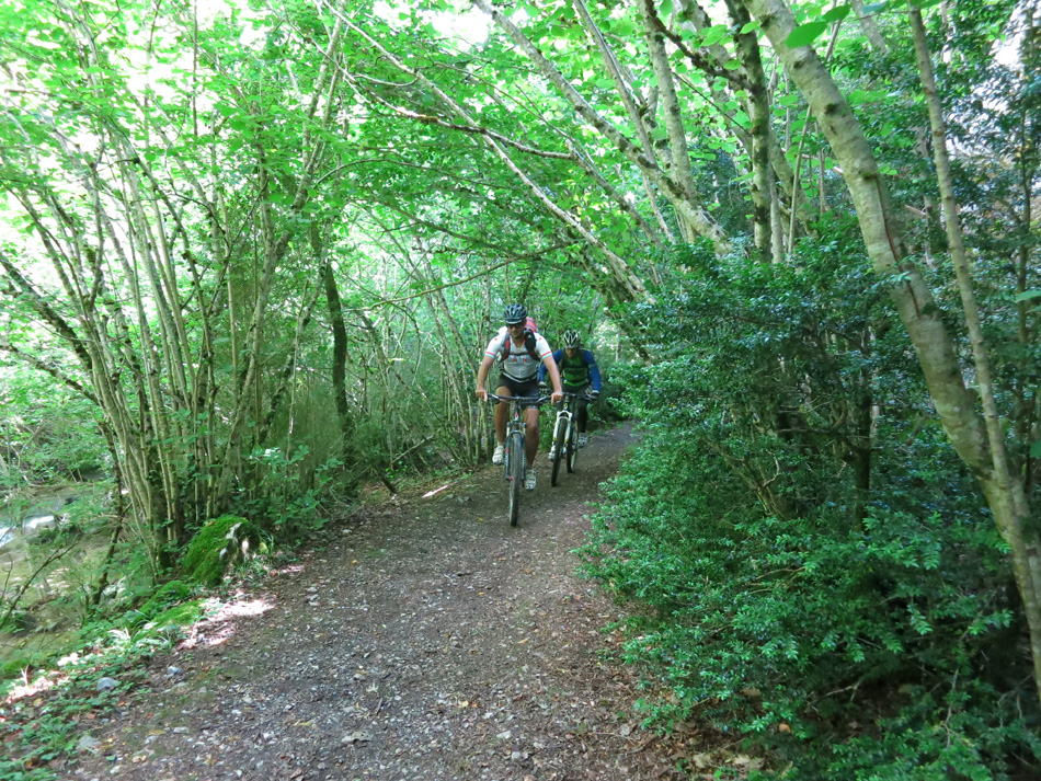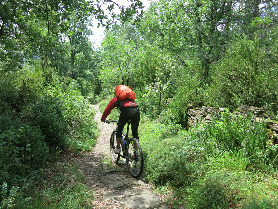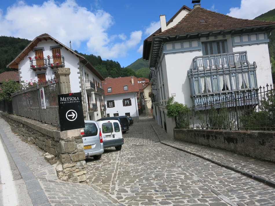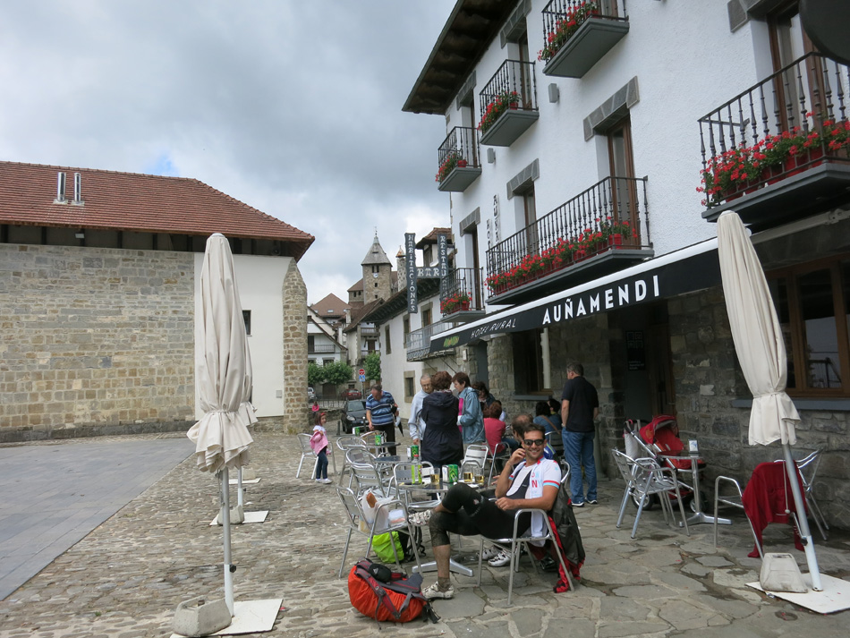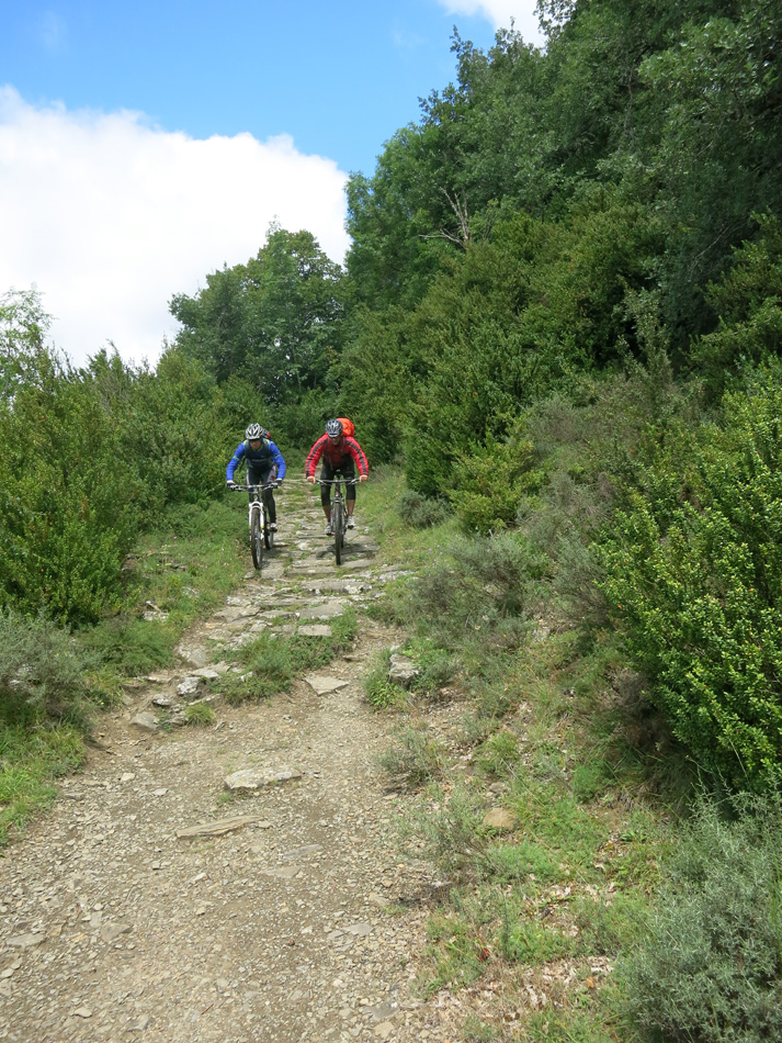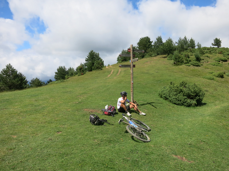 Heute Morgen gingen wir etwas nach 7 Uhr zum Frühstück. Meine Schwester hatte leider sehr starke Schmerzen an der Rippe so dass Sie sich entschied hier abzubrechen und mit einem Bus den nächsten französischen Bahnhof aufzusuchen. Um etwa 8.15 Uhr starteten wir dann nur noch zu dritt. Auf dem Pilgerweg ging es dann zum Leopeder auf 1432m hinauf. Leider begann es dann intensiv zu regnen so dass wir uns in einer Nothütte zusätzliche Kleider anziehen mussten. Mehr oder weniger auf der Staatsgrenze ging es dann auf dem GR12 weiter zum Col d' Arnostéguy wo dann eine Wiesenabfahrt zum Rifugio Azpegi begann. Sie war eigentlich ganz schön außer dass es stark regnete. Auf dem Asphalt ging es dann hinunter bis kurz vor Orbaizeta wo wir dann auf einem Wasserkanalweg zum Pantano de Irabia Stausee kamen. Auf der Rechten Seite des See ging es dann auf einem sehr schönen Trail weiter und danach dann auf der Strasse zum Tapalko Pasabidea Pass auf 1368m. Hier besserte sich dann das Wetter zum Glück wieder. Auf Pisten und dem GR11 kamen wir dann zur Mittagszeit zur Nuestra Señora de Muskilda Wallfahrtskapelle, welche ausgesprochen sehenswert war. Von dort führte ein gut fahrbarer Steinplattenweg nach Orchagavia hinunter. In diesem sehenswerten Ort suchten wir nun ein Restaurant auf, ehe wir unsere Fahrt auf dem GR11 fortsetzten. Auf einer schönen Piste ging es dann auf den Collado de Kakueta. Hier folgte zuerst ein sehr schöner Höhenweg und dann die Abfahrt auf dem GR11 nach Izaba. Die Abfahrt war zum Teil anspruchsvoll aber sehr schön. Besonders hübsch war es bei der Kapelle Nuestra Señora de Idola. Bei Isaba folgte dann die nächste Trailpartie ins Valle de Belabarze. Etwa um 18 Uhr waren wir dann in Zuriza wo es ein Restaurant mit Zimmern und ein Camping Platz gab. Wir entschieden uns jedoch noch weiter bis zum Rifugio de Linza zu fahren. Wo wir dann 15min später auch ankamen. Es war eine sehr einfache Hütte ohne Kommunikationsmöglichkeiten auf 1350m.