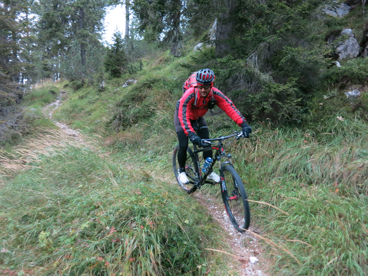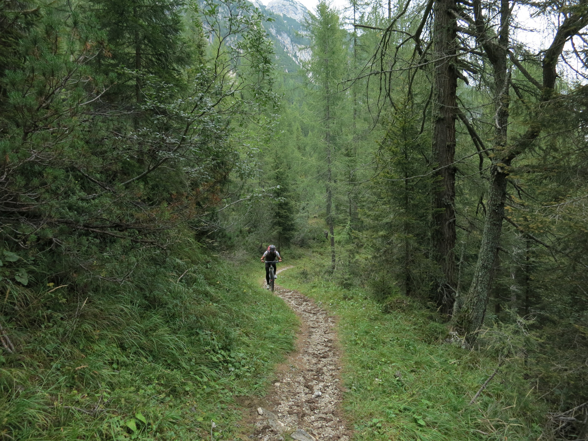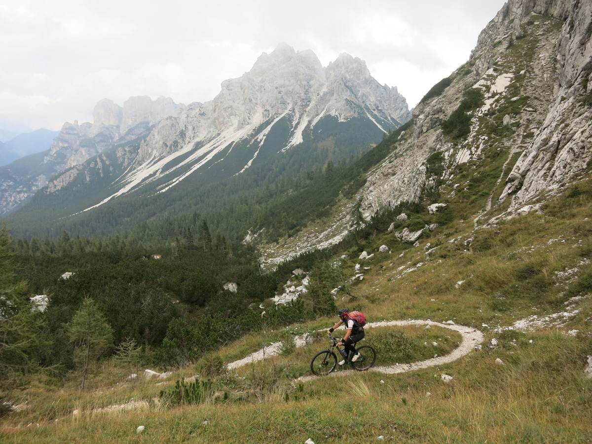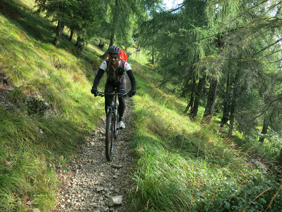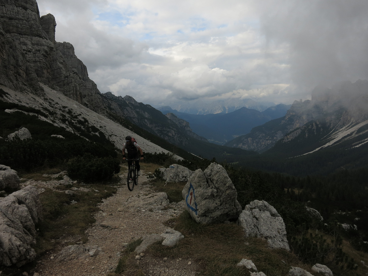 Die Highlight waren heute mal die Abfahrt vom Rifugio Baion nach Calalzo die Cadore hinunter, das nachfolgende Bahntrasse der ehemaligen Dolomitenbahn, das Mittagessen auf dem Monte Rite und zu guter Letzt der fast komplett fahrbare Militärtrail über die Forcella Moscheschin.