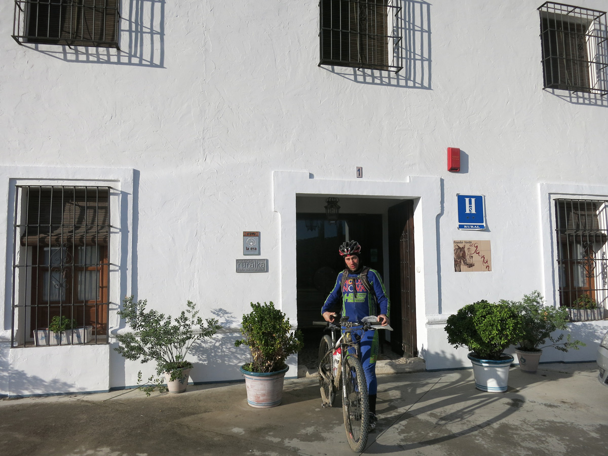 Das Morgenessen bekam ich heute um 7.30Uhr. Es war originell zubereitet und nur mit biologischen Sachen. Danach fuhr ich um 7.30Uhr los. Das Wetter zeigte sich von der guten Seite. Relativ einfach fand ich eine schöne Route um wider auf den Track zu kommen. Bis kurz vor 12 Uhr hatte ich keine Probleme mit Privatgrundstücken doch dann stand mitten auf der Mountainbikeroute ein Tor. Ich konnte es Seitlich ungehen. Ich war gespannt wie es am anderen Ende der Sperrzone aussehen wird. Es gab da leider ein Hof und dann wieder ein Tor welches auf einer Brücke war. Obwohl ich möglist schnell und Leise am Hof vorbeifuhr merkten es die Hunde. Ich schaffte es gerade noch über das Tor zu klettern. Danach folgte ich in einem kleinen Tal aufwärts auf ein 1000m Pässli welches dann nach Valdepeñas de Jaen führte. Hier kaufte ich Saft um für die nächste Wildniss gewappnet zu sein. Zuerst ging es eine Asphaltstrasse von schlechter Qualität hinauf auf 1200m und dann auf einer Höhenstrasse über dem Embalse de Quibrajamo weiter. Hier in der Sierra de la Pandea waren die Berggipfel schon mit Schnee bezuckert. Über ein weiteres Pässli ging es dann nach Carchelejo wo ich um 15.30Uhr in einem Restaurant das Mittagessen für 10€ nahm. Nach rund 10km talabwärts folgte nun ein langer Aufstieg in die Sierra de Almaden. Leider verschlechterte sich das Wetter und als ich auf 1000m ü M war hatte ich dann zum ersten Mal mit Schneeflocken kontakt. Leider führte meine Route nach Torros noch bis auf gut 1400m ü M. Dort oben war es dann sehr ungemütlich. Es Stürmte und schneite, ja sogar Blitz und Donner waren dabei. Um 19.30 Uhr erreichte ich dann Torres auf 850m ü M. Hier hätte es ein sehr schlecht bewertetes Hotel gegeben. Ich entschied mich hier noch 3km weiter in ein leicht besseres, aber auch nicht wirklich gutes zu fahren wo ich dann in der Dunkelheit ankam.