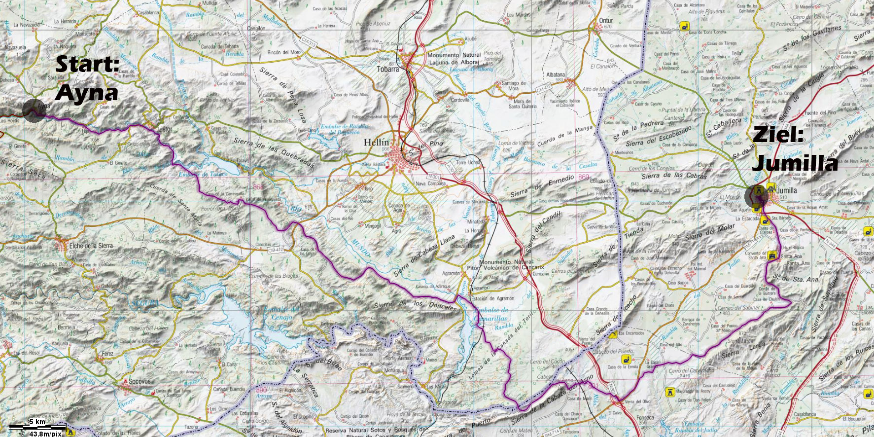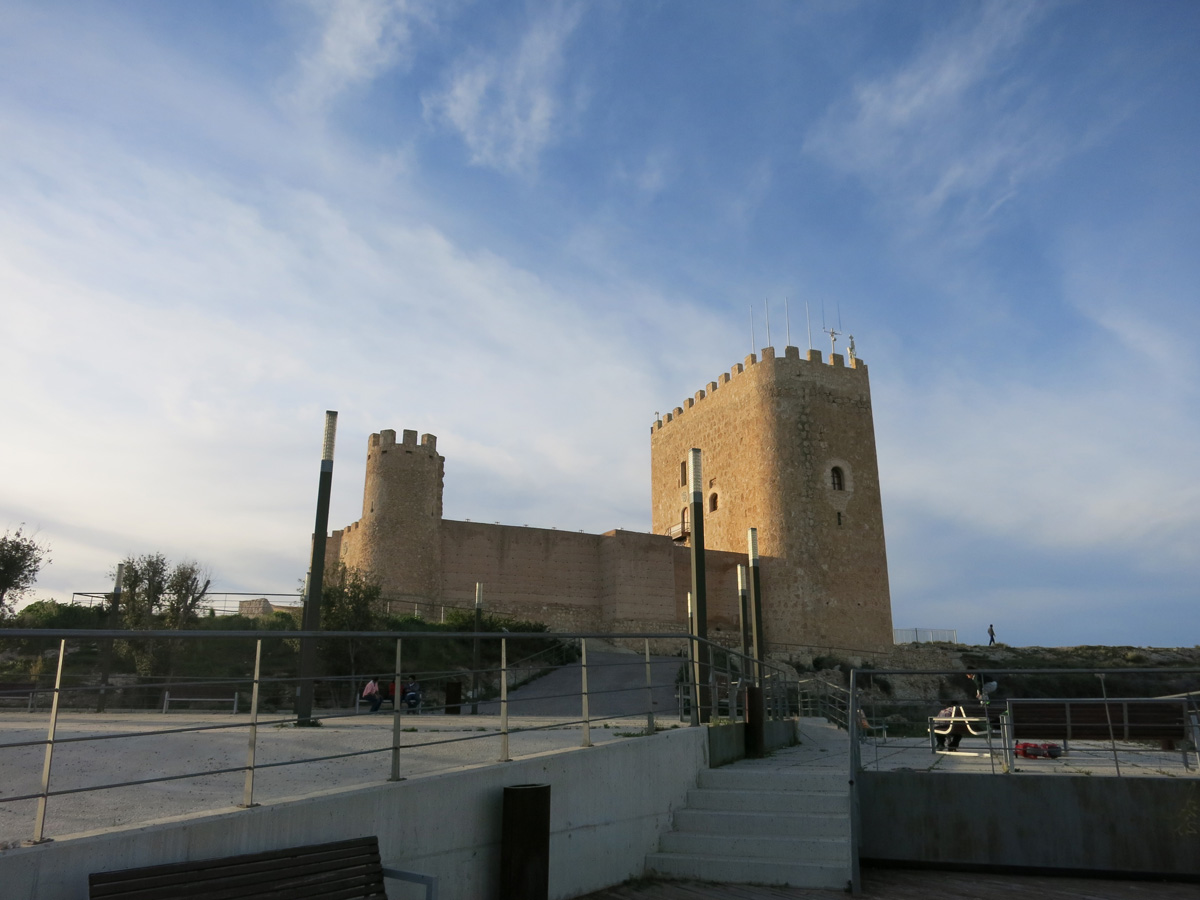 Heute Morgen machte mir der Hotelchef trotz der Zeitumstellung schon um 8 Uhr ein Frühstück. Um etwa 8.45 Uhr fuhr ich los. Nach der Durchquerung des Dorfes Ayna folgte ich bis zum Embalse de Talave dem GR68 Fernwanderweg. Diese ersten 20km bis zum Stausee war der Wanderweg sehr schön, doch dann war er nicht mehr wirklich unterhalten, so dass ich dann auf Pisten durch die Wildniss fuhr. Nach etwa 65km Fahrt hatte ich mitten in der Wildnis einen Kettenriss, den ich jedoch reparieren konnte. Mittlerweilen war es zwischen 25 und 30°C warm und mein Saft war verbraucht. Ich war dann sehr froh dass es bei km 85 an einer Hauptstraßen Kreuzung ein "Roadhouse" gab. Die Tankstelle war geschlossen aber das Restaurant nebenan war zum Glück offen. Ich kippte da mal kräftig Fanta und Cola hinunter. Danach ging es noch weitere 30km auf dem GR251 über da Kloster St. Anna nach Jumilla. Etwa um 19 Uhr erreichte ich diese Stadt. Hier bereitete man sich gerade auf die Palmsonntagsprozession vor. Da es noch 90min bis zum Sonnenuntergang dauerte fuhr ich noch zum Schloss hinauf. Zur Abwechslung besuchte ich heute mal ein China Restaurant und stopfte mich voll.