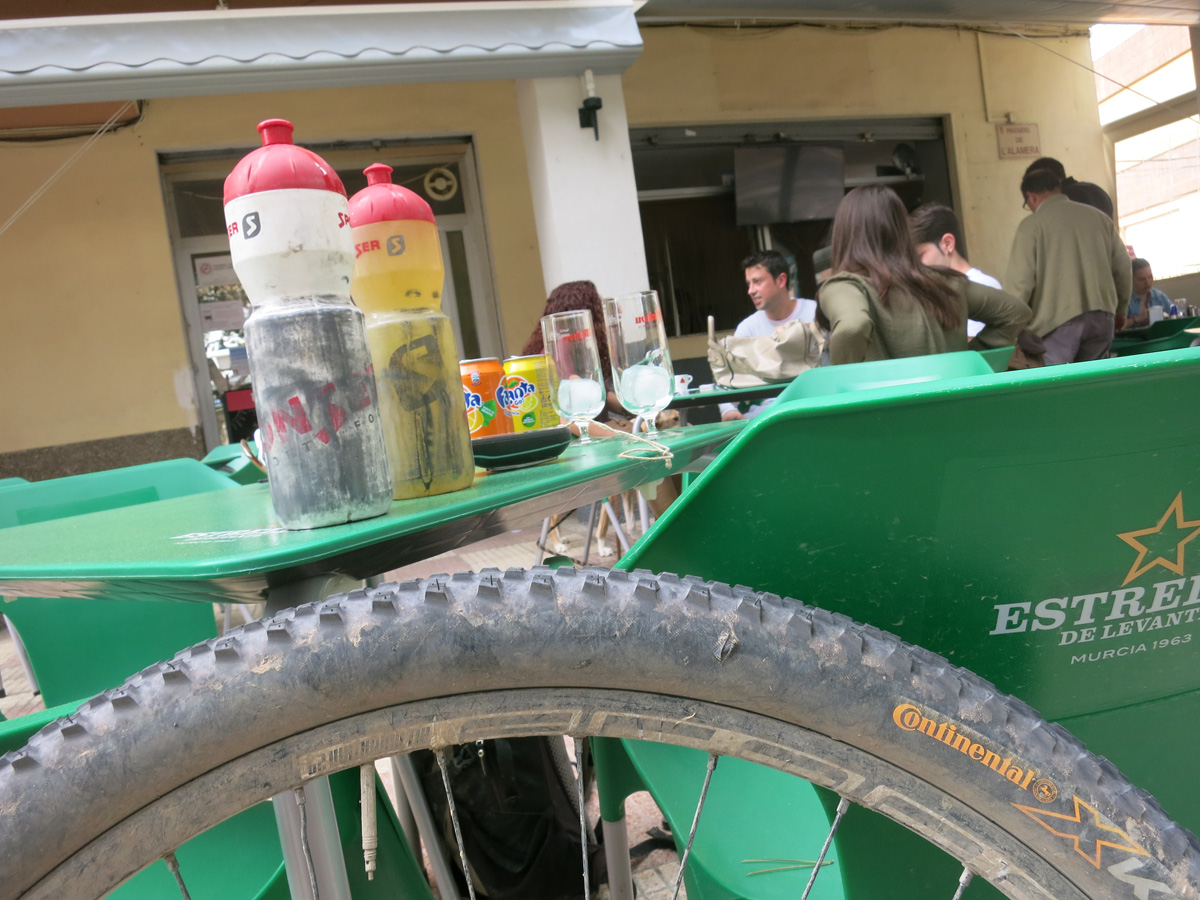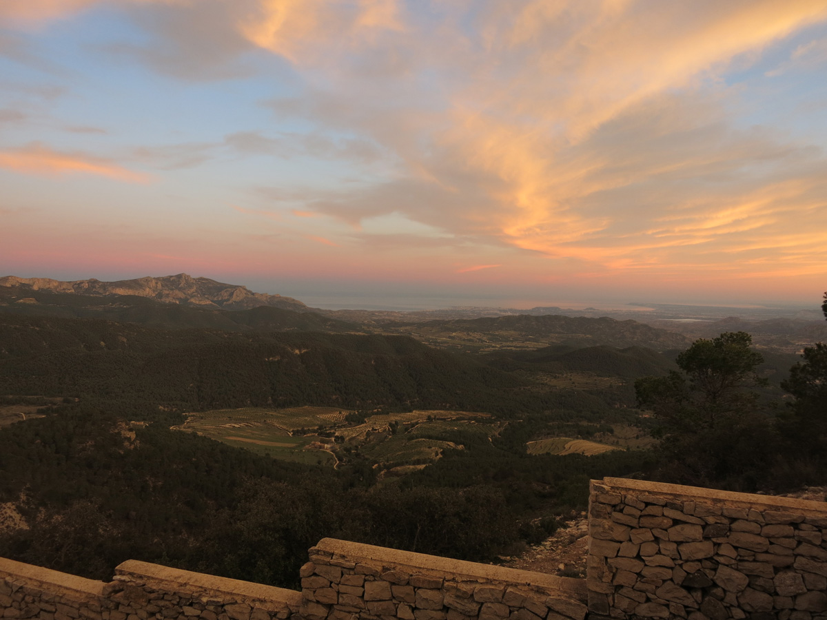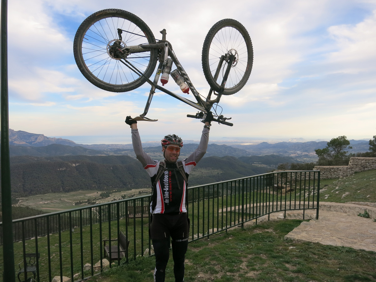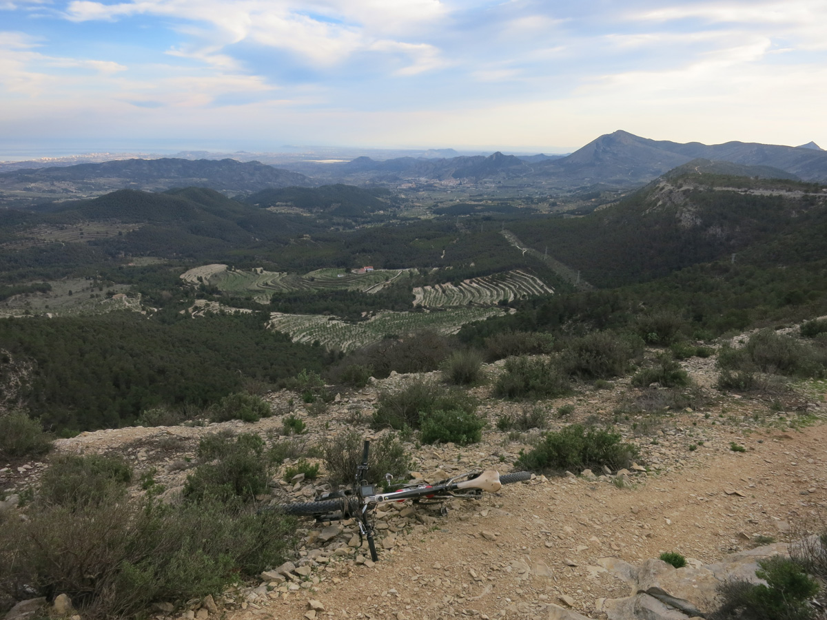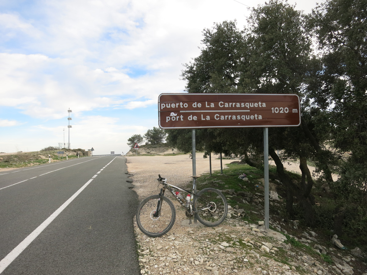 Heute Morgen schaffte ich es um 7.45 Uhr aufzustehen, da es in der Nacht immer noch ziemlich heiß war hatte ich nicht gut geschlafen. Frühstück hätte es schon ab 7 Uhr in der Bar gegeben. Um ca. 8.30 verließ ich das Hotel und suchte die Post auf um unnötiges Gewicht wie Winterkleider nach Hause zu schicken. Hier in Jumilla hatte es einmal eine Bahnlinie gegeben. Ich versuchte dieser zu folgen, doch das Trasse war meist verwuchert. So ging es auf einer Nebenstraße flach bis zum Fusse der Sierra del Carche. Diese überquerte ich dann um nach El Pinos zu kommen. Die Piste darüber mit den 700absolvierten Höhenmeter war sehr schön. In El Pinos kaufte ich um 11.30Uhr noch kurz Saft, bevor ich die Sierra de la Taja überquerte. Um 14 Uhr (der Spanischen Mittagszeit) erreichte ich dann die Stadt Monforte del Cid. Es war nun mit 30°C schon fast brütend heiß das ich nochmals Saft kaufen musste. Bis Agost ging es dann noch gut 10km flach, bis ich auf die sanft ansteigende Via Verde de Maigmo kam. Es handelte sich hier um ein Bahntrasse welche durch eine Wüstenartige Landschaft führte und in wunderbarem Zustand als Radweg war. Nach den 16km auf der Via Verde musste ich mir dann den Weg nach Tibi Suchen. Ich fand dann eine Wildbach Unterführung über die Autobahn. Etwas außerhalb von Tibi konnte ich dann nicht mehr meiner geplanten Route folgen. Ein 2,5m hoher Zaun einer Finca hinderte mich daran. Dafür klappte dann der nächste Versuch 2km später um doch noch in die Serra del Cuartel zu kommen. Um 19 Uhr erreichte ich dann das Hotel Pou de la Neu etwas abseits des Port de la Carrasqueta auf 1100m. Hier bin ich nun etwa 30km nördlich von Alicante mit wunderbarem Ausblick ins Gebirge und auf das Meer. Morgen werde ich nun meinen ersten Teil der Spaniendurchquerung beenden. Bis jetzt bin in in diesen 9Tagen etwa 1100km gefahren.