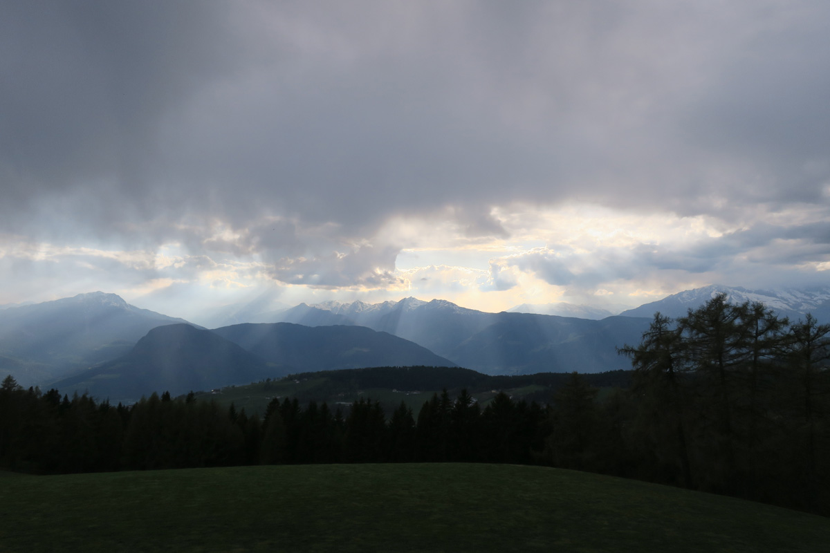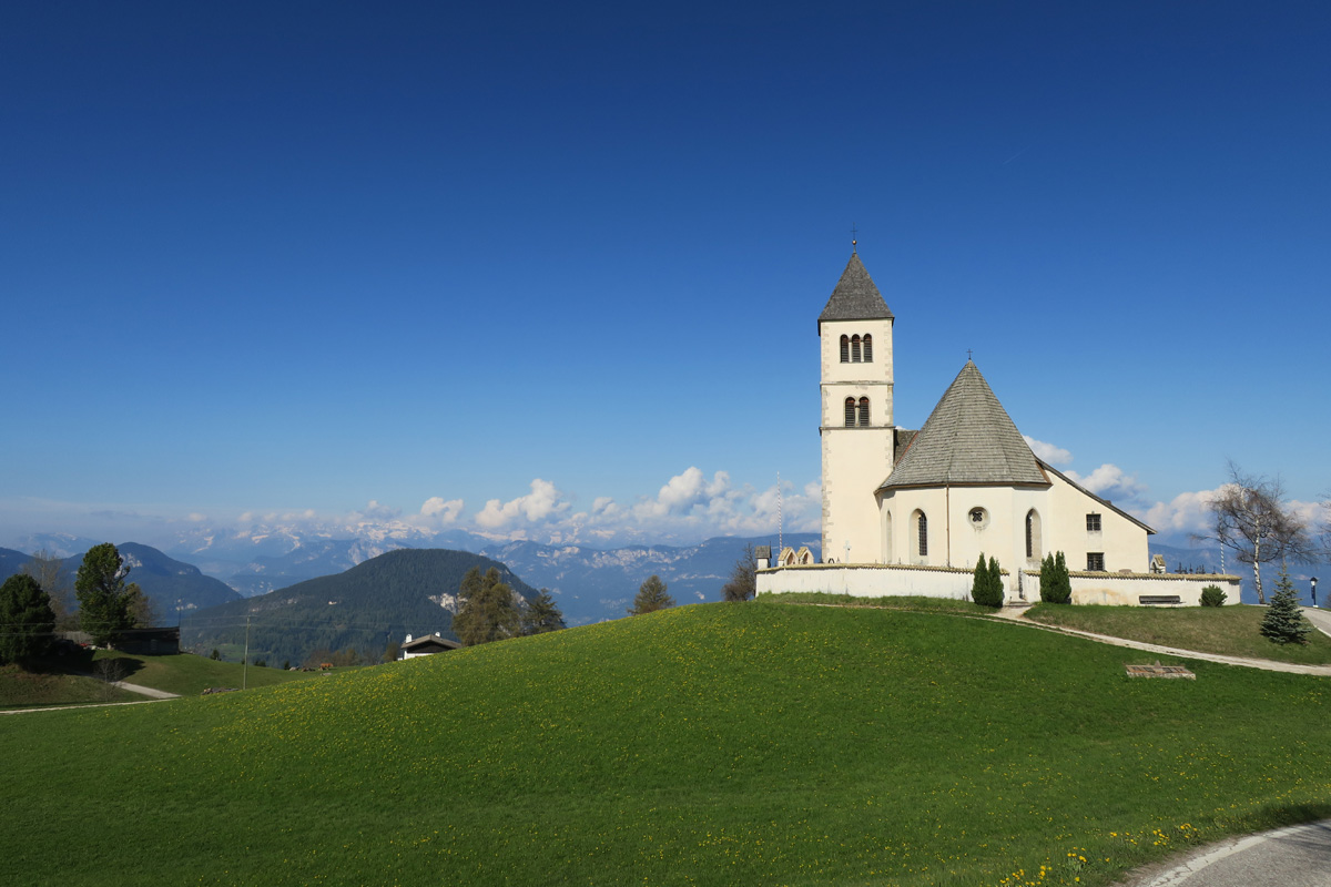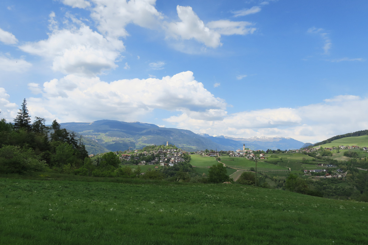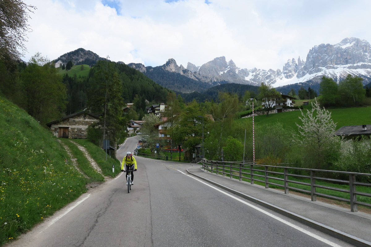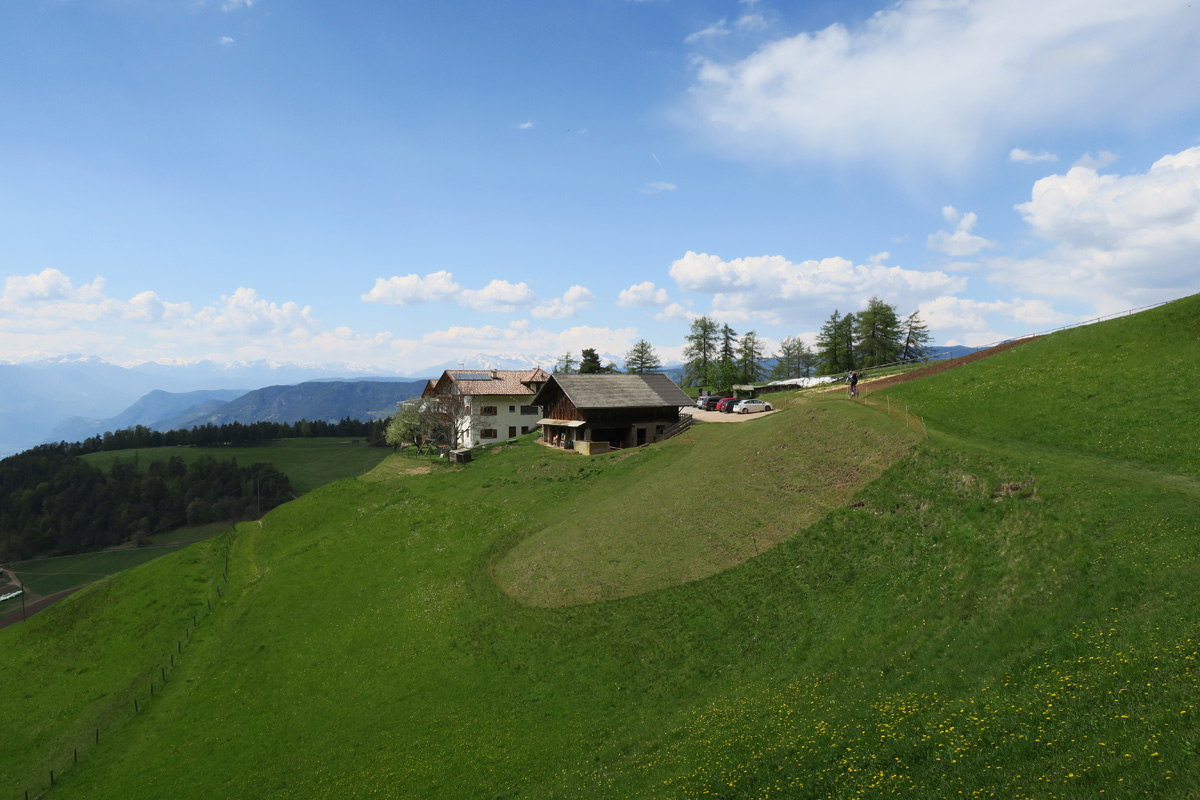 Heute Morgen gab es für uns um 7Uhr ein sehr gutes Frühstück. Danach ging es Los. Nach dem Aufstieg durch das Dorf Truden folgte schon eine knackige Abfahrt hinunter nach Kaltenbrunn, wo wir noch ein Stück auf dem Bahntrasse der ehemaligen Fleinstalbahn fahren konnten. Aber bald begann dann der Aufstieg über Radein zun Jochgrimm auf 1989m. Etwa um 10Uhr war dann dieser auf 1989m liegende Pass geschafft. Der Weg war bereits komplett Schneefrei. Auf schönen Pisten ging es dann über Obereggen, den Karrersee und den Nigerpass nach St. Zyprian bei Tiers wo wir dann ein ausführliches Mittagsessen genossen. Nach dem Essen folgten wir weiter der Trans Tirol Bike Route zum Völsegger Bild. Etwa um 14.30Uhr merkte mein Kollege dass die Nabe seines Hinterrades total ausgeleiert war. Wir entschlossen uns die Route abzuändern und statt Richtung Brixen nach Bozen hinunter zu fahren. Gleich bei der Einfahrt nach Bozen hatten wir ein Volltreffer von einem guten Fahrradgeschäft. Es gab alles wünschenswerte zu Kaufen, sogar ein neues und passendes Hinterrad. Wir waren sehr dankbar und konnten nach 16Uhr unseren Trip wieder fortsetzten. Nach der schönen Altstadt ging es zuerst sanft und danach extrem steil durch die Rebberge nach Glanig. Ab hier ging es noch moderat Steil hinauf zur Saltener Hochebene. Auf 1527m beim Gasthaus Langfenn war dann um 18.45Uhr Feierabend. Hier oben, gleich neben der Wallfahrtskirche hat man einen wunderbaren Ausblick auf die umliegenden Berge und Täler.