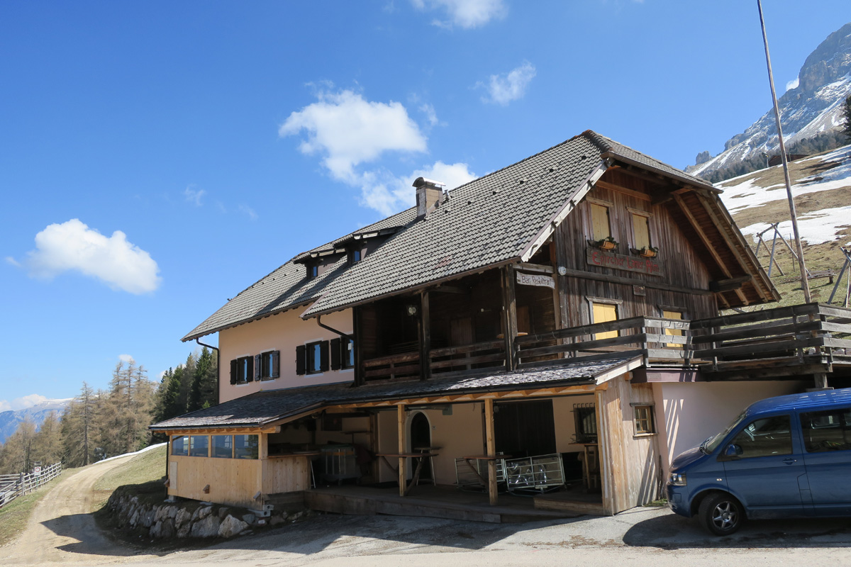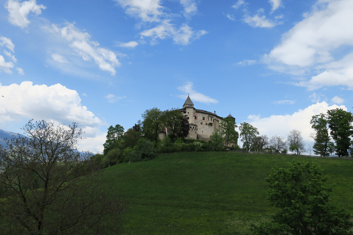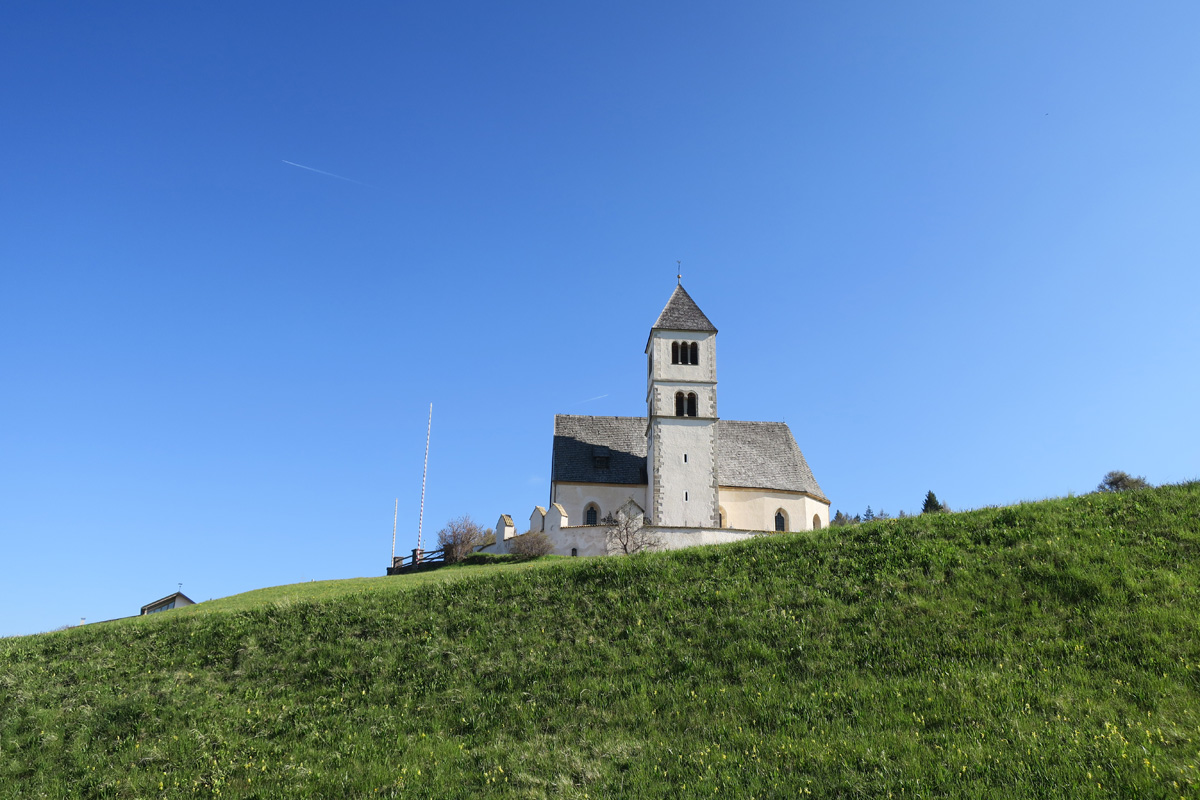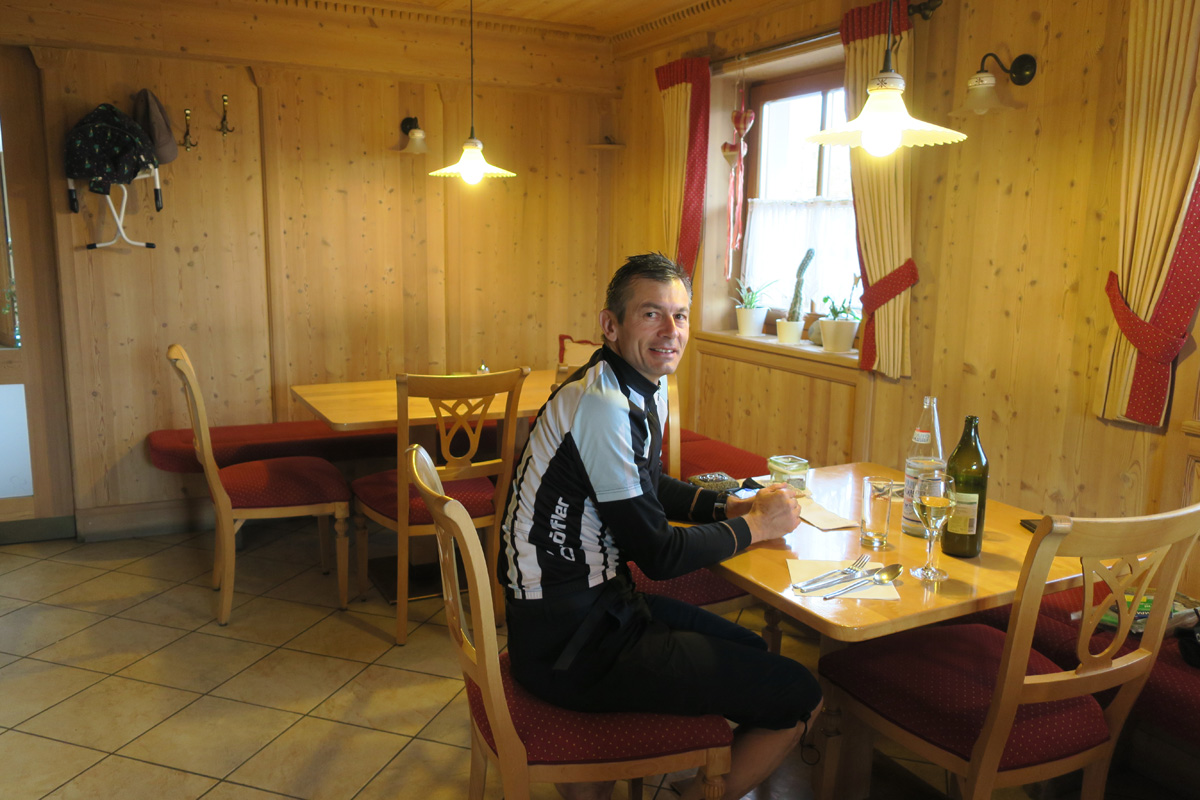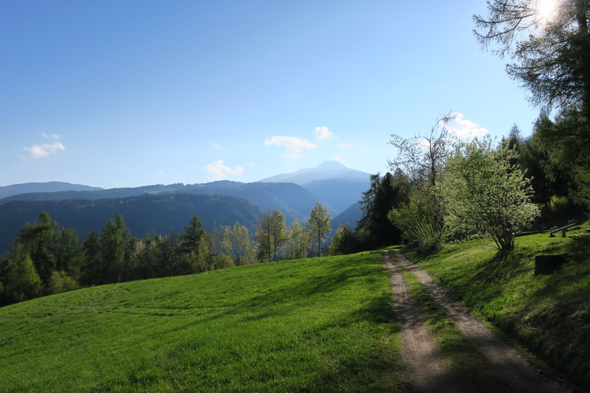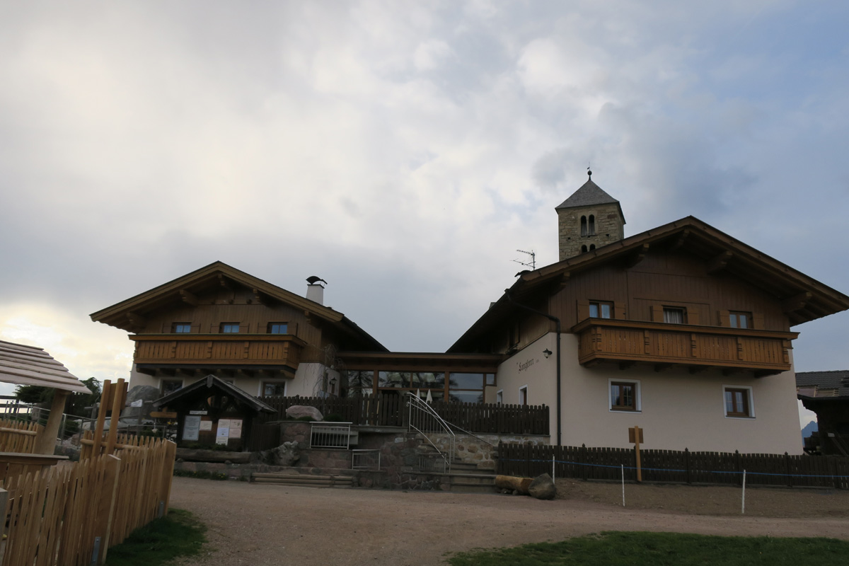 Heute Morgen gab es für uns um 7Uhr ein sehr gutes Frühstück. Danach ging es Los. Nach dem Aufstieg durch das Dorf Truden folgte schon eine knackige Abfahrt hinunter nach Kaltenbrunn, wo wir noch ein Stück auf dem Bahntrasse der ehemaligen Fleinstalbahn fahren konnten. Aber bald begann dann der Aufstieg über Radein zun Jochgrimm auf 1989m. Etwa um 10Uhr war dann dieser auf 1989m liegende Pass geschafft. Der Weg war bereits komplett Schneefrei. Auf schönen Pisten ging es dann über Obereggen, den Karrersee und den Nigerpass nach St. Zyprian bei Tiers wo wir dann ein ausführliches Mittagsessen genossen. Nach dem Essen folgten wir weiter der Trans Tirol Bike Route zum Völsegger Bild. Etwa um 14.30Uhr merkte mein Kollege dass die Nabe seines Hinterrades total ausgeleiert war. Wir entschlossen uns die Route abzuändern und statt Richtung Brixen nach Bozen hinunter zu fahren. Gleich bei der Einfahrt nach Bozen hatten wir ein Volltreffer von einem guten Fahrradgeschäft. Es gab alles wünschenswerte zu Kaufen, sogar ein neues und passendes Hinterrad. Wir waren sehr dankbar und konnten nach 16Uhr unseren Trip wieder fortsetzten. Nach der schönen Altstadt ging es zuerst sanft und danach extrem steil durch die Rebberge nach Glanig. Ab hier ging es noch moderat Steil hinauf zur Saltener Hochebene. Auf 1527m beim Gasthaus Langfenn war dann um 18.45Uhr Feierabend. Hier oben, gleich neben der Wallfahrtskirche hat man einen wunderbaren Ausblick auf die umliegenden Berge und Täler.