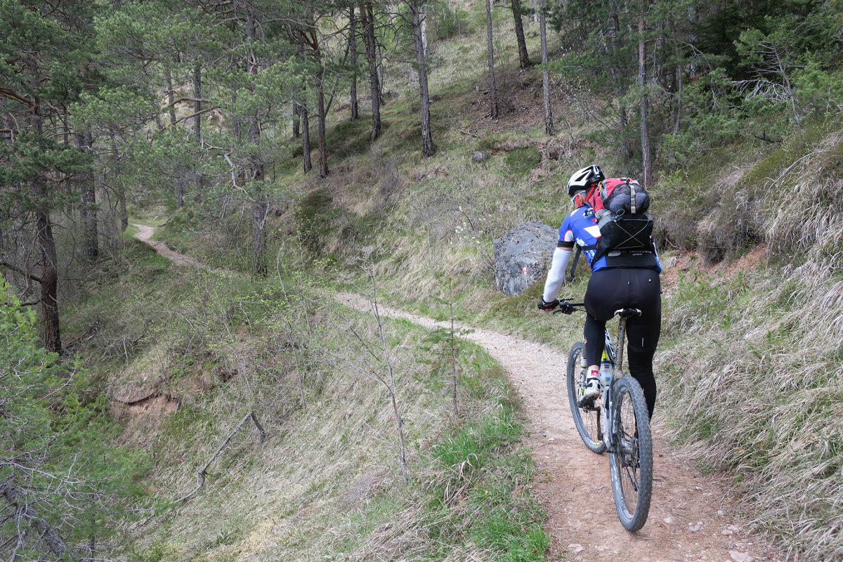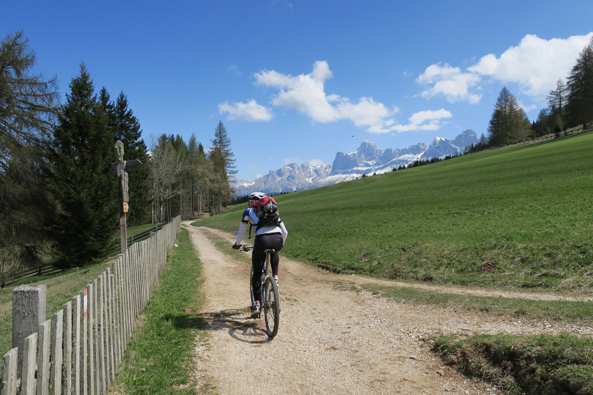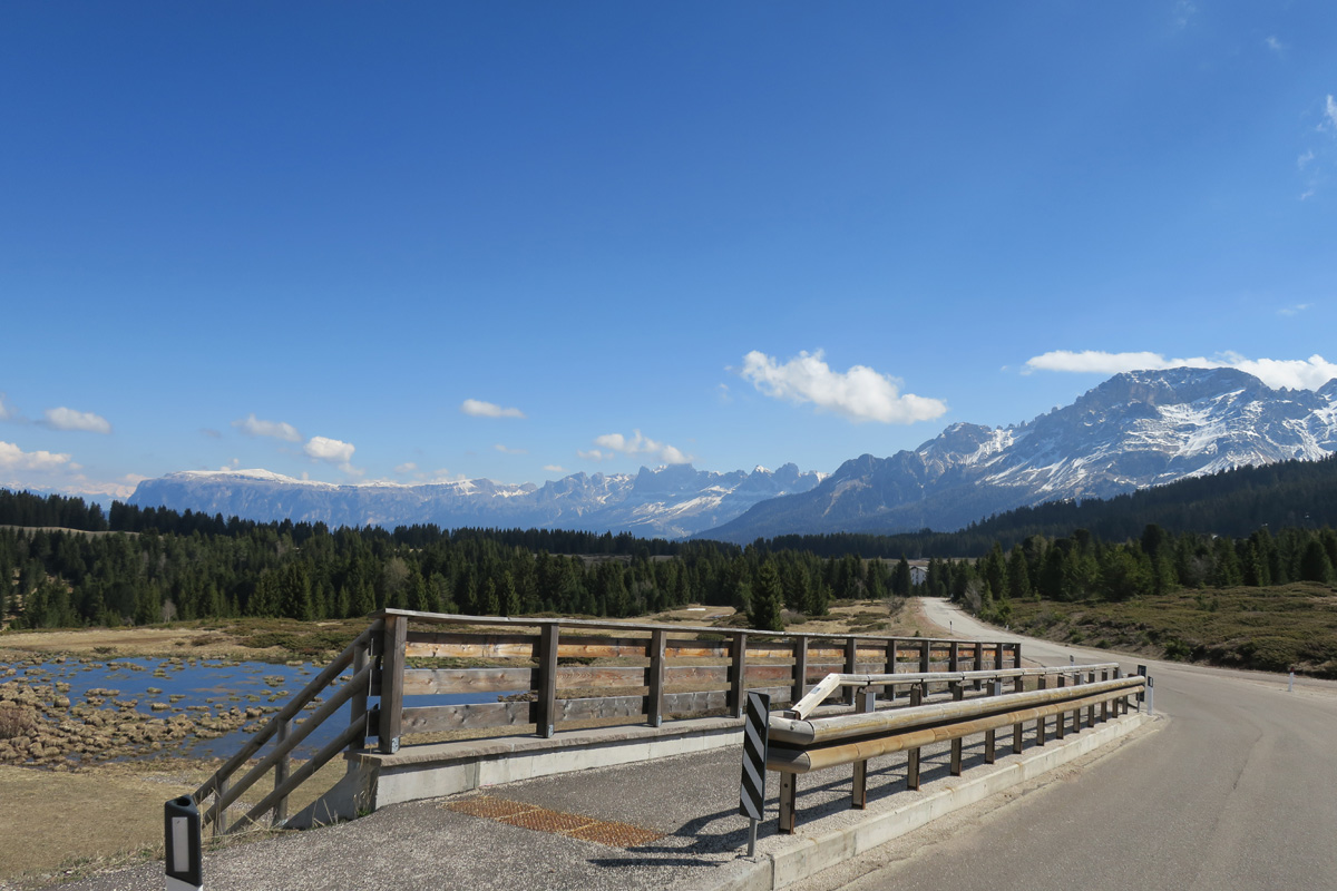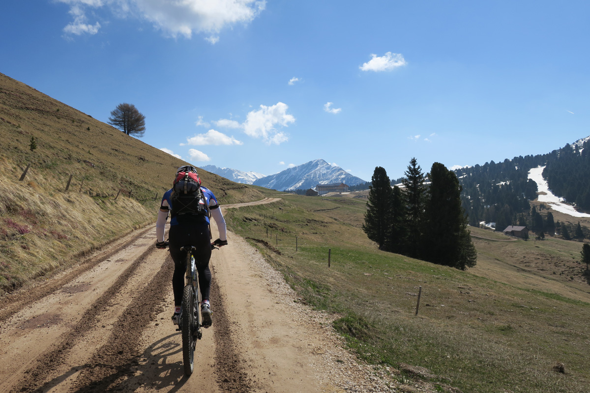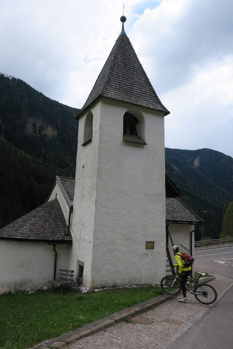 Heute Morgen gab es für uns um 7Uhr ein sehr gutes Frühstück. Danach ging es Los. Nach dem Aufstieg durch das Dorf Truden folgte schon eine knackige Abfahrt hinunter nach Kaltenbrunn, wo wir noch ein Stück auf dem Bahntrasse der ehemaligen Fleinstalbahn fahren konnten. Aber bald begann dann der Aufstieg über Radein zun Jochgrimm auf 1989m. Etwa um 10Uhr war dann dieser auf 1989m liegende Pass geschafft. Der Weg war bereits komplett Schneefrei. Auf schönen Pisten ging es dann über Obereggen, den Karrersee und den Nigerpass nach St. Zyprian bei Tiers wo wir dann ein ausführliches Mittagsessen genossen. Nach dem Essen folgten wir weiter der Trans Tirol Bike Route zum Völsegger Bild. Etwa um 14.30Uhr merkte mein Kollege dass die Nabe seines Hinterrades total ausgeleiert war. Wir entschlossen uns die Route abzuändern und statt Richtung Brixen nach Bozen hinunter zu fahren. Gleich bei der Einfahrt nach Bozen hatten wir ein Volltreffer von einem guten Fahrradgeschäft. Es gab alles wünschenswerte zu Kaufen, sogar ein neues und passendes Hinterrad. Wir waren sehr dankbar und konnten nach 16Uhr unseren Trip wieder fortsetzten. Nach der schönen Altstadt ging es zuerst sanft und danach extrem steil durch die Rebberge nach Glanig. Ab hier ging es noch moderat Steil hinauf zur Saltener Hochebene. Auf 1527m beim Gasthaus Langfenn war dann um 18.45Uhr Feierabend. Hier oben, gleich neben der Wallfahrtskirche hat man einen wunderbaren Ausblick auf die umliegenden Berge und Täler.
