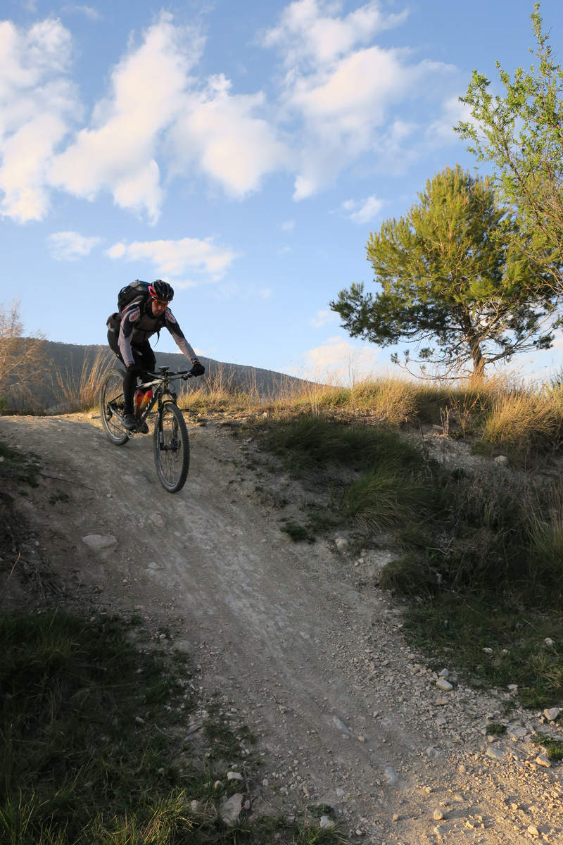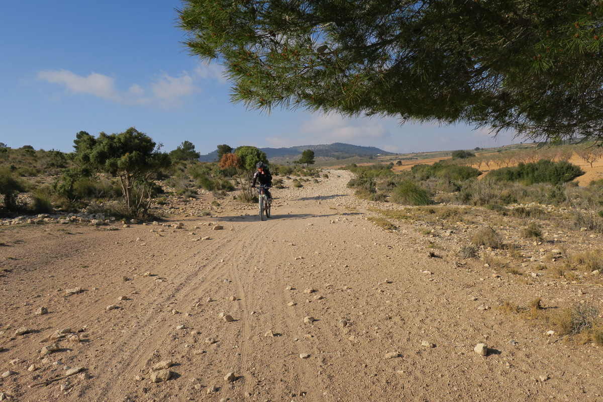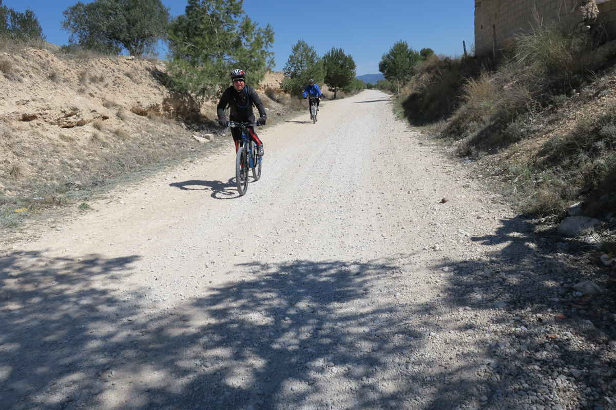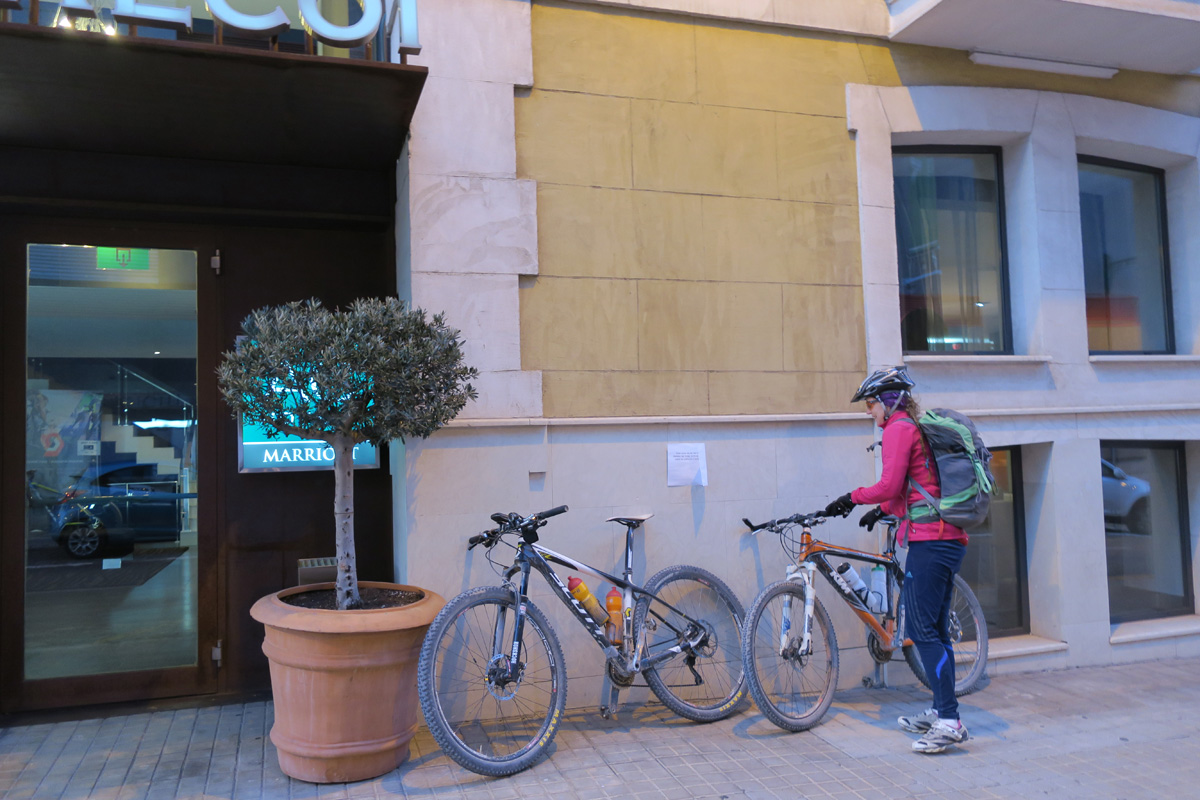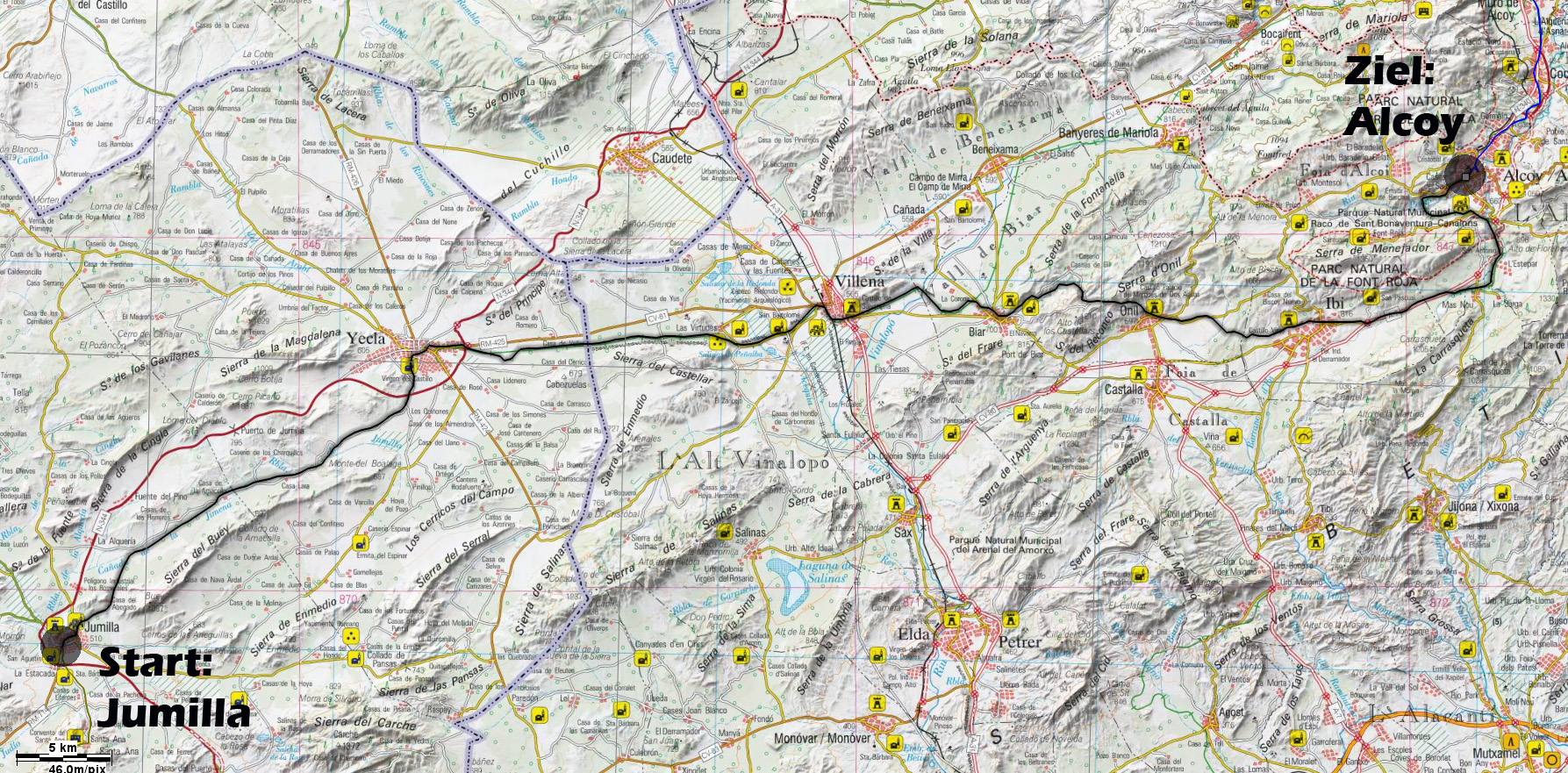 Heute morgen gab es an der Hotelbar um 7.30Uhr ein mäßiges Frühstück. Danach ging es bei Sonnenschein los. Nach dem verlassen der Stadt Jumilla nahmen wir den GR251Fernwanderweg, welcher meistens auf einer schönen Naturstrasse in Richtung Yecla führte. Kurz vor der Ortschaft machten wir noch 100 zusätzliche Höhenmeter hinauf zum Santuario Virgen de Castillo. Die Besichtigung dieser schönen Wallfahrtskirche lohnte sich. Danach ging es durch die Stadt Yecla. Nach dem Industriegebiet folgte dann die Via Verde El Xixarra, ein altes Bahntrasse nach Villena. Mit etwas Rückenwind machte es richtig Spaß diese staubtrockene zum Teil sandige Piste abzufahren. Zwischen Villena und Biar war dann das Trasse teilweise asphaltiert. Um 13 Uhr waren wir dann in Biar, eine schöne Ortschaft mit einem Kastell auf einem Hügel. Hier nahmen wir unser Mittagessen in einem Restaurant am Dorfplatz. Danach folgte nun die biketechnisch interessante Partie des heutigen Tages. Auf staubtrockenen teilweise sandigen Pisten ging es durch die Sierra de Onil. Die Anfahrt nach Onil war dann relativ anspruchsvoll und im unteren Teil nicht komplett fahrbar. Auf einer Nebenstraße ging es dann weiter nach Ibi. Hier entschieden wir uns um 18 Uhr noch auf dem El Magmo Bahntrasse nach Alcoy zu fahren. Im ersten Teil war das Trasse nicht mehr überall vorhanden. Der zweite Teil vor Alcoy mit den vielen Tunnels und Brücken war dann jedoch sehr gut ausgebaut. Bei Sonnenuntergang hatten wir dann das Mariott Hotel in Alcoy erreicht wo wir ein schönes Zimmer bekamen. Zum Abendessen suchten wir ein Spaghetti und Pizza Schuppen auf.