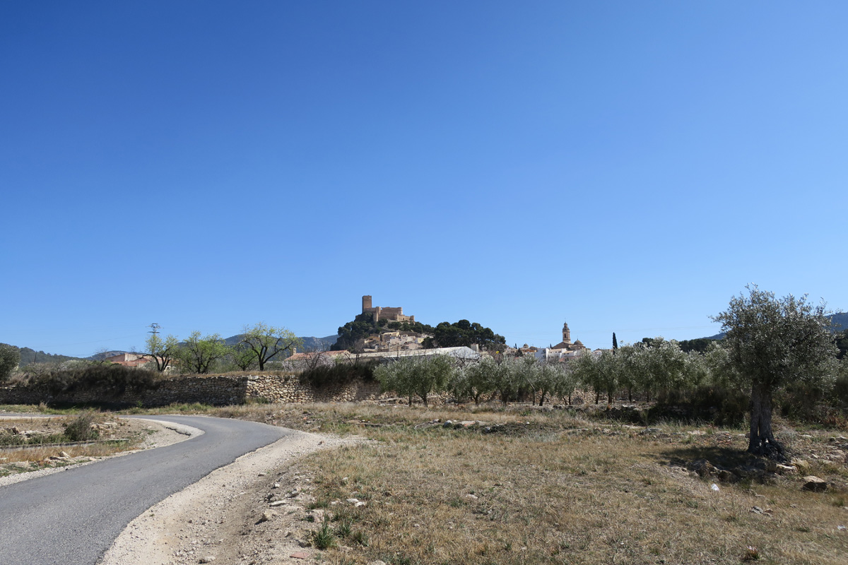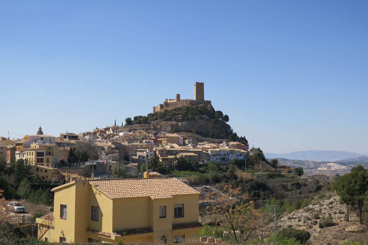 Bahntrasse von Villena nach Biar, Blick auf die Ortschaft Biar mit dem Kastell
