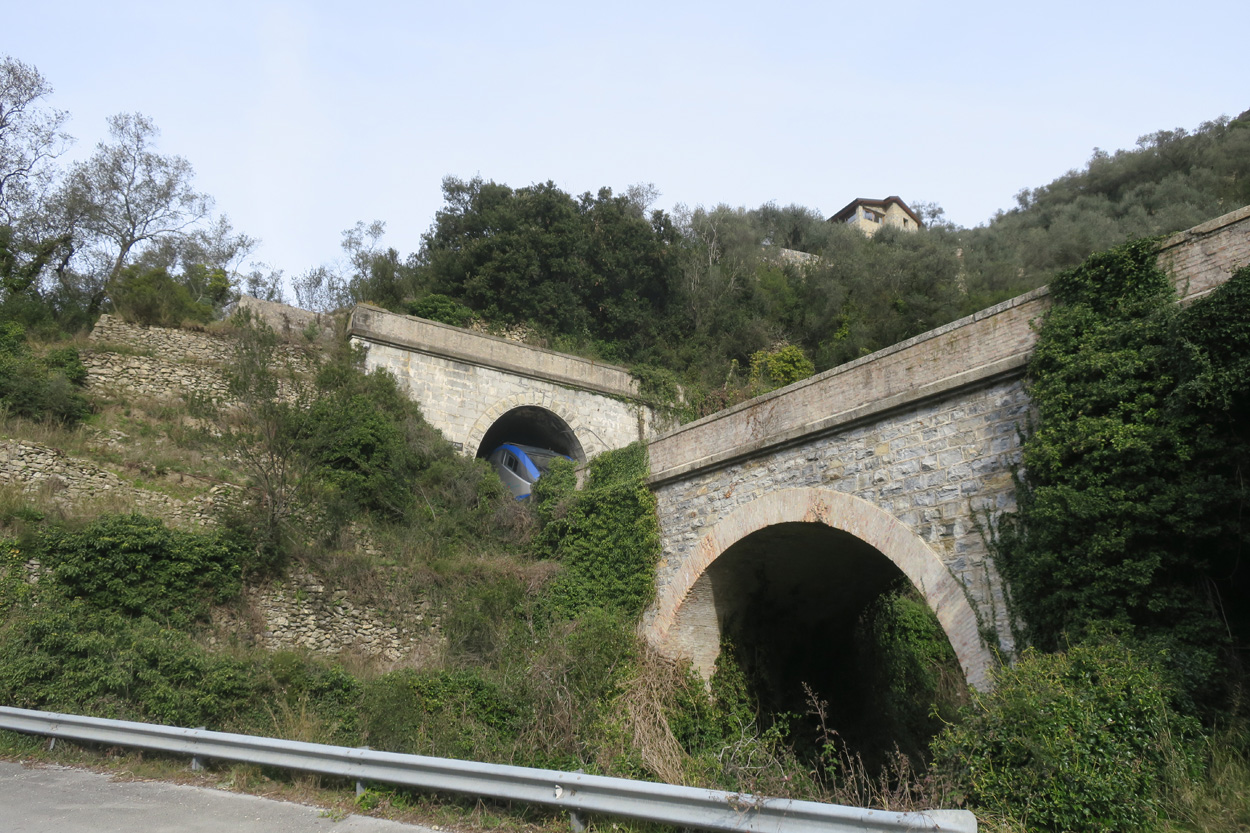 Zug der Tenda Bahn verschwindet im Tunnel bei Airole