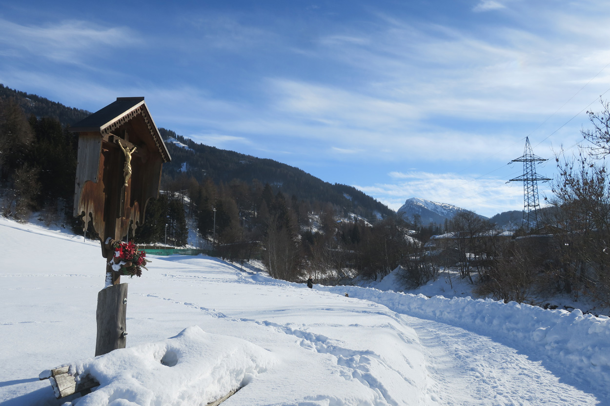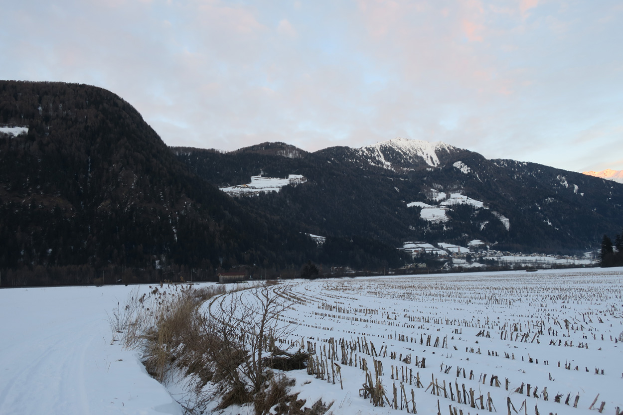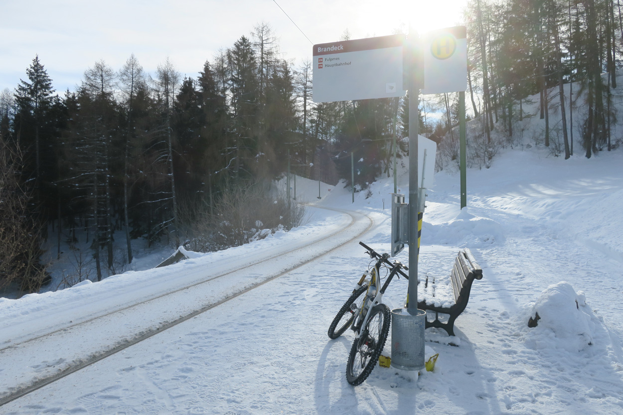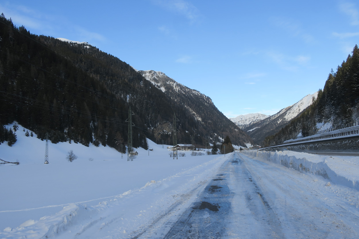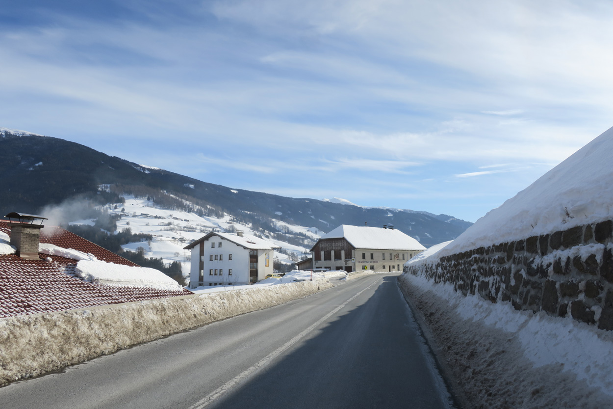 Heute morgen ging es mit dem erst möglichen Zug nach Innsbruck. Schon bei der Anreise durch den Arlberg sah ich, dass zur Zeit extrem viel Schnee liegt. Pünktlich um 10.10Uhr kam ich dann in Innsbruck an. Danach folgte dann bald der Aufstieg beim Bergisel in Richtung Sonnenburgerhof und Natters. Von Natters nach Mutters konnte ich dann dem ersten Schneeschuhtrail folgen. Da es vor einer Woche wohl in den Schnee hineingeregnet hat, waren selbst die Schneeschuhspuren hart genug um darauf fahren zu können. Von Mutters ging es dann auf einem Strässchen zur Kohlstattsiedlung. Von hier an war dann der Fahrweg bis zur Haltestelle Brandegg der Stubaitalbahn, nicht mehr gepfadet. Etliche Fusspuren sorgten jedoch dafür, dass ich trotzdem einen fahrbaren Untergrund hatte. Ab der Haltestelle Brandegg war dann die Bikeroute wieder gepfadet und hatte wenige Autospuren, so dass ich speditiv nach Telfes und Fulpmes kam. In Fulpmes besichtigte ich dann noch kurz die Kirche. In der Kirche fiel mir dann auf dass sich sogar im Weihwasser Eis am bilden war. Die Temperaturen mussten wohl tief unter Null gewesen sein. Auf der Strasse ging es dann nach Matrei am Brenner. Dort folgte ich dann dem Radweg entlang nach Steinach. Auch hier hatte es schneebedeckte aber noch gepfadete Feldwege. In Steinach begann ich dann um 12.45Uhr mit dem Aufstieg nach Nösslach. Leider war dieses Asphaltsträsschen gesalzen. Aber auch so blieb der Schnee liegen. Es war wohl zu kalt, dass das Salz noch Wirkung hatte. Lediglich etwas aufgeweicht war der Schnee. Um 13.30Uhr kehrte ich dann in Aussernösslach auf 1384m im Restaurant des Hotels Hummlerhof ein. Im Angebot war hier noch Wieneschnitzel mit Pommes. Nach dem ich gegessen und mich aufgewärmt hatte ging es gegen 14.30Uhr wieder weiter. Auf der schneebedeckten Straße ging es dann noch 50hm weiter bis Nösslach hinauf. Dort ging es ebenfalls auf der Scheefahrbahn hinunter nach Vinaders. Ab hier waren dann die Strassen zu stark gesalzen und folglich aper. In Gries auf 1150m begann dann noch der Schlussaufstieg auf der Bundesstrasse zum Brennerpass. Etwa um 15.30Uhr überschritt ich dann auf 1370m die Grenze nach Italien. Hier oben war wegen den vielen Shops und Einkaufszentren reger Verkehr und deshalb recht dreckige Luft. Um nach Sterzing zu kommen wollte ich dann den Radweg auf dem Bahntrasse nehmen. Doch der Radweg war nicht geräumt. Es lag etwa ein Meter Schnee drauf. So war die einzige Möglichkeit die Hauptstrasse. Um 16.20 Uhr erreichte ich dann das schöne Städtchen Sterzing. Auch hier war es immer noch bitter kalt. Sogar so kalt, dass sich die Apfelschorle im Bidon vom flüssigen in den festen Zustand verwandelt hatte. Aber irgendwie hatte ich das Gefühl dass es noch etwas zu früh sei un ein Hotel zu nehmen. Deshalb ging es dann auf dem Radweg und einem nicht gepfadeten Feldweg nach Stilfes. Der nicht gepfadete Feldweg war gerade noch fahrbar, aber recht anstrengend. Kurz nach Sonnenuntergang war ich dann in Stilfes. Hier war das Hotel leider wegen Umbau geschlossen. Aber einen Kilometer weiter in Freienfeld gab es dann noch im Hotel Lener ein Zimmer mit ausgezeichneter Halbpension und einer Pizza als Hauptgang.