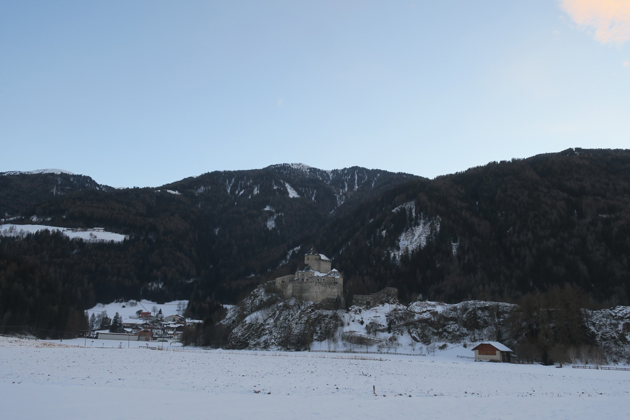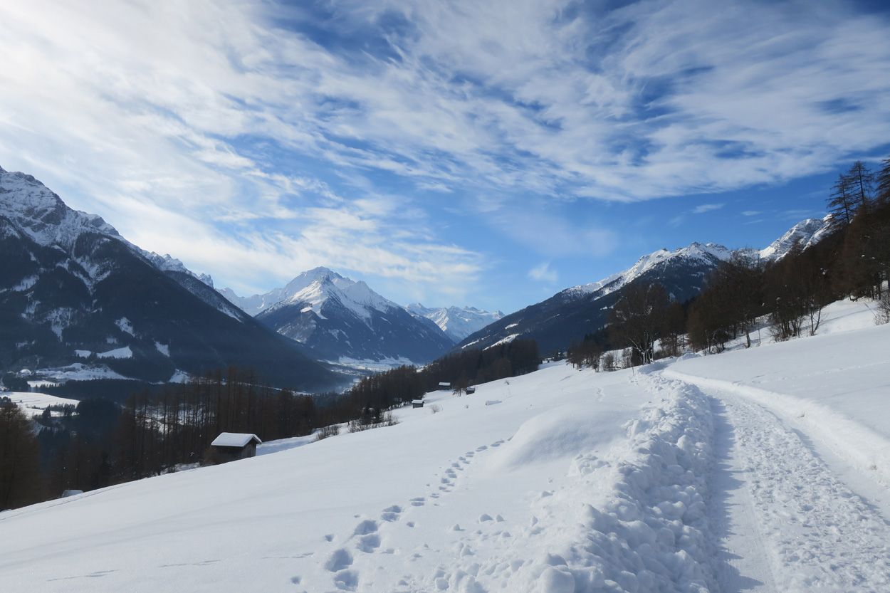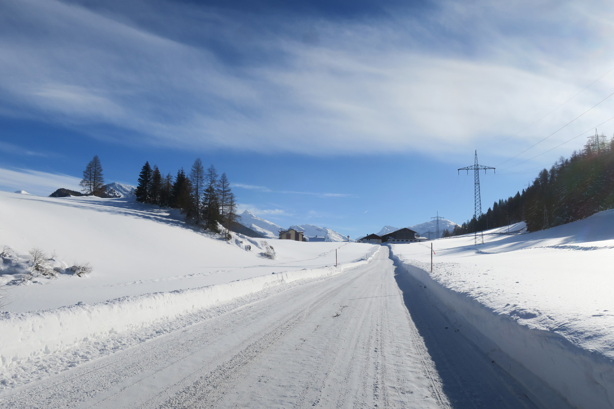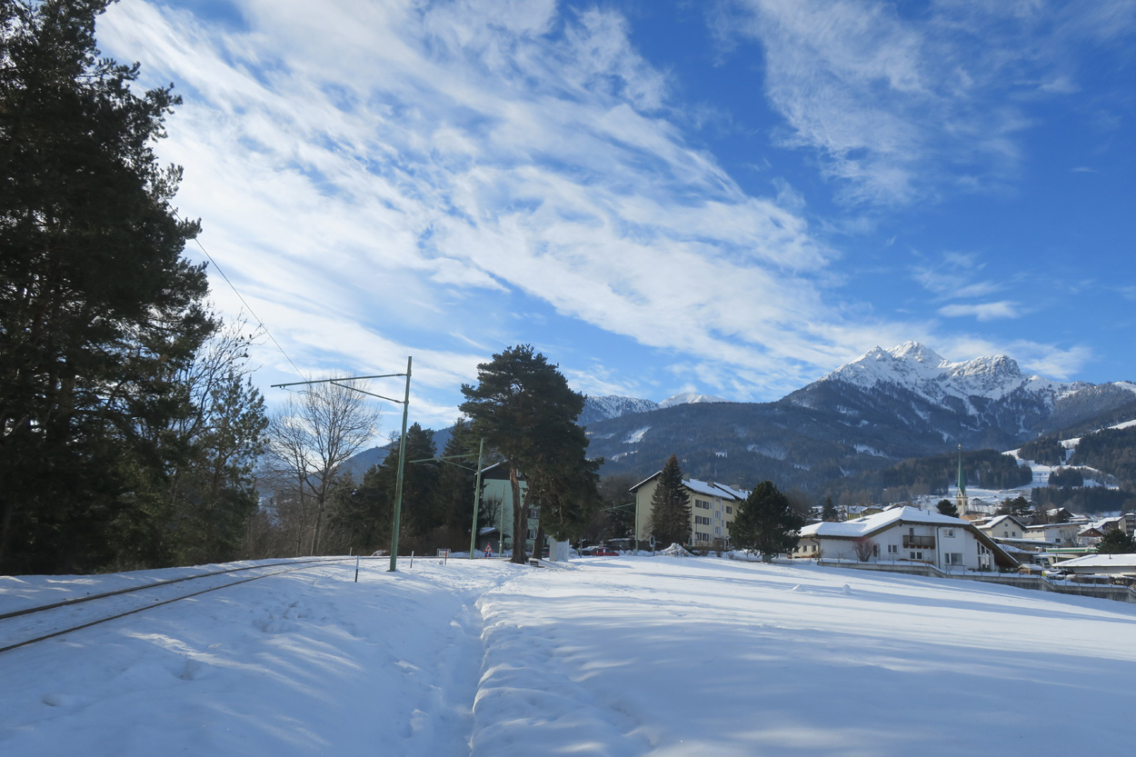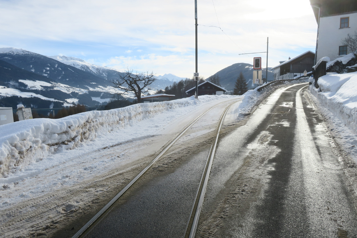 Heute morgen ging es mit dem erst möglichen Zug nach Innsbruck. Schon bei der Anreise durch den Arlberg sah ich, dass zur Zeit extrem viel Schnee liegt. Pünktlich um 10.10Uhr kam ich dann in Innsbruck an. Danach folgte dann bald der Aufstieg beim Bergisel in Richtung Sonnenburgerhof und Natters. Von Natters nach Mutters konnte ich dann dem ersten Schneeschuhtrail folgen. Da es vor einer Woche wohl in den Schnee hineingeregnet hat, waren selbst die Schneeschuhspuren hart genug um darauf fahren zu können. Von Mutters ging es dann auf einem Strässchen zur Kohlstattsiedlung. Von hier an war dann der Fahrweg bis zur Haltestelle Brandegg der Stubaitalbahn, nicht mehr gepfadet. Etliche Fusspuren sorgten jedoch dafür, dass ich trotzdem einen fahrbaren Untergrund hatte. Ab der Haltestelle Brandegg war dann die Bikeroute wieder gepfadet und hatte wenige Autospuren, so dass ich speditiv nach Telfes und Fulpmes kam. In Fulpmes besichtigte ich dann noch kurz die Kirche. In der Kirche fiel mir dann auf dass sich sogar im Weihwasser Eis am bilden war. Die Temperaturen mussten wohl tief unter Null gewesen sein. Auf der Strasse ging es dann nach Matrei am Brenner. Dort folgte ich dann dem Radweg entlang nach Steinach. Auch hier hatte es schneebedeckte aber noch gepfadete Feldwege. In Steinach begann ich dann um 12.45Uhr mit dem Aufstieg nach Nösslach. Leider war dieses Asphaltsträsschen gesalzen. Aber auch so blieb der Schnee liegen. Es war wohl zu kalt, dass das Salz noch Wirkung hatte. Lediglich etwas aufgeweicht war der Schnee. Um 13.30Uhr kehrte ich dann in Aussernösslach auf 1384m im Restaurant des Hotels Hummlerhof ein. Im Angebot war hier noch Wieneschnitzel mit Pommes. Nach dem ich gegessen und mich aufgewärmt hatte ging es gegen 14.30Uhr wieder weiter. Auf der schneebedeckten Straße ging es dann noch 50hm weiter bis Nösslach hinauf. Dort ging es ebenfalls auf der Scheefahrbahn hinunter nach Vinaders. Ab hier waren dann die Strassen zu stark gesalzen und folglich aper. In Gries auf 1150m begann dann noch der Schlussaufstieg auf der Bundesstrasse zum Brennerpass. Etwa um 15.30Uhr überschritt ich dann auf 1370m die Grenze nach Italien. Hier oben war wegen den vielen Shops und Einkaufszentren reger Verkehr und deshalb recht dreckige Luft. Um nach Sterzing zu kommen wollte ich dann den Radweg auf dem Bahntrasse nehmen. Doch der Radweg war nicht geräumt. Es lag etwa ein Meter Schnee drauf. So war die einzige Möglichkeit die Hauptstrasse. Um 16.20 Uhr erreichte ich dann das schöne Städtchen Sterzing. Auch hier war es immer noch bitter kalt. Sogar so kalt, dass sich die Apfelschorle im Bidon vom flüssigen in den festen Zustand verwandelt hatte. Aber irgendwie hatte ich das Gefühl dass es noch etwas zu früh sei un ein Hotel zu nehmen. Deshalb ging es dann auf dem Radweg und einem nicht gepfadeten Feldweg nach Stilfes. Der nicht gepfadete Feldweg war gerade noch fahrbar, aber recht anstrengend. Kurz nach Sonnenuntergang war ich dann in Stilfes. Hier war das Hotel leider wegen Umbau geschlossen. Aber einen Kilometer weiter in Freienfeld gab es dann noch im Hotel Lener ein Zimmer mit ausgezeichneter Halbpension und einer Pizza als Hauptgang.