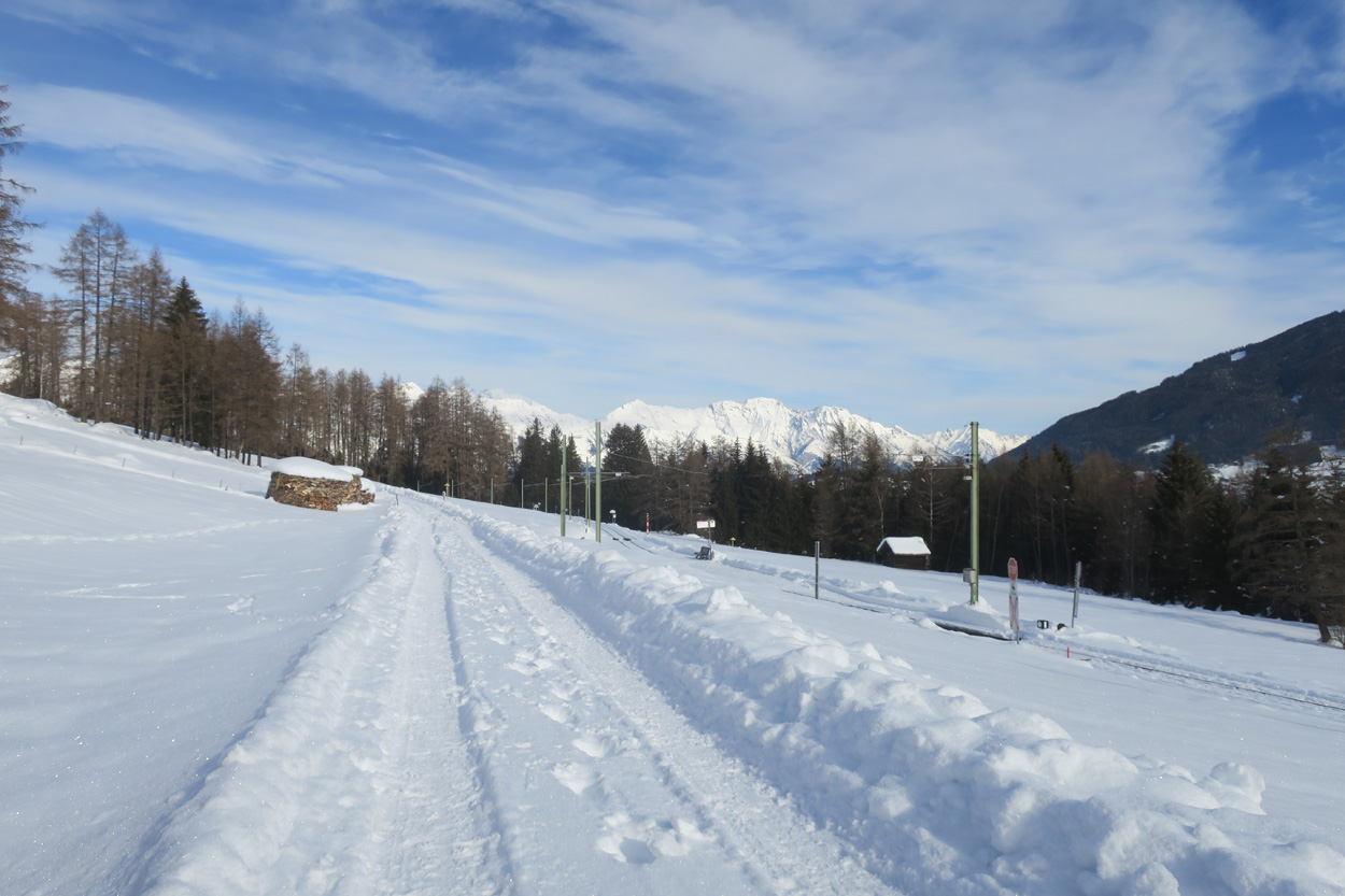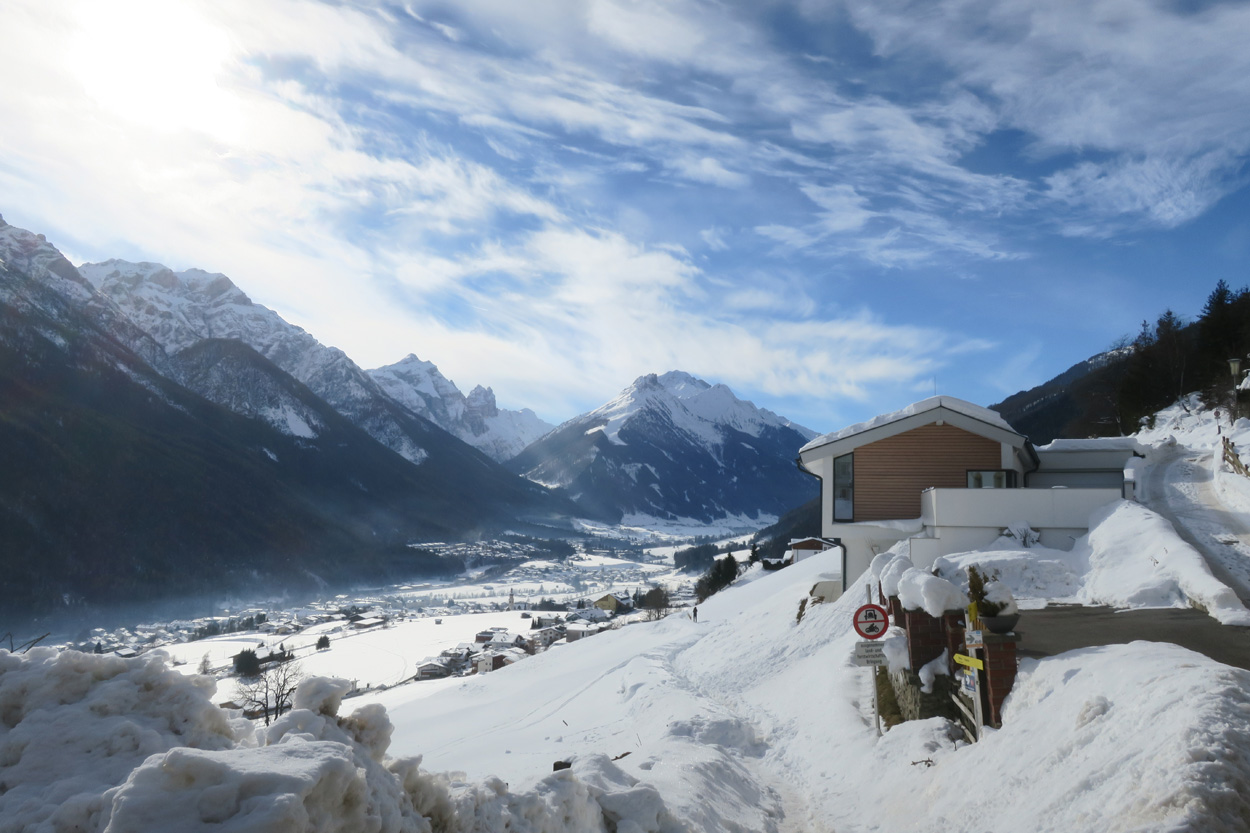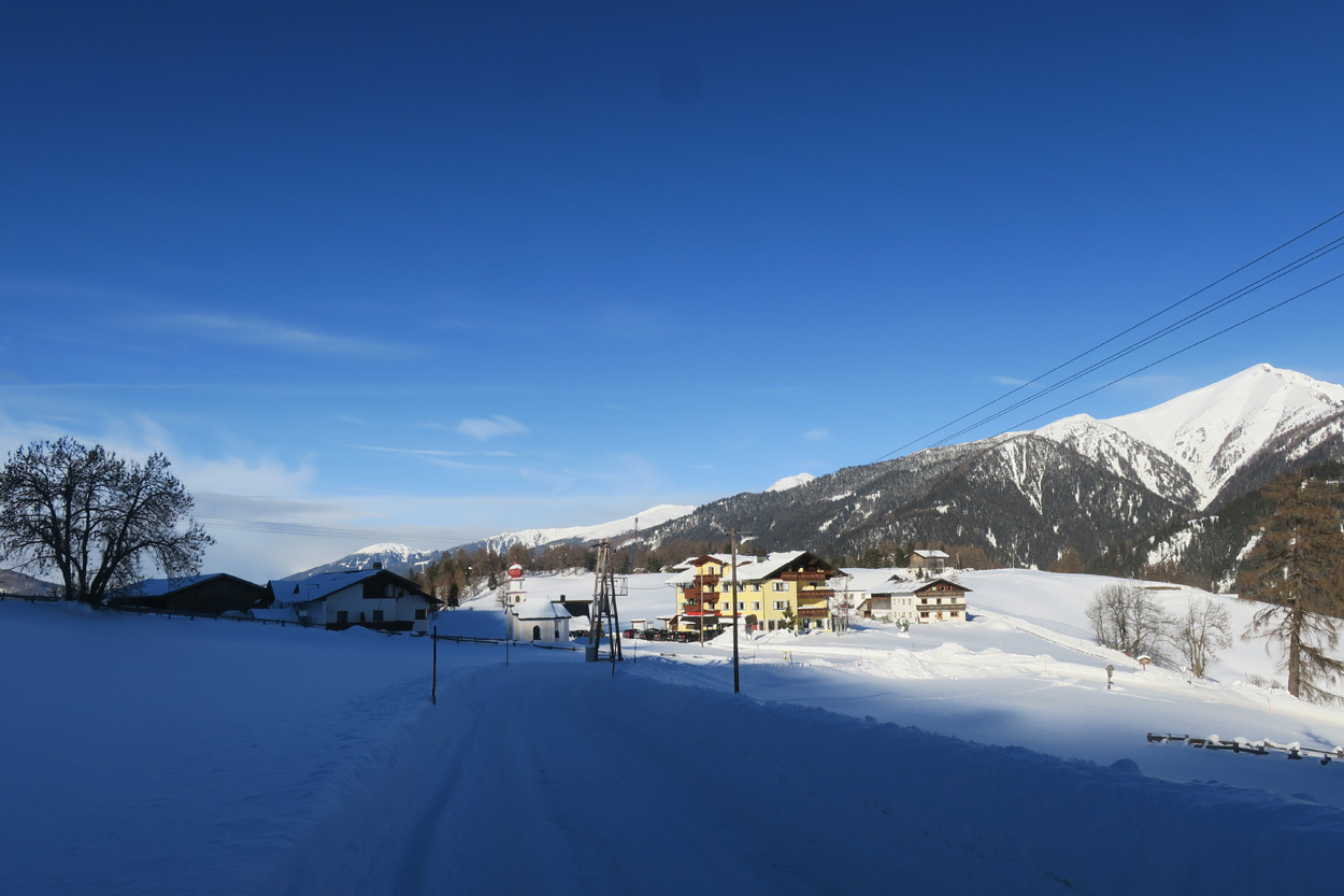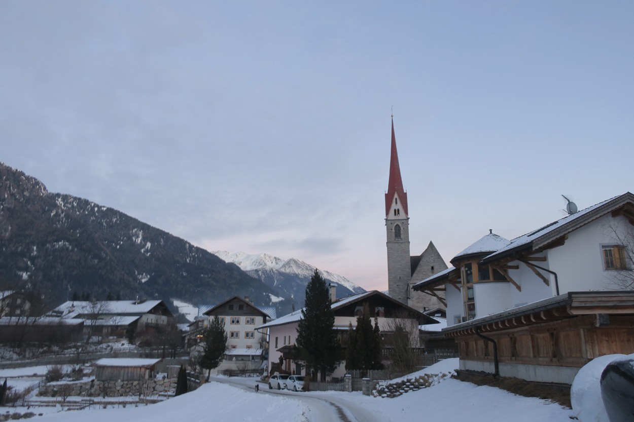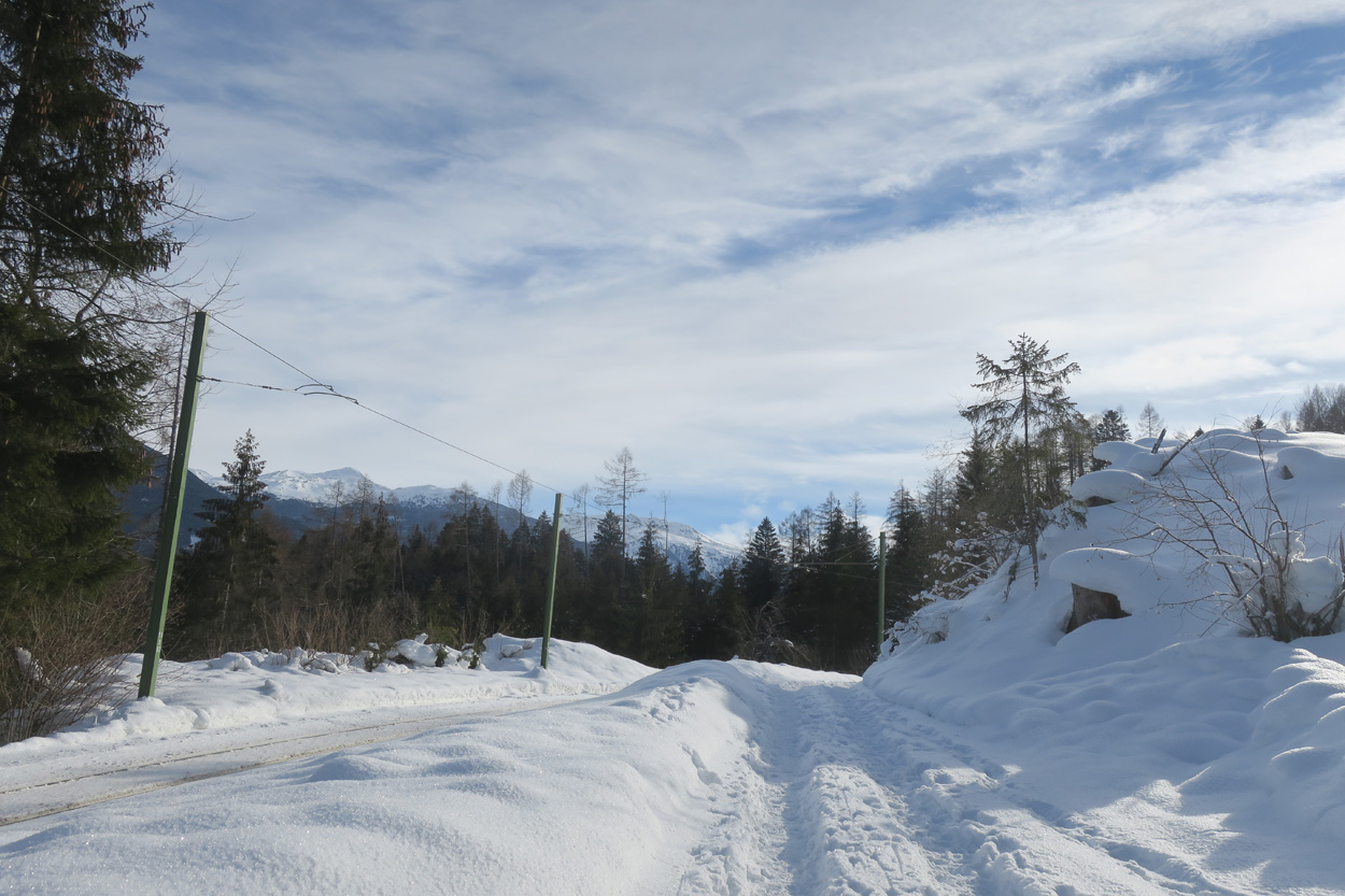 Heute morgen ging es mit dem erst möglichen Zug nach Innsbruck. Schon bei der Anreise durch den Arlberg sah ich, dass zur Zeit extrem viel Schnee liegt. Pünktlich um 10.10Uhr kam ich dann in Innsbruck an. Danach folgte dann bald der Aufstieg beim Bergisel in Richtung Sonnenburgerhof und Natters. Von Natters nach Mutters konnte ich dann dem ersten Schneeschuhtrail folgen. Da es vor einer Woche wohl in den Schnee hineingeregnet hat, waren selbst die Schneeschuhspuren hart genug um darauf fahren zu können. Von Mutters ging es dann auf einem Strässchen zur Kohlstattsiedlung. Von hier an war dann der Fahrweg bis zur Haltestelle Brandegg der Stubaitalbahn, nicht mehr gepfadet. Etliche Fusspuren sorgten jedoch dafür, dass ich trotzdem einen fahrbaren Untergrund hatte. Ab der Haltestelle Brandegg war dann die Bikeroute wieder gepfadet und hatte wenige Autospuren, so dass ich speditiv nach Telfes und Fulpmes kam. In Fulpmes besichtigte ich dann noch kurz die Kirche. In der Kirche fiel mir dann auf dass sich sogar im Weihwasser Eis am bilden war. Die Temperaturen mussten wohl tief unter Null gewesen sein. Auf der Strasse ging es dann nach Matrei am Brenner. Dort folgte ich dann dem Radweg entlang nach Steinach. Auch hier hatte es schneebedeckte aber noch gepfadete Feldwege. In Steinach begann ich dann um 12.45Uhr mit dem Aufstieg nach Nösslach. Leider war dieses Asphaltsträsschen gesalzen. Aber auch so blieb der Schnee liegen. Es war wohl zu kalt, dass das Salz noch Wirkung hatte. Lediglich etwas aufgeweicht war der Schnee. Um 13.30Uhr kehrte ich dann in Aussernösslach auf 1384m im Restaurant des Hotels Hummlerhof ein. Im Angebot war hier noch Wieneschnitzel mit Pommes. Nach dem ich gegessen und mich aufgewärmt hatte ging es gegen 14.30Uhr wieder weiter. Auf der schneebedeckten Straße ging es dann noch 50hm weiter bis Nösslach hinauf. Dort ging es ebenfalls auf der Scheefahrbahn hinunter nach Vinaders. Ab hier waren dann die Strassen zu stark gesalzen und folglich aper. In Gries auf 1150m begann dann noch der Schlussaufstieg auf der Bundesstrasse zum Brennerpass. Etwa um 15.30Uhr überschritt ich dann auf 1370m die Grenze nach Italien. Hier oben war wegen den vielen Shops und Einkaufszentren reger Verkehr und deshalb recht dreckige Luft. Um nach Sterzing zu kommen wollte ich dann den Radweg auf dem Bahntrasse nehmen. Doch der Radweg war nicht geräumt. Es lag etwa ein Meter Schnee drauf. So war die einzige Möglichkeit die Hauptstrasse. Um 16.20 Uhr erreichte ich dann das schöne Städtchen Sterzing. Auch hier war es immer noch bitter kalt. Sogar so kalt, dass sich die Apfelschorle im Bidon vom flüssigen in den festen Zustand verwandelt hatte. Aber irgendwie hatte ich das Gefühl dass es noch etwas zu früh sei un ein Hotel zu nehmen. Deshalb ging es dann auf dem Radweg und einem nicht gepfadeten Feldweg nach Stilfes. Der nicht gepfadete Feldweg war gerade noch fahrbar, aber recht anstrengend. Kurz nach Sonnenuntergang war ich dann in Stilfes. Hier war das Hotel leider wegen Umbau geschlossen. Aber einen Kilometer weiter in Freienfeld gab es dann noch im Hotel Lener ein Zimmer mit ausgezeichneter Halbpension und einer Pizza als Hauptgang.